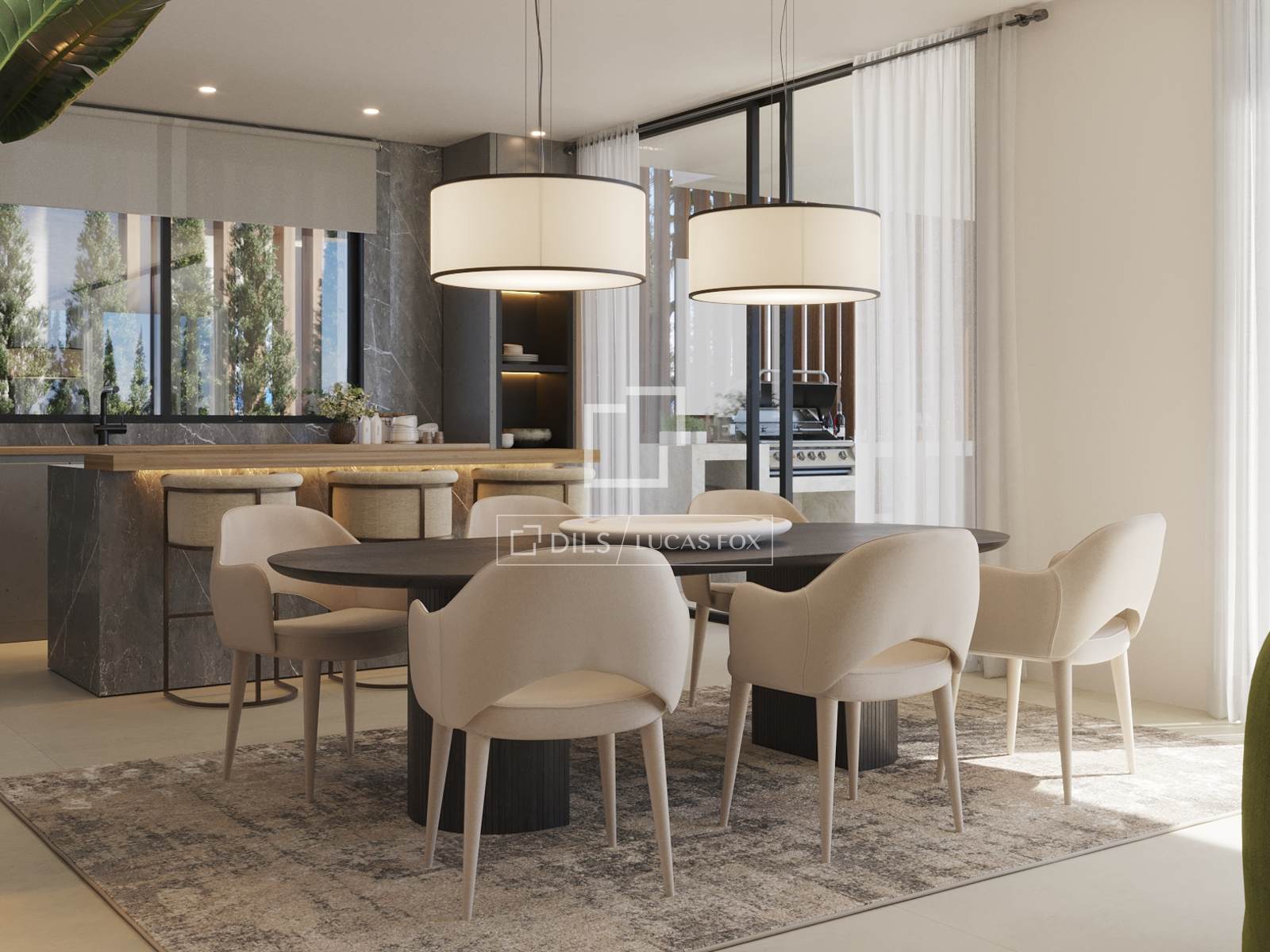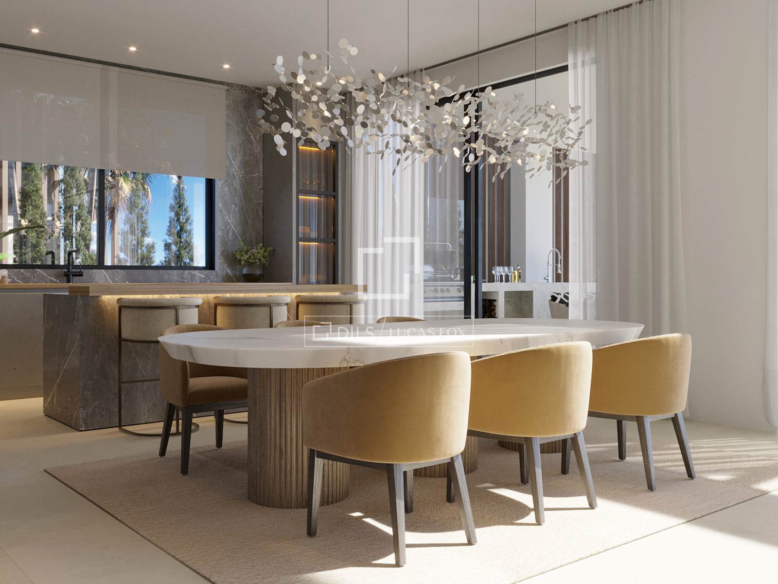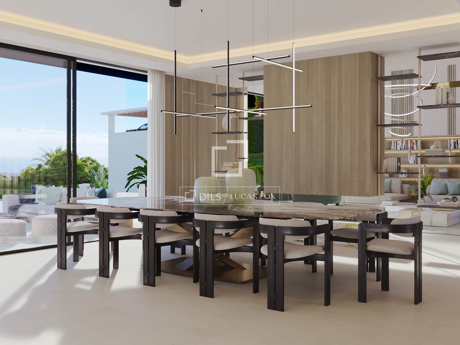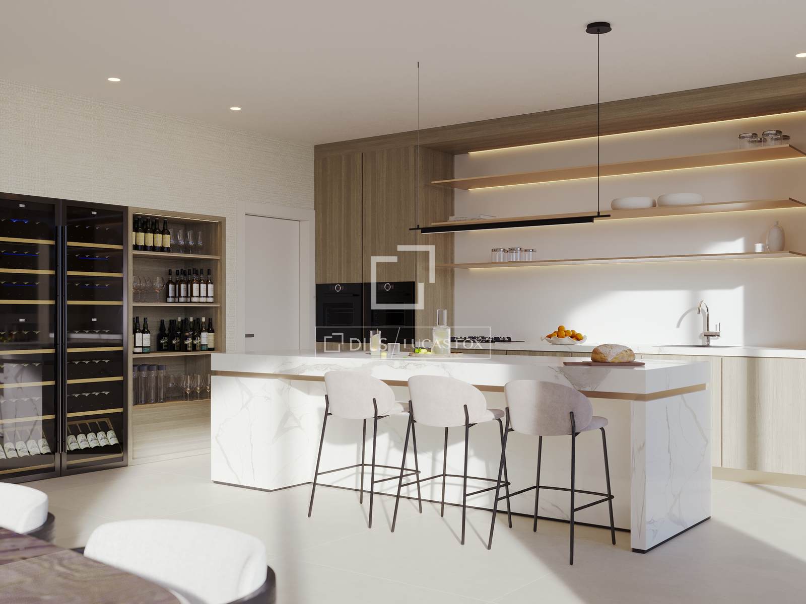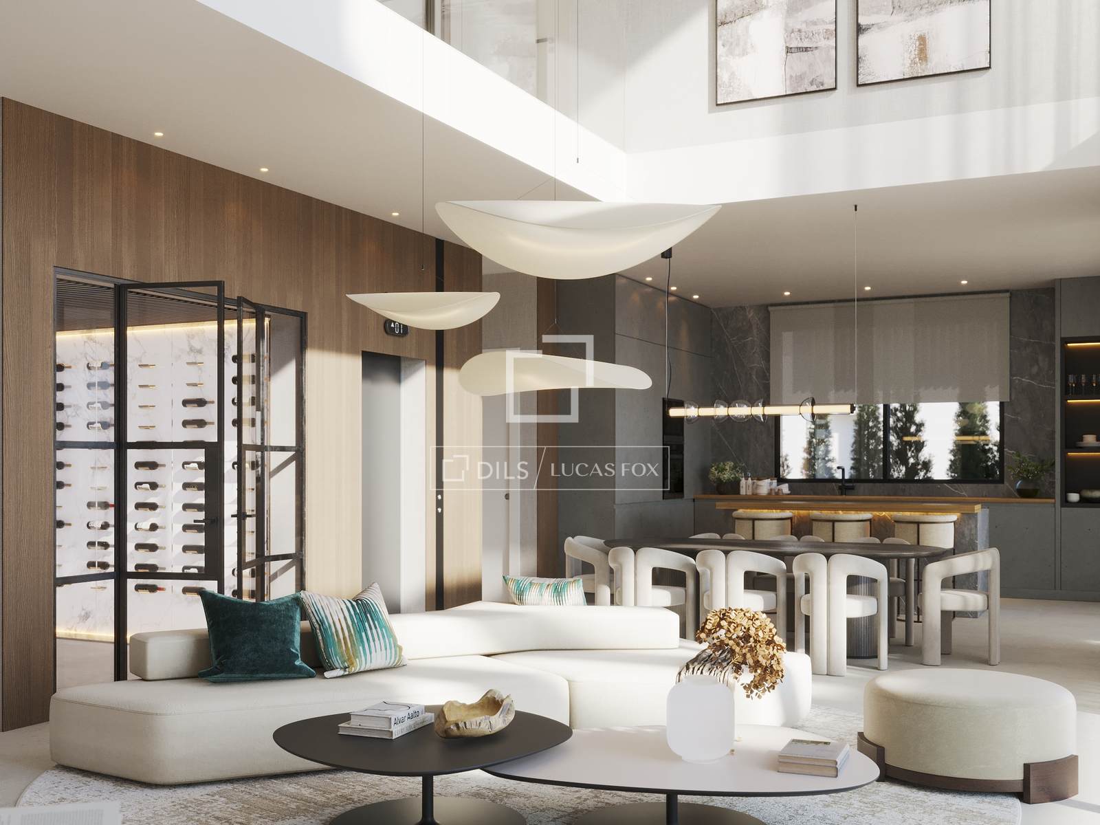 The architectural concept draws inspiration from the meeting point between sea and sky. Clean lines, natural tones and carefully selected materials define the exterior presence, while the interior spaces are designed to maximize light and openness. Floor-to-ceiling windows and double-height living areas allow sunlight to move naturally throughout the day, enhancing the sense of space and continuity.