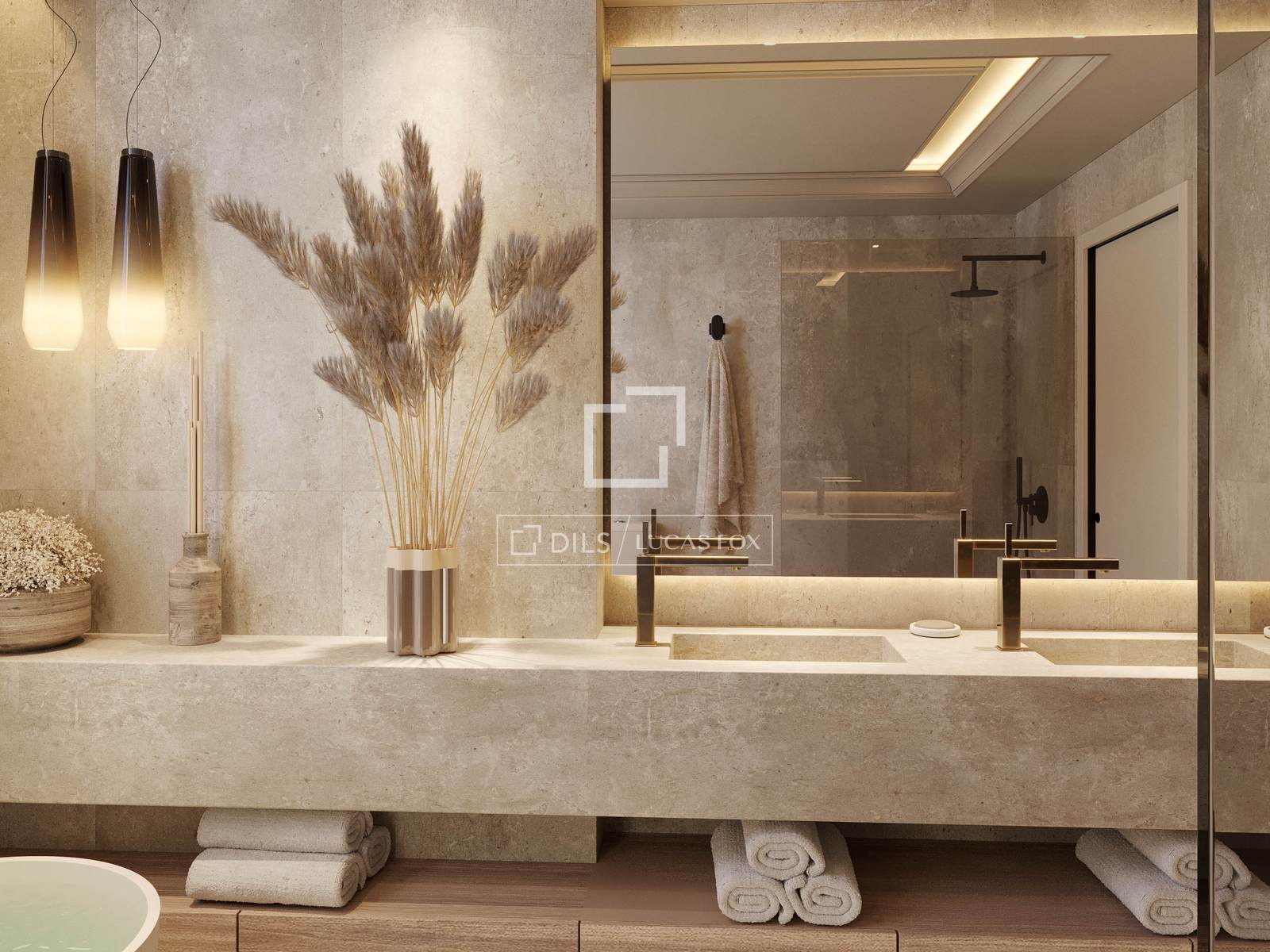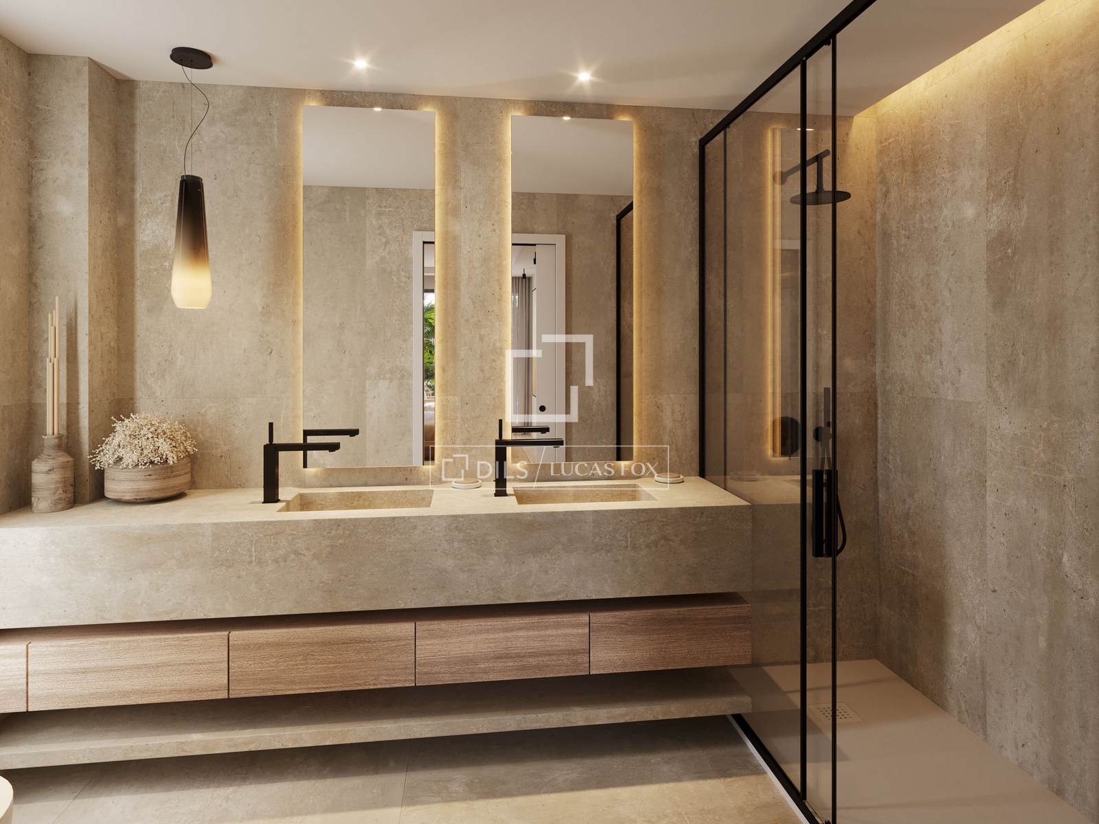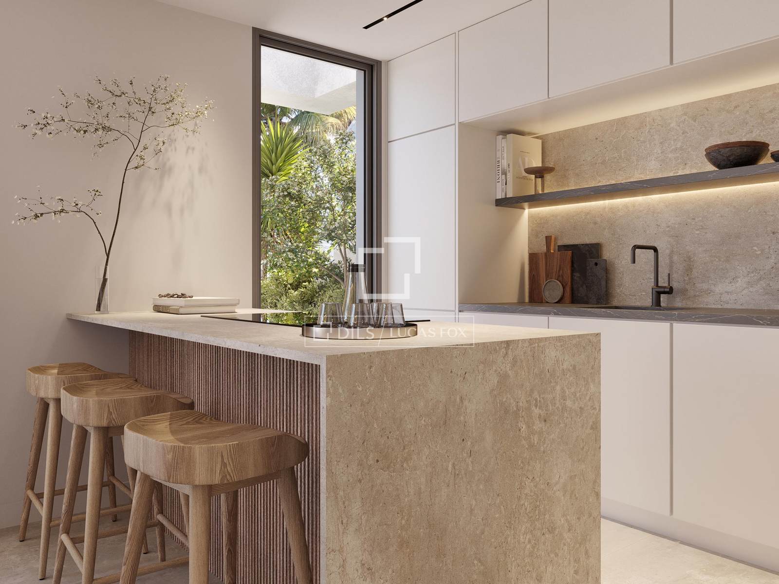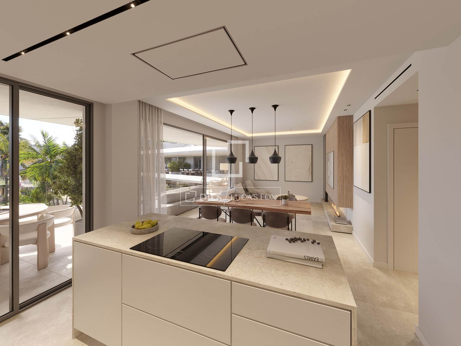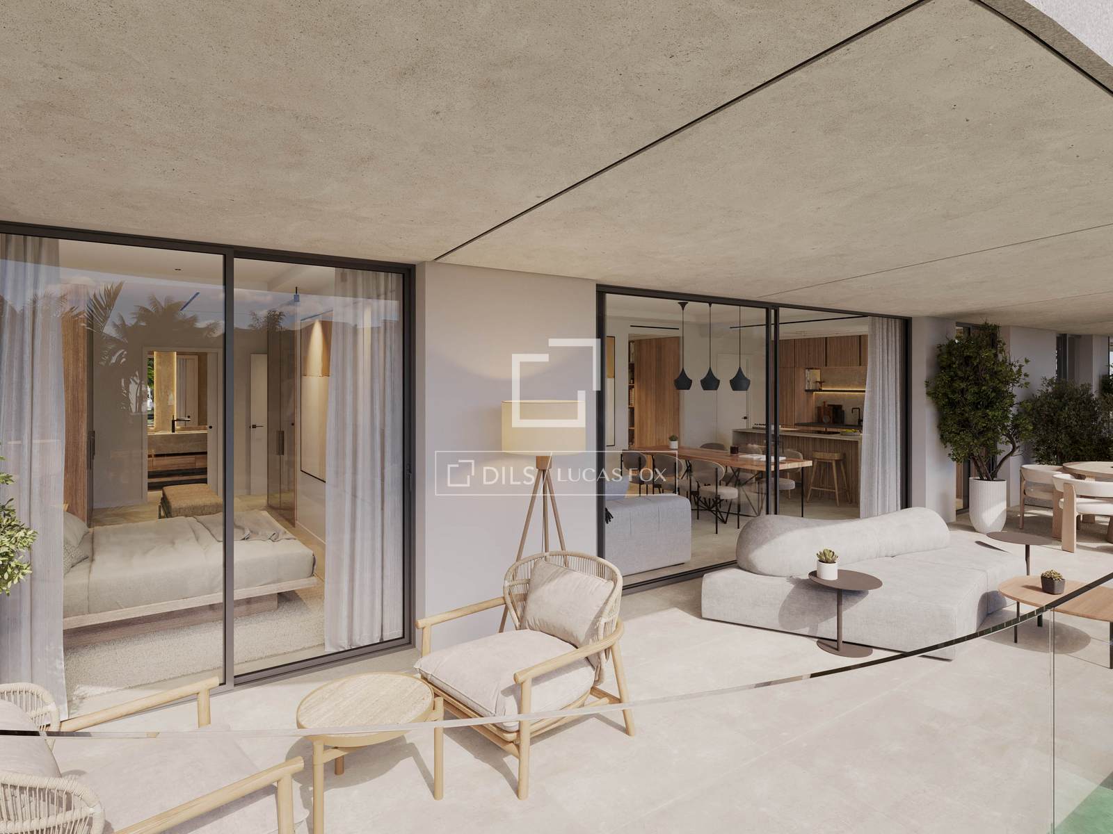 The properties range from one to four bedrooms, with carefully planned interiors that emphasise proportion and practicality. Large-format porcelain flooring runs throughout, and floor-to-ceiling glazing connects the living areas with terraces or private gardens. Ground-floor corner units benefit from wrap-around gardens and their own swimming pool. Penthouses include spacious solariums, rooftop pools and open views towards the sea, with the possibility of incorporating an outdoor kitchen.