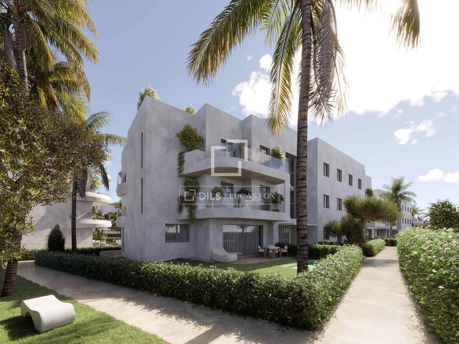 The architecture blends clean, modern lines with Mediterranean influences. Curved terraces and landscaped surroundings soften the structure, while the orientation of each block allows for optimal sunlight throughout the day. The overall layout ensures a sense of space, with generous outdoor areas integrated into every home.