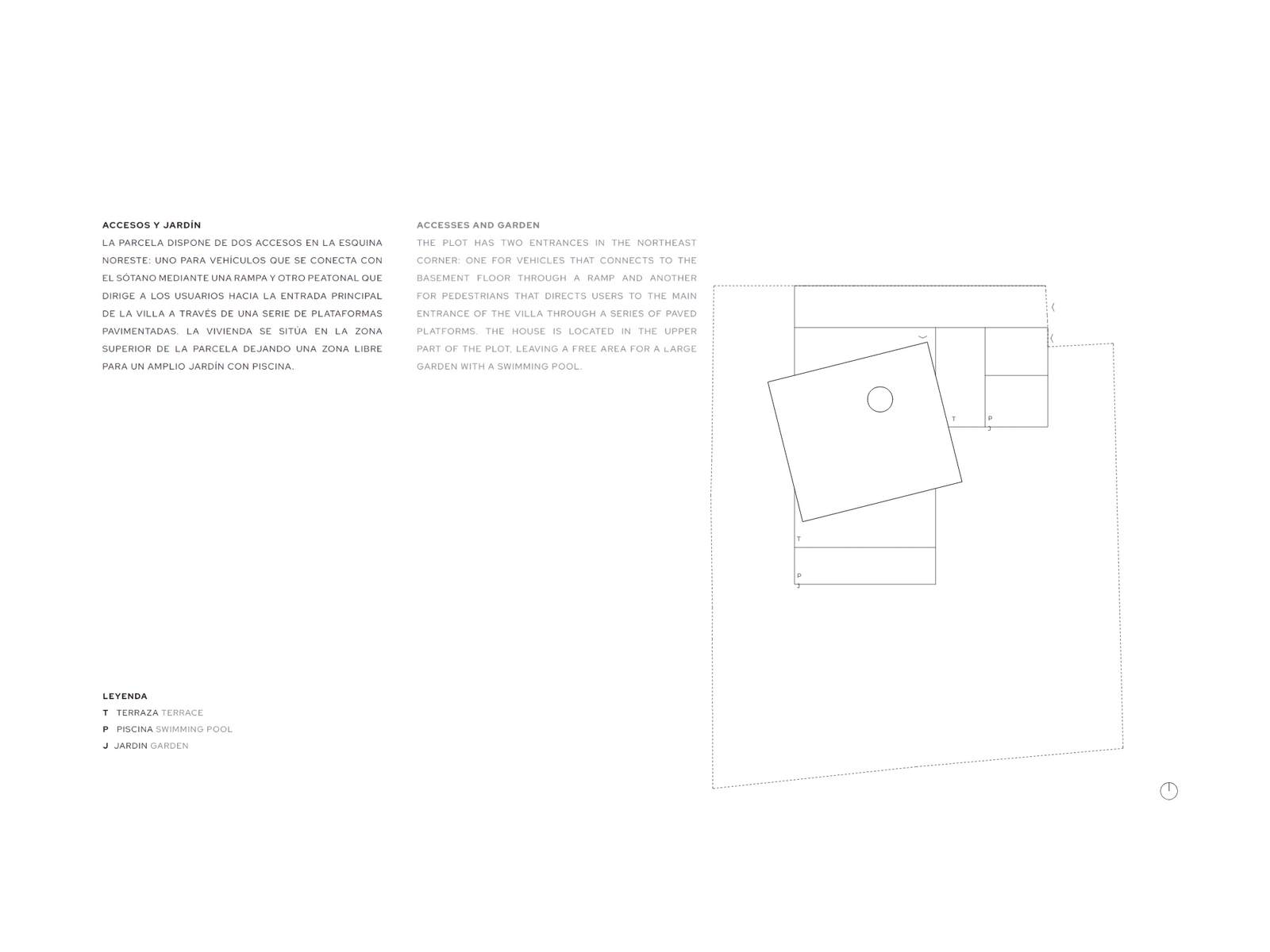 The plot has two entrances: one for vehicles that connects to the basement via a ramp, and another for pedestrians that connects to the main entrance via a series of paved platforms. The south-facing property is located on the upper part of the plot, leaving an open area for a large garden with a pool.