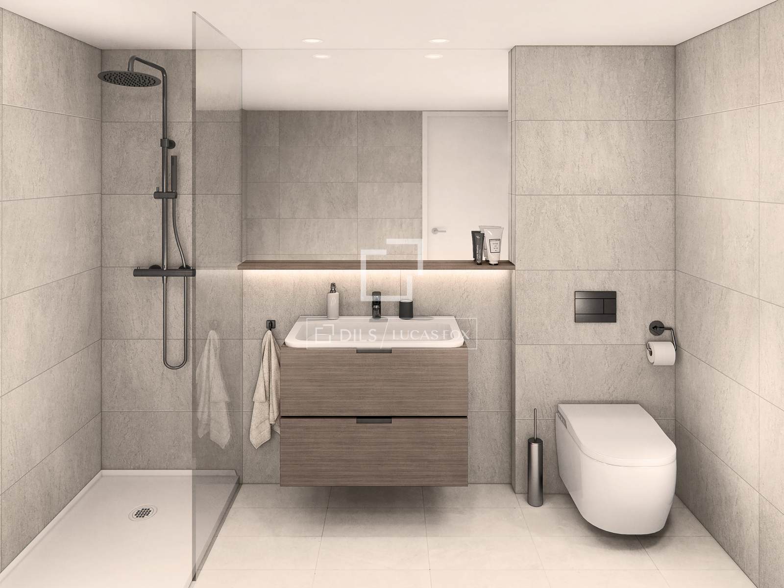 The kitchen comes fully equipped with high-quality wall and base cabinets, a porcelain countertop, a stainless steel sink, chrome mixer taps, and appliances: a ceramic hob, extractor hood with filters, and an oven. The bathroom also features high-quality, modern design, including a wall-hung toilet, a thermostatic rainfall shower, and a backlit anti-steam mirror.