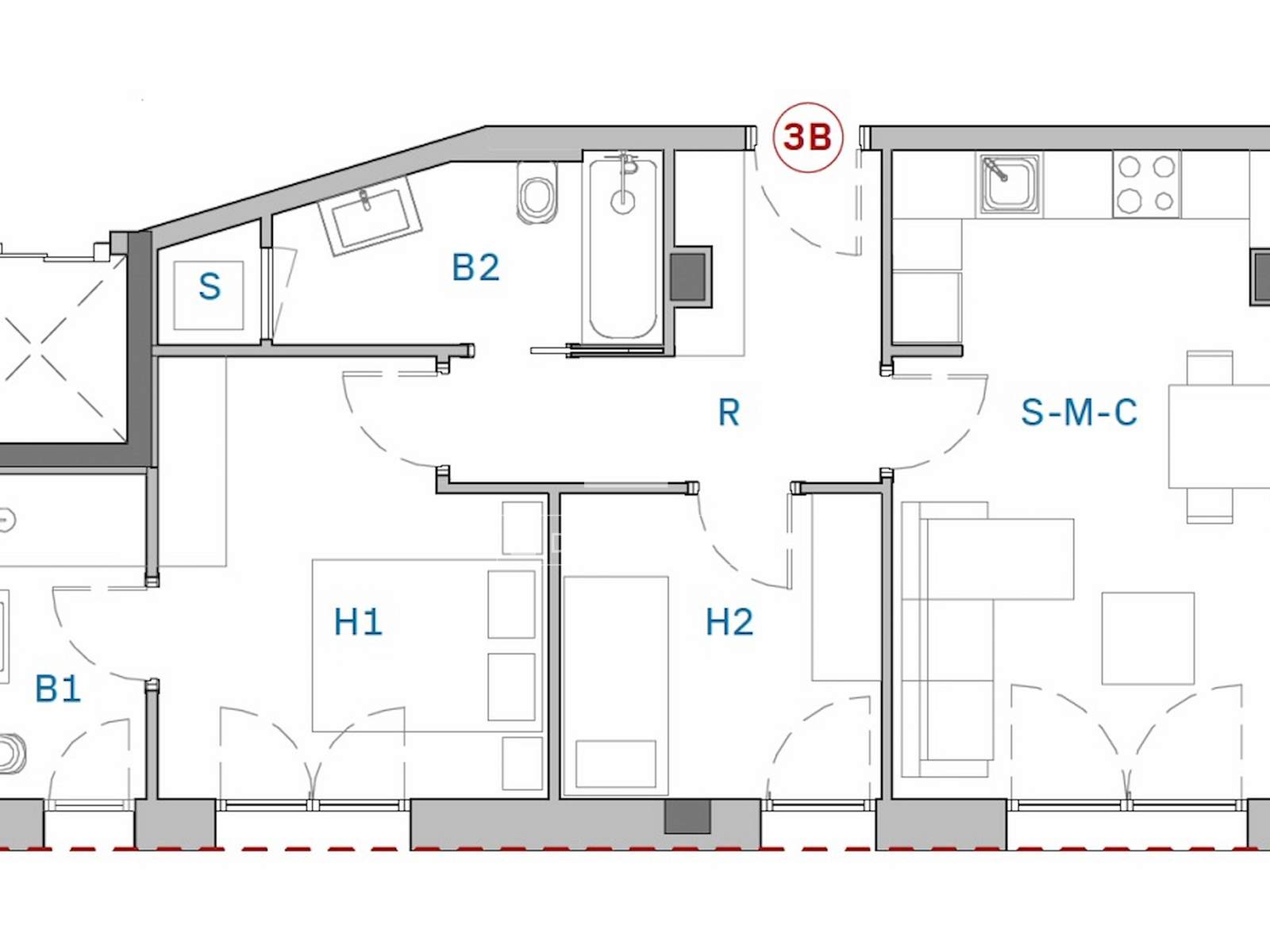 This 72 m² apartment boasts a space-saving design with an open-plan layout that receives plenty of natural light and pleasant views of the surrounding area. The day area houses a spacious living-dining room with an open-plan kitchen and access to a 10 m² terrace. The night area offers a bedroom with its own private bathroom, a single bedroom , and a bathroom to serve the entire property. Both bedrooms also have access to the terrace.
