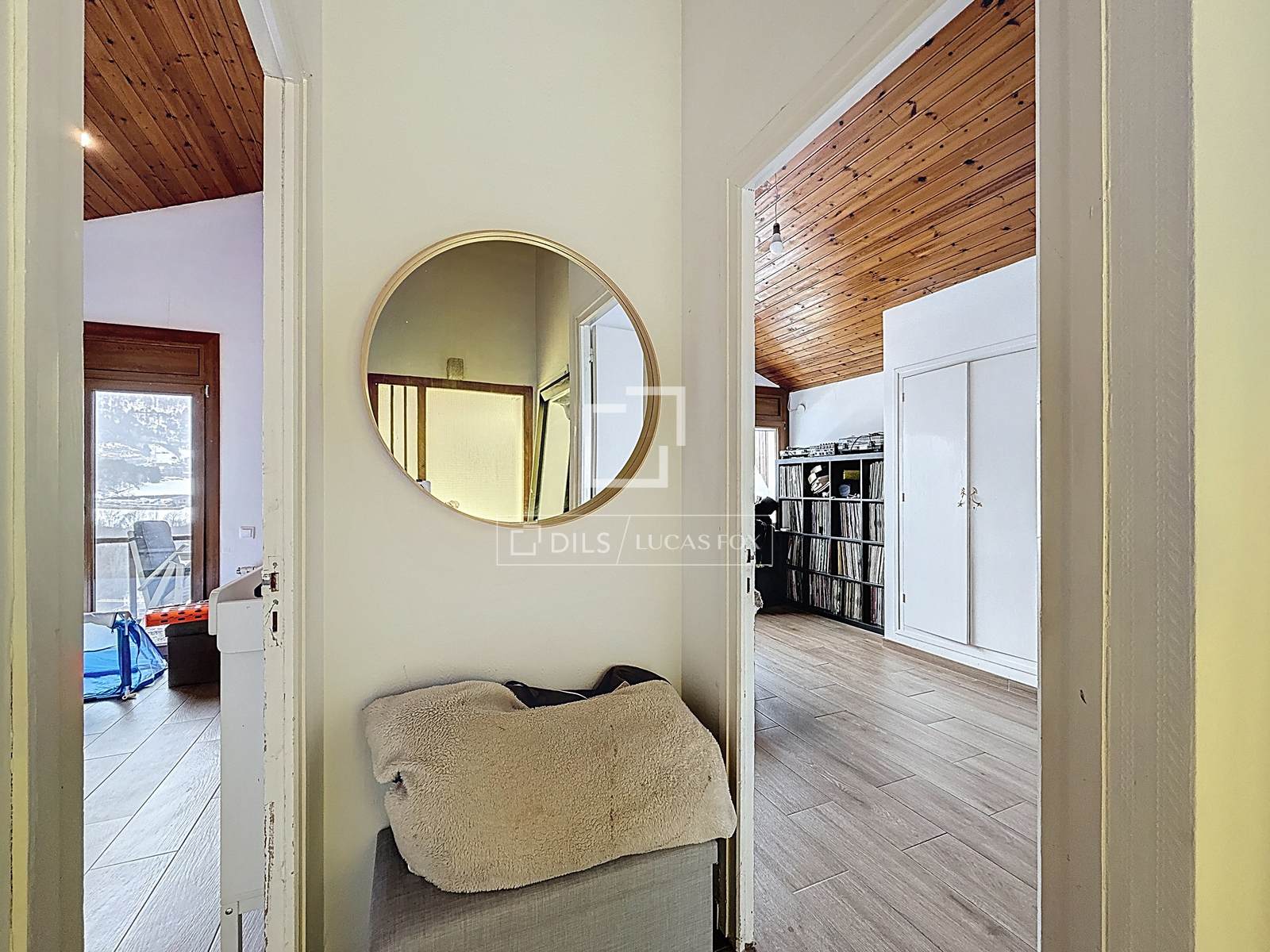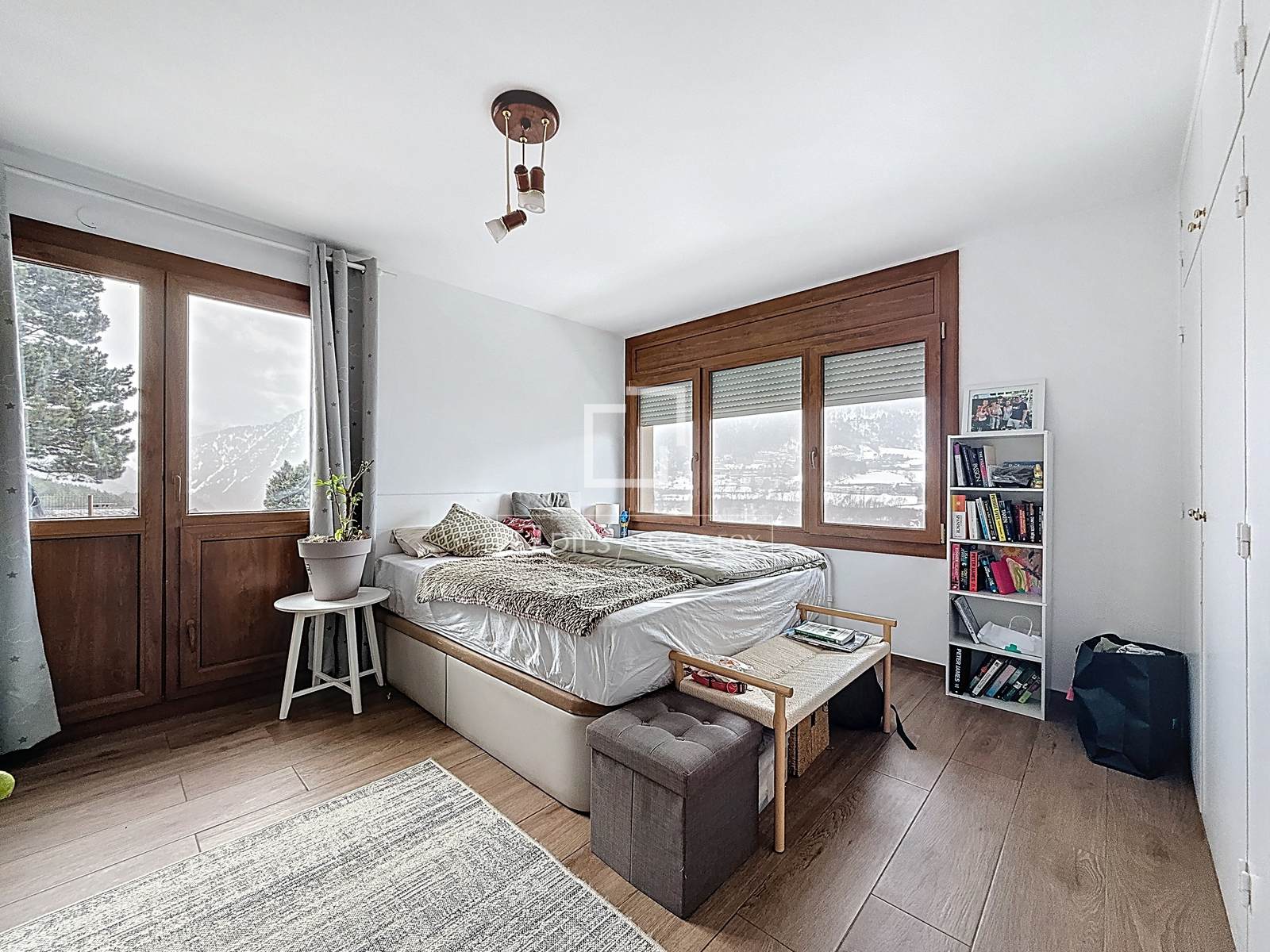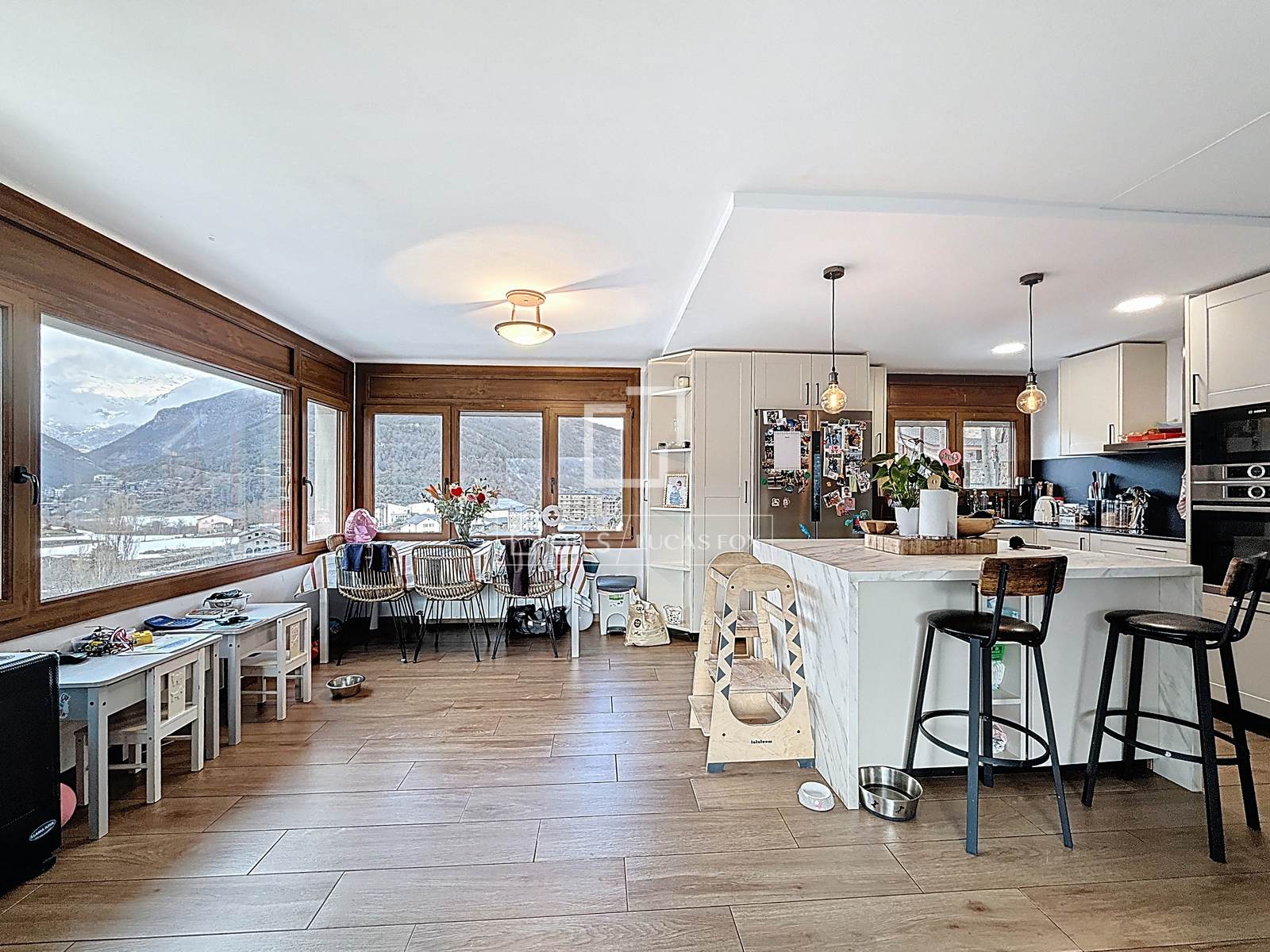 In the day area, we find a bright, fully equipped open-plan kitchen with a central island, which flows seamlessly into the inviting living-dining room with a fireplace. This entire space benefits from large windows that provide abundant natural light and offer magnificent views of the surrounding mountains. A full bathroom completes this area.