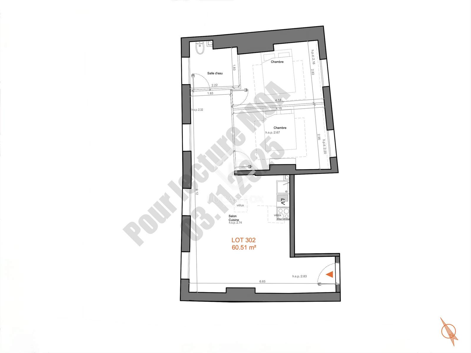 The 60.51 m² space is designed to run from east to west and offers a comfortable ceiling height of 2.70 m. The current layout can easily be modified to create two bedrooms and a spacious living area. It is suitable for either residential or professional use.