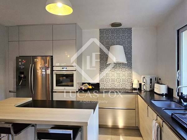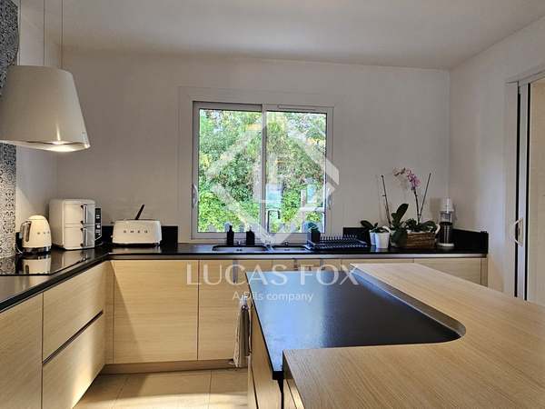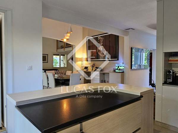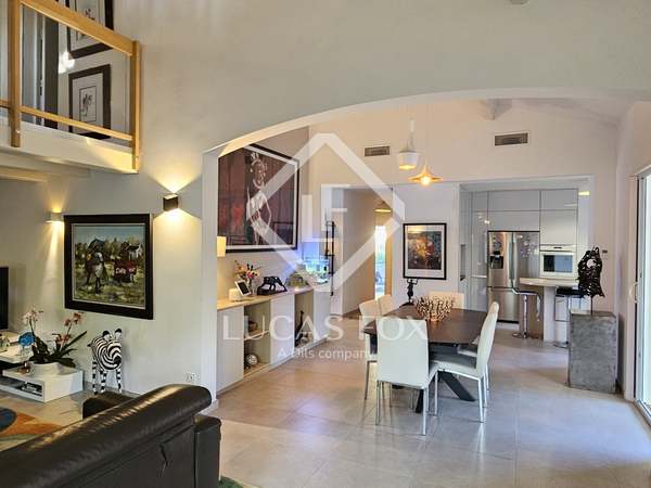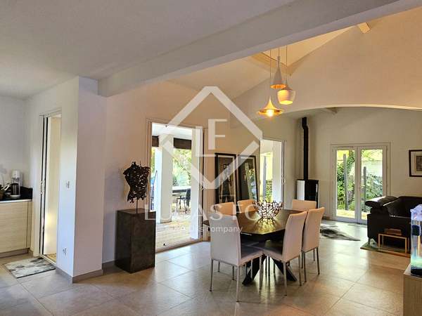 The entrance opens onto a large, bright, south-facing living room of 75 m², with a TV area that can be closed off. A separate kitchen with a pantry adjoins the dining area and opens onto the terrace. There are also three bedrooms and two bathrooms on the ground floor of the west and east wings of the house.