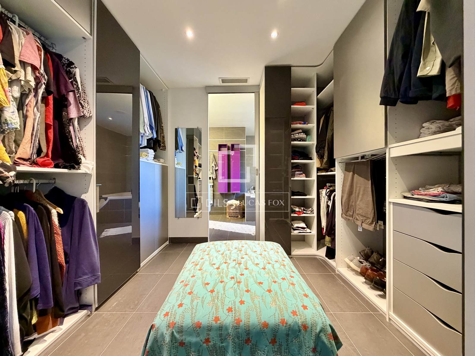 On the daytime side, there's an entrance hall with built-in closets, as well as an impressive double-height living room of approximately 100 square meters. It comprises a lounge, a dining room, and a magnificent kitchen with an island and a tea/coffee station, reminiscent of a hotel. Walnut wood and granite are the primary materials used throughout. The room is bright and airy, with windows on both sides. A dining terrace with a bioclimatic pergola and outdoor lounge area extends the living space.