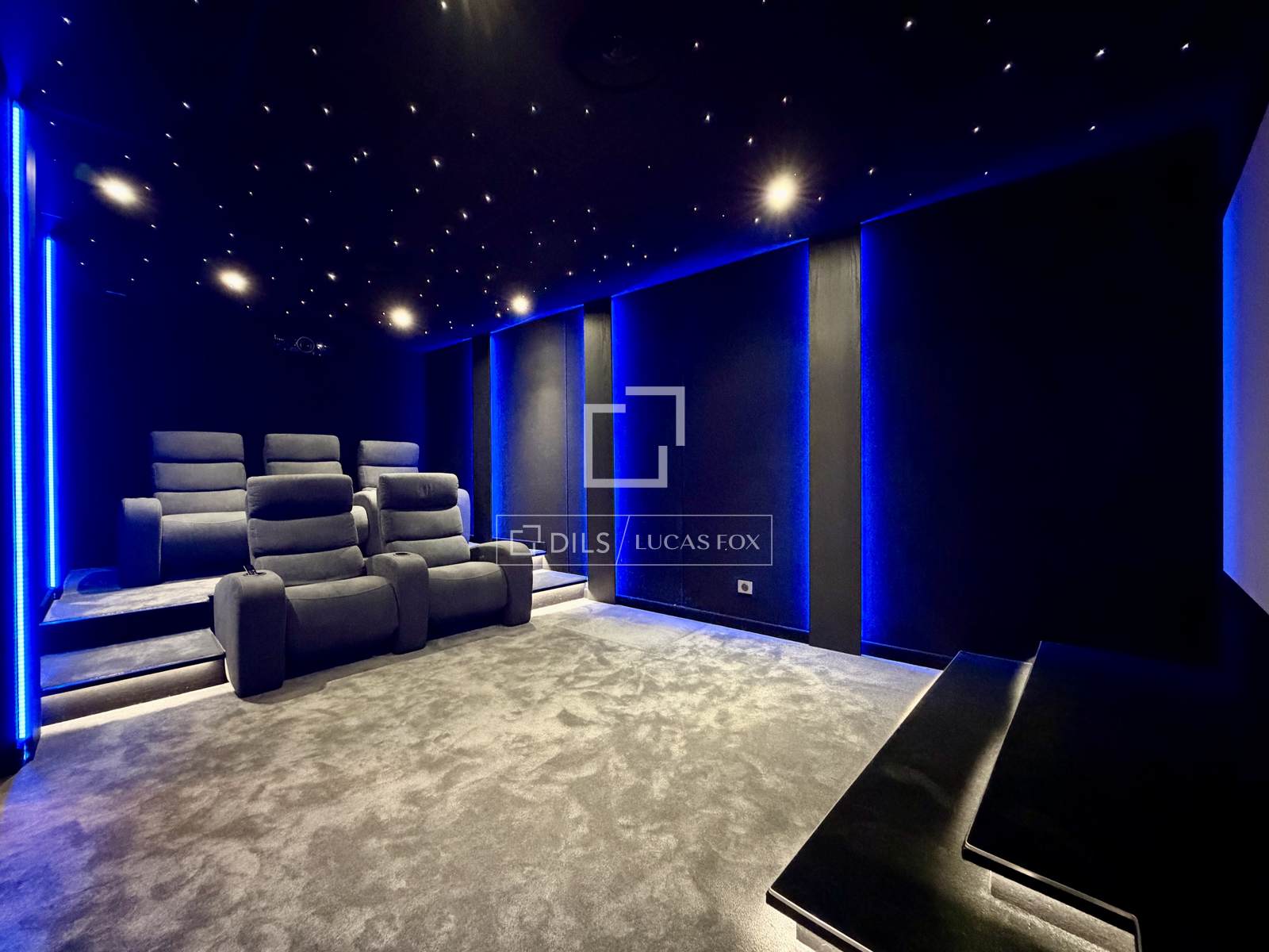 The gym and home cinema are major assets. This property benefits from numerous amenities, including: ducted air conditioning + underfloor heating; sliding glass doors with roller shutters and screens; in-ceiling stereo systems in all rooms; solar panels (30k), making the house self-sufficient during the warmer months.
