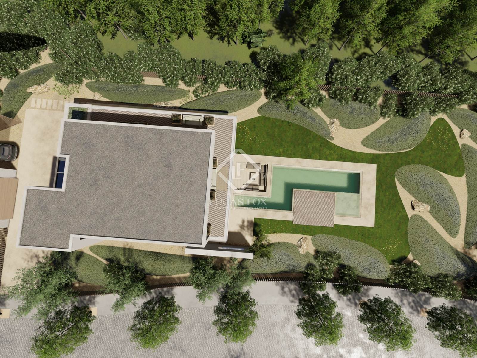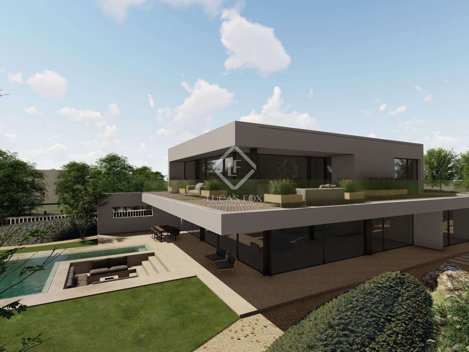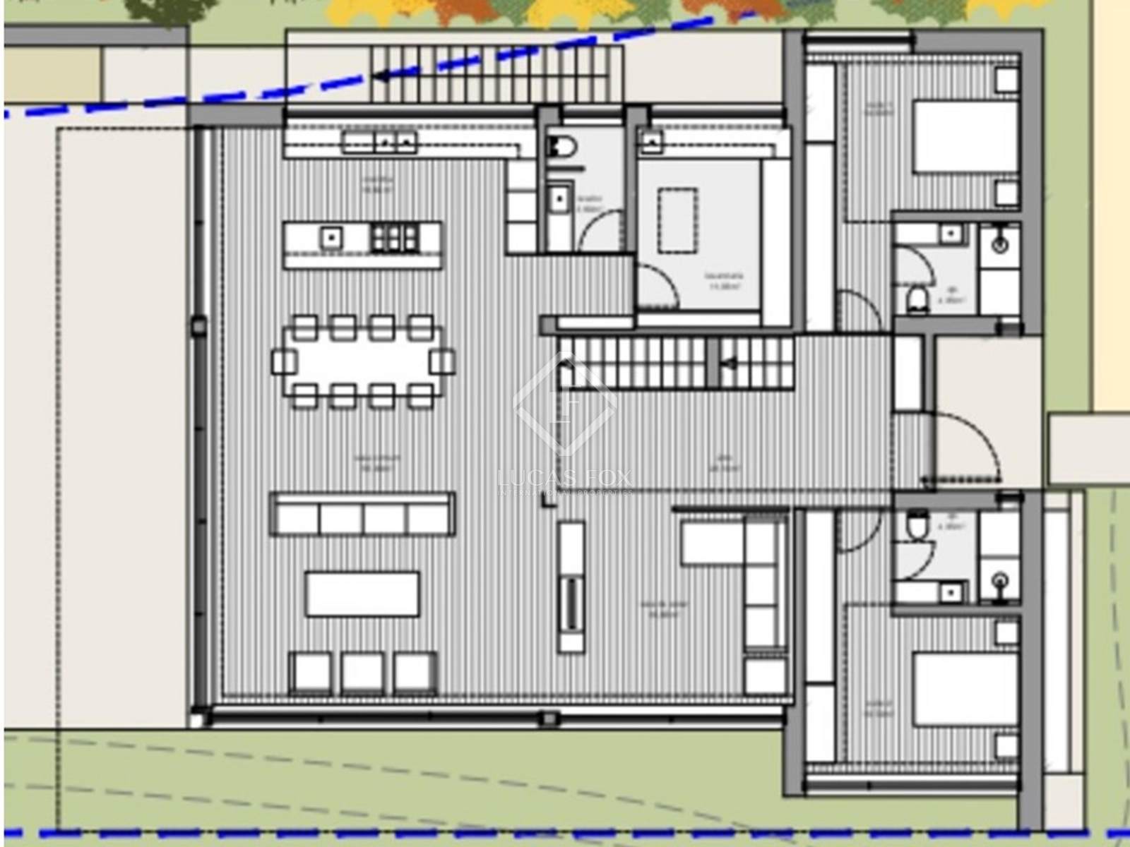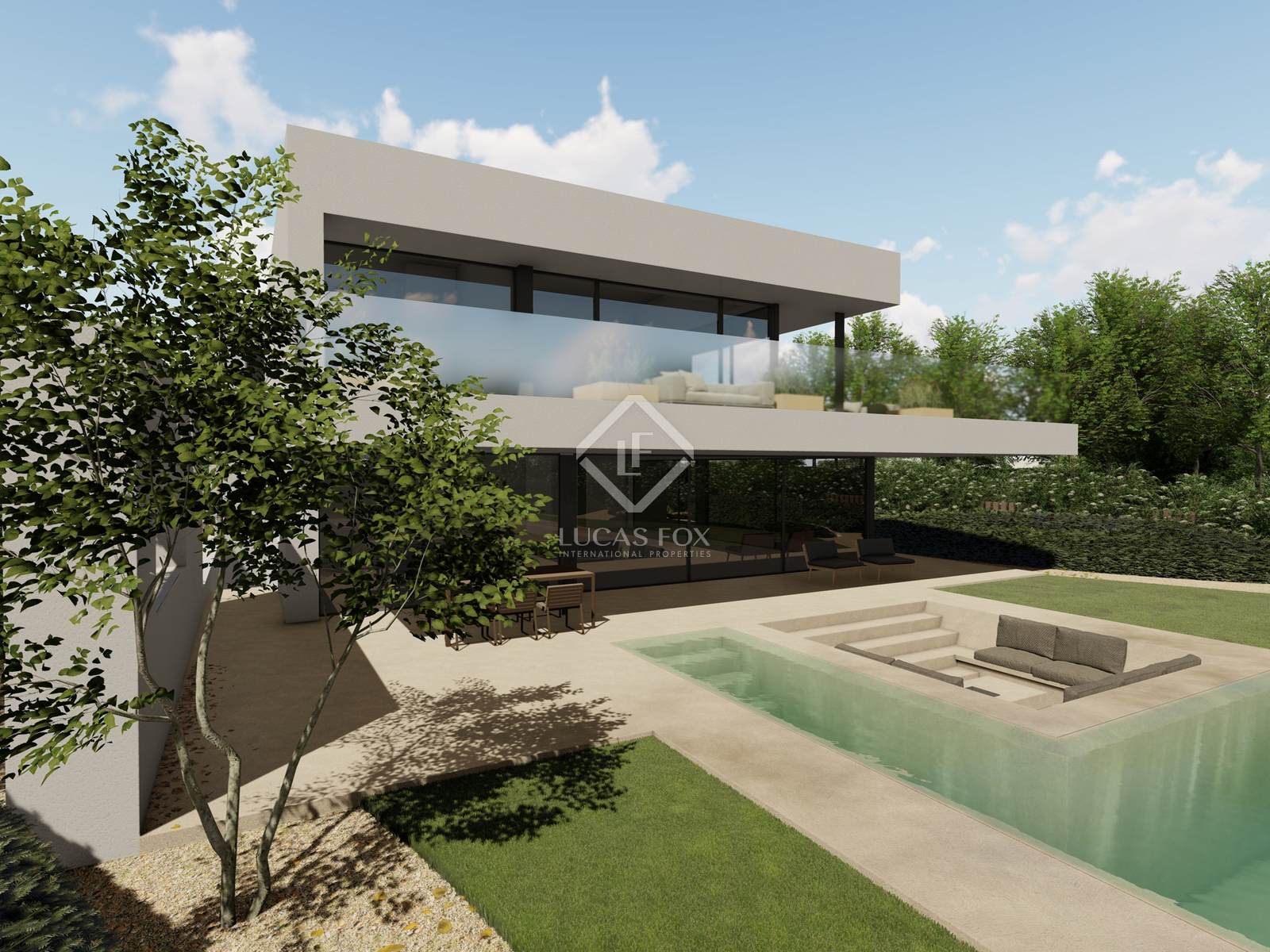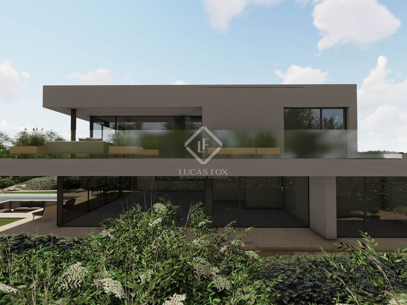 The upper floor offers a master suite with walk-in closet, balcony overlooking the pool, office with bathroom and a wellness area with gym, sauna and bathroom.