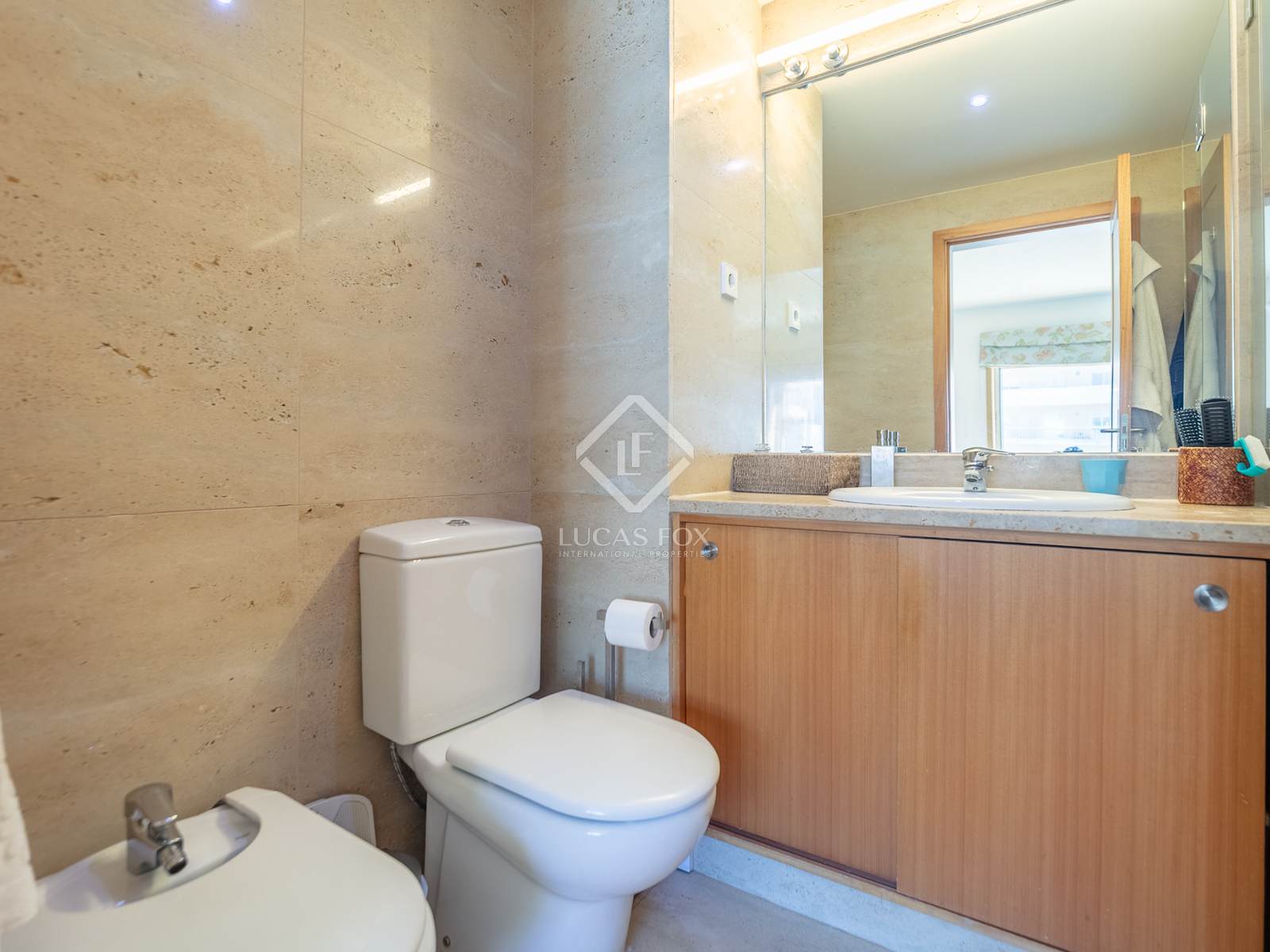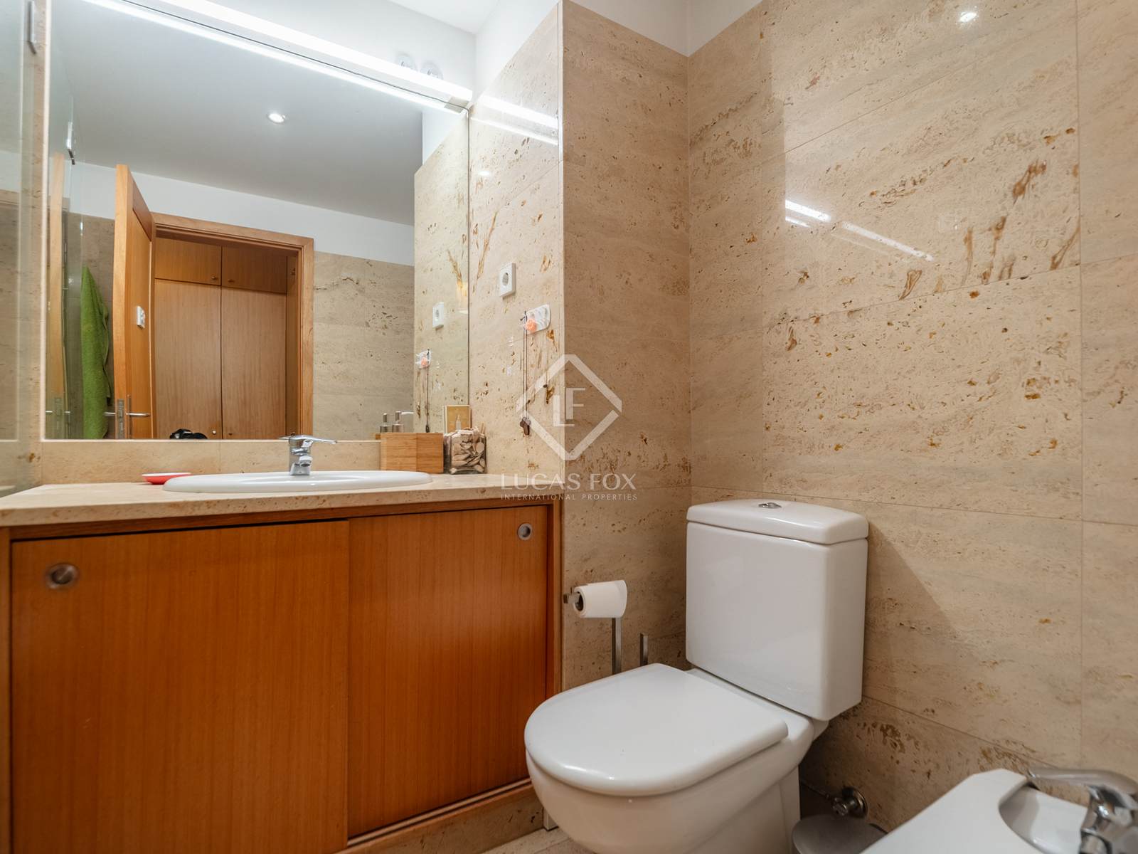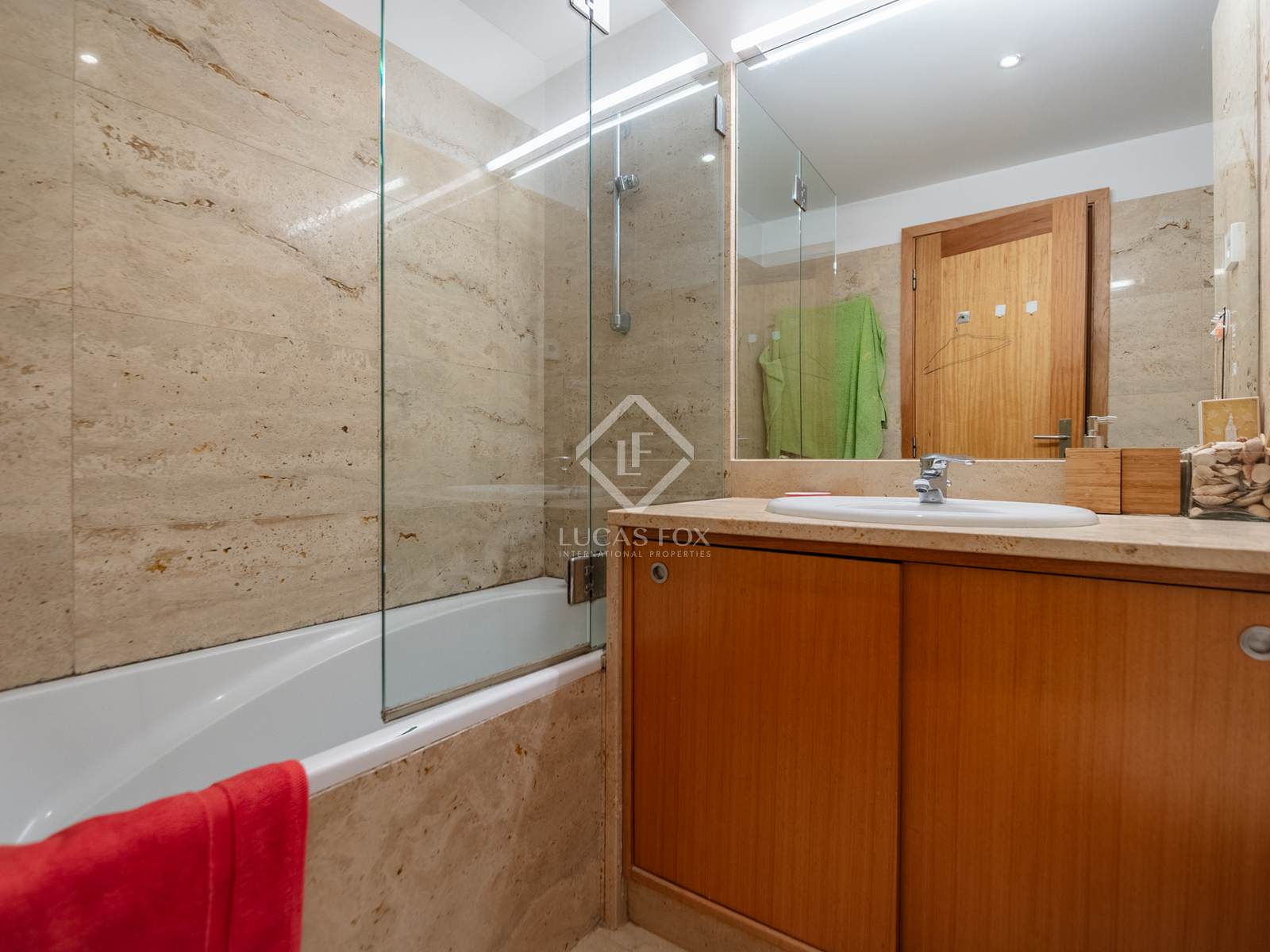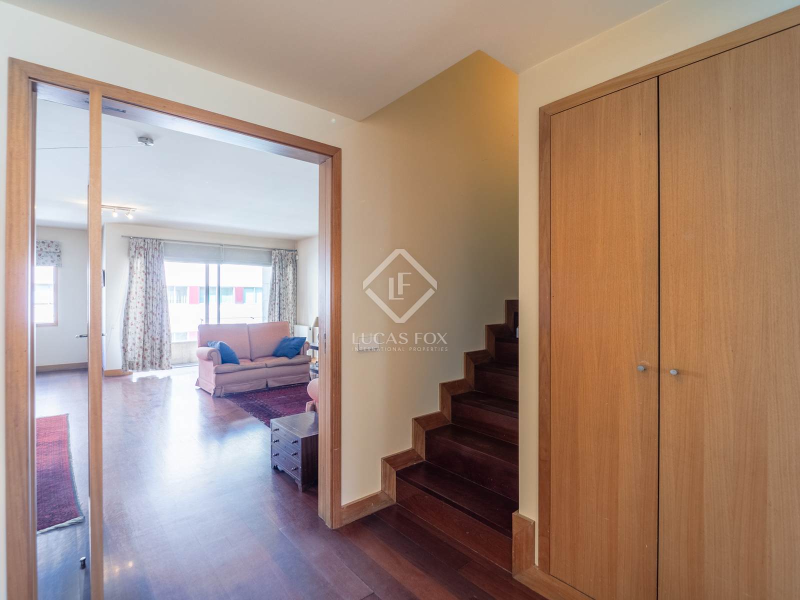 The apartment is spread over two generously sized floors and features three suites, one with a walk-in closet. The living room opens onto the balcony, and the kitchen and laundry room are fully equipped.
