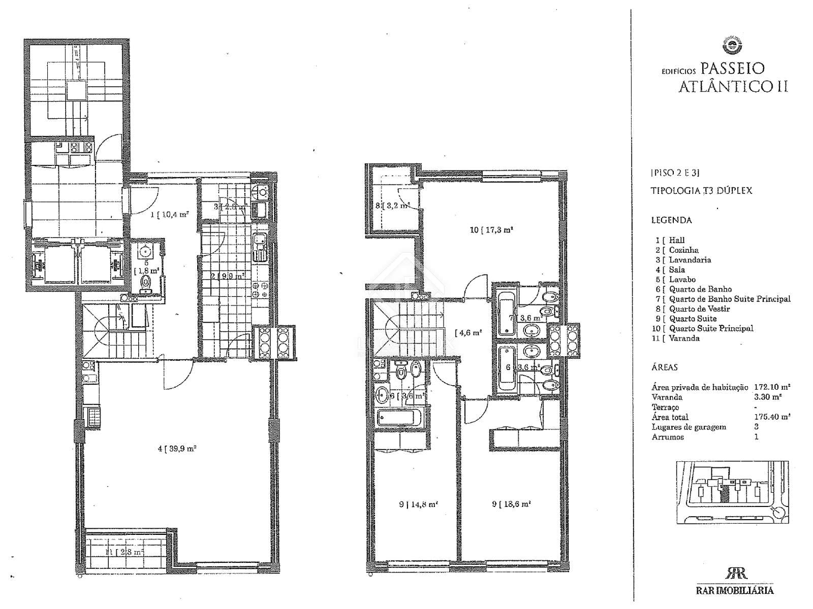 3-bedroom duplex apartment, located in Matosinhos Sul, on the second beach line, with 175.40 m2 of total area, of which 172.10 m2 corresponds to the habitable area and 3.30 m2 to the balcony area.