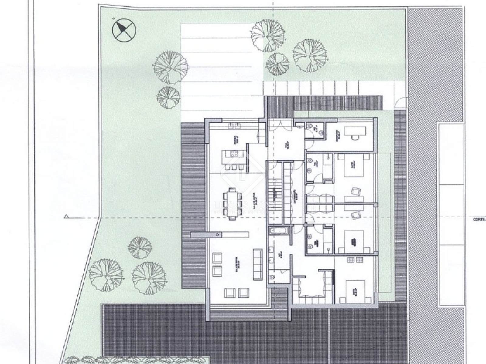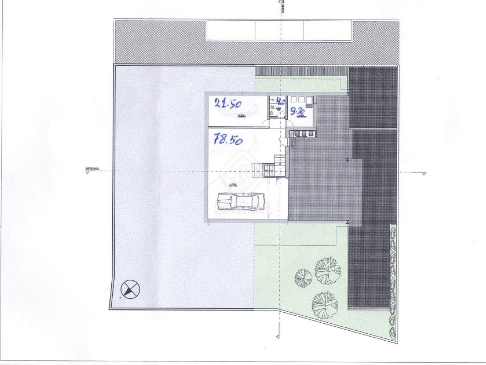 The project features a house with 448 m² of covered area, corresponding to a building footprint of 224 m² dedicated to the living space, developed on a single floor. The remaining 224 m² correspond to the basement area, intended for a garage, storage, laundry room, and bathroom, ensuring efficient separation between the technical areas and the living space. The garden, with 571 m², provides a spacious outdoor area, ideal for leisure and family use.