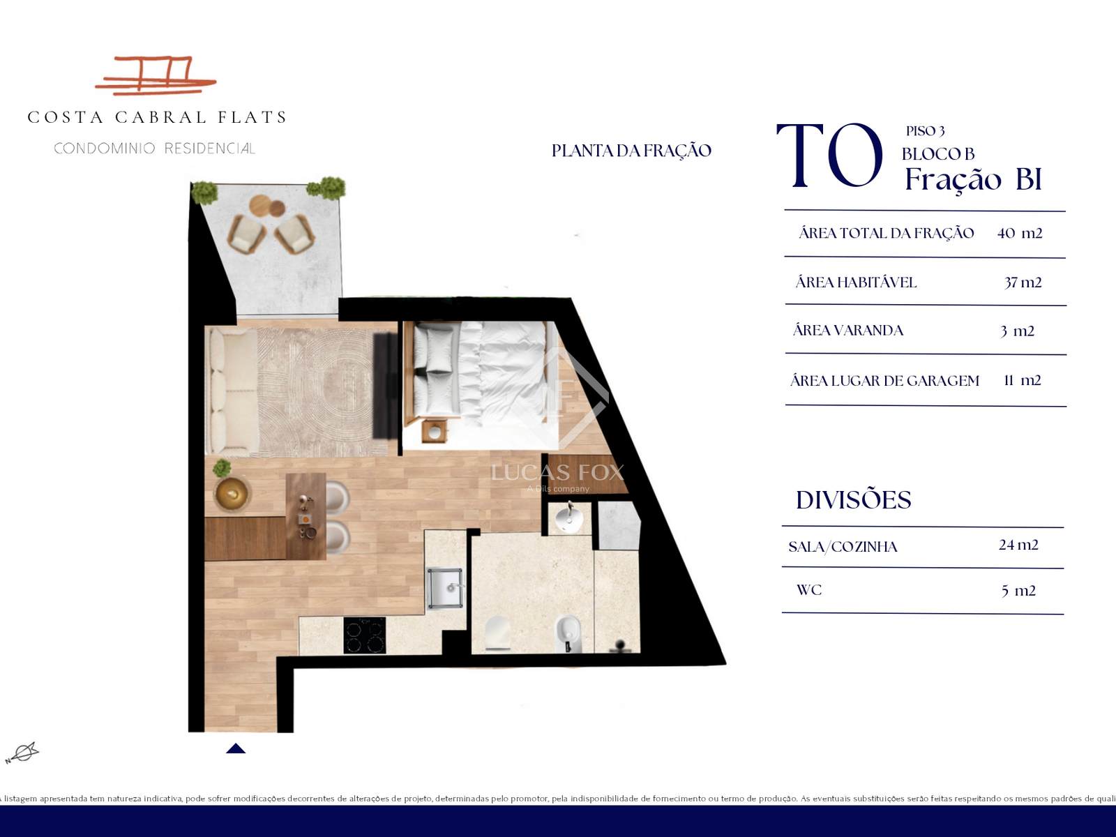 Studio apartment with 40 m2 of total area, of which 37 m2 corresponds to the living area and 3 m2 to the balcony area.