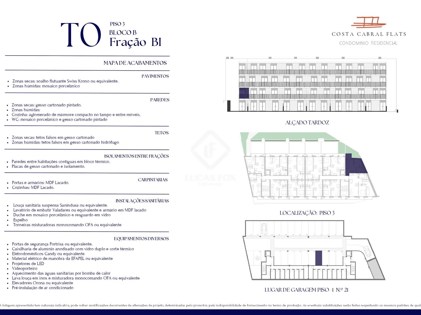 The apartment is located in Block B, on the 5th and top floor of the building, and has a parking space on floor -1, measuring 11 m2 .