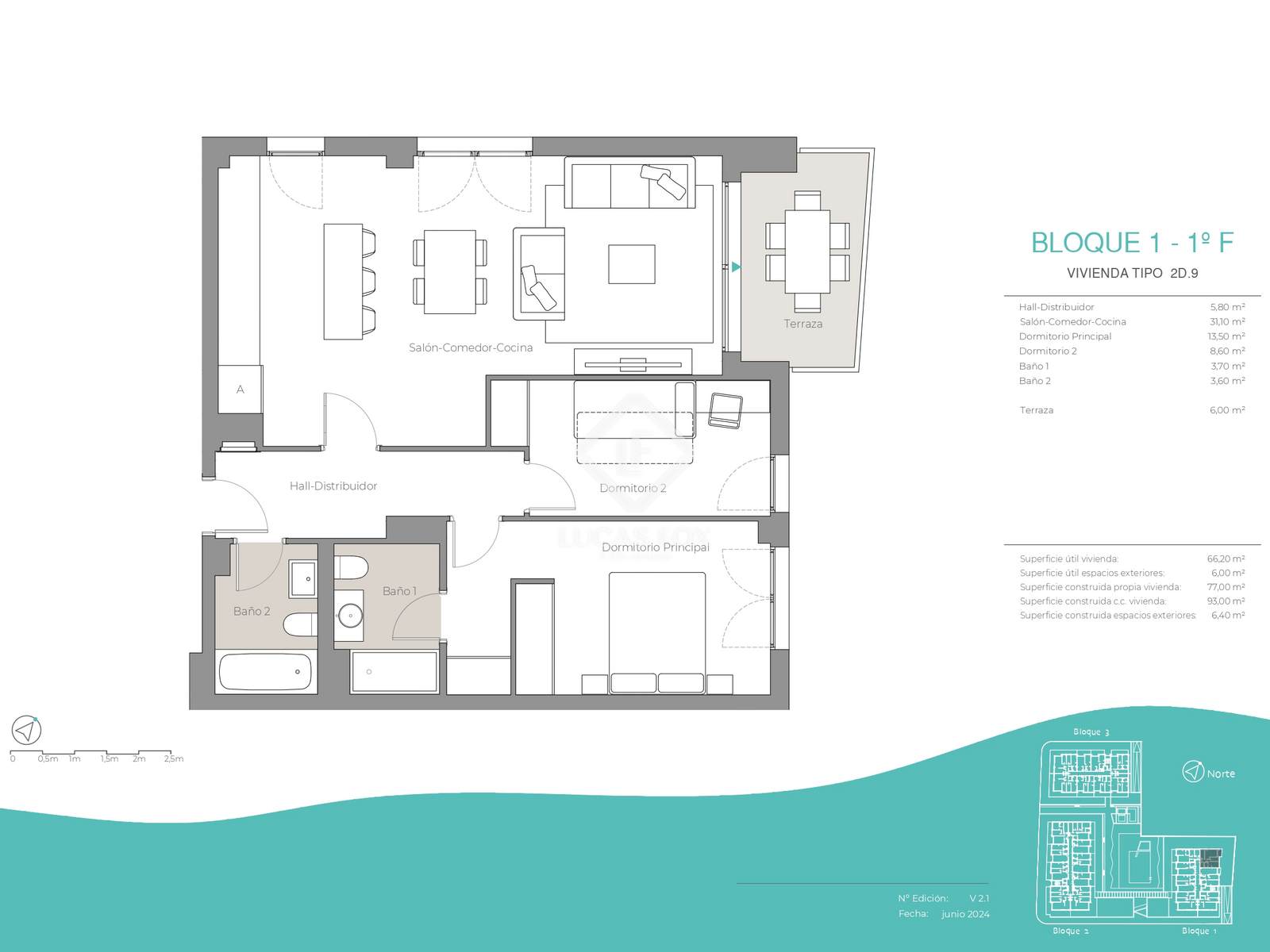 This exclusive first floor property in building number 1 has a surface area of 93 m² and a private 6 m² terrace. The property features a spacious living-dining room with an open-plan kitchen, which has direct access to the terrace through large windows that allow plenty of natural light. There are two bedrooms and two bathrooms.