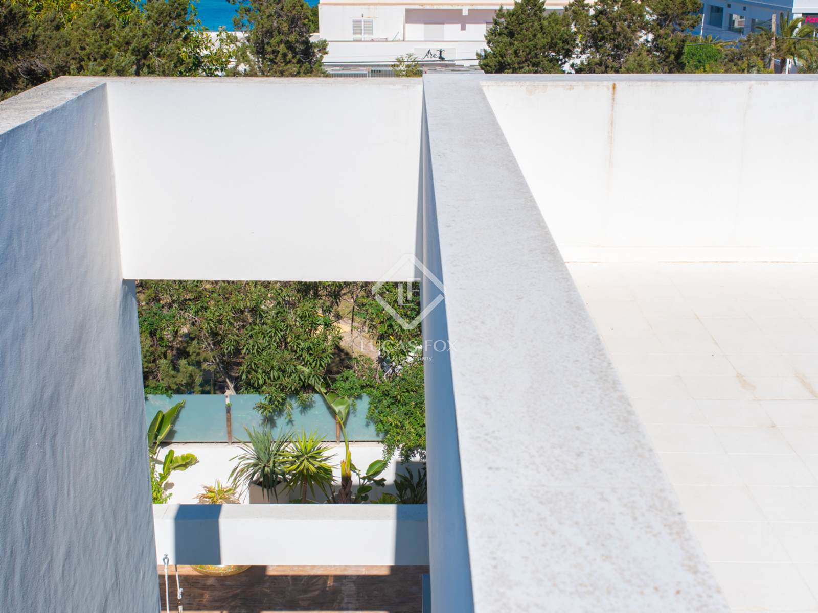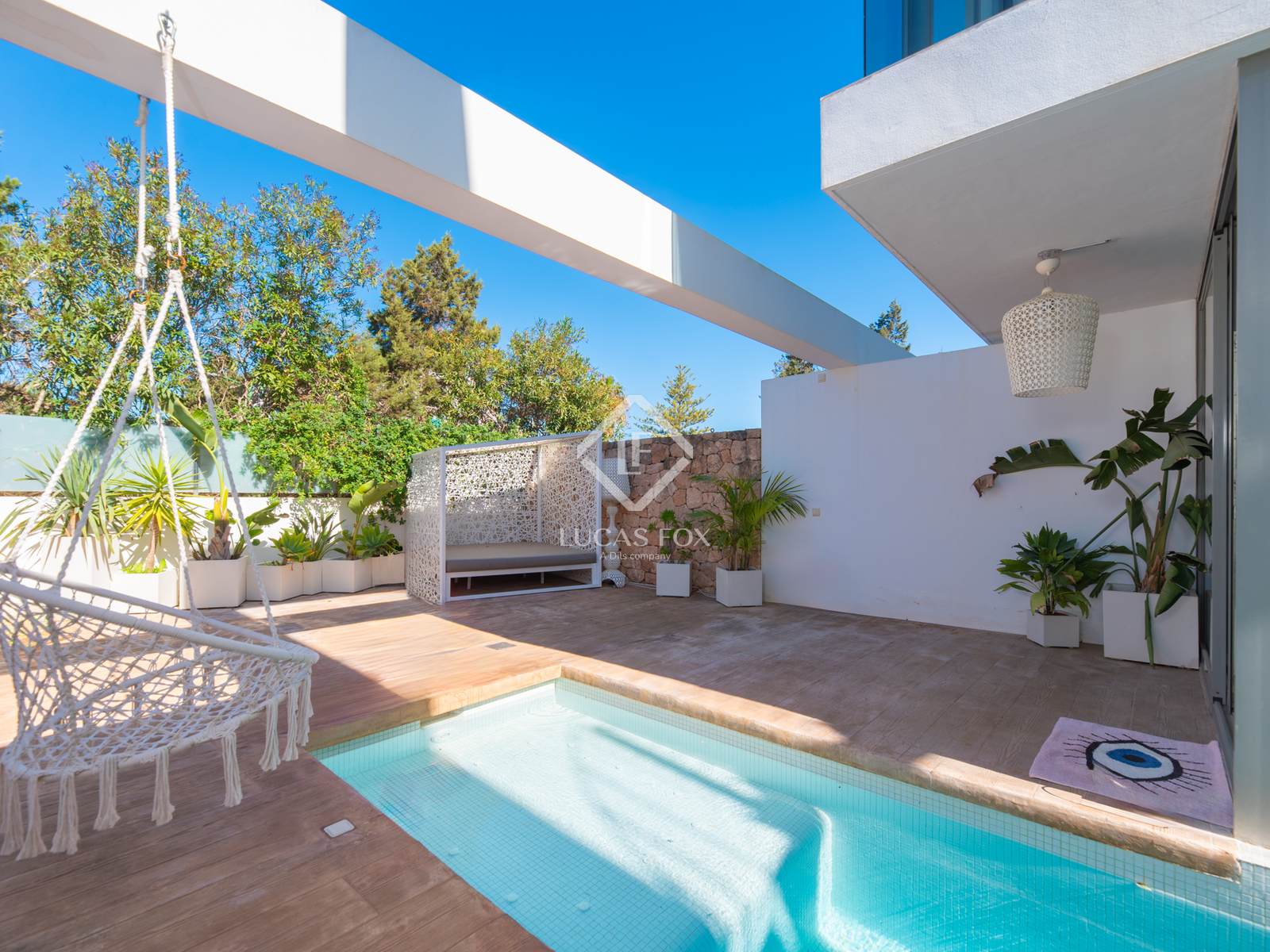 This modern, semi-detached 3-bedroom house in Cala de Bou, Ibiza, boasts unique design features, a beautiful garden, private pool, and is situated in a secure, private development with 24-hour security.