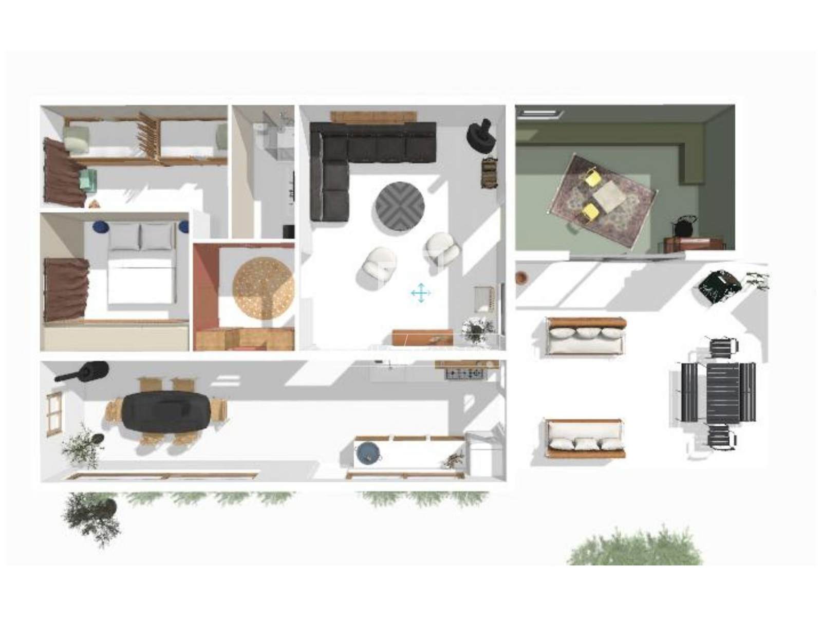 Set on a generous plot of 1,264 m², it includes a spacious main house, a separate guest house with two independent studios, inviting terraces, and a swimming pool.