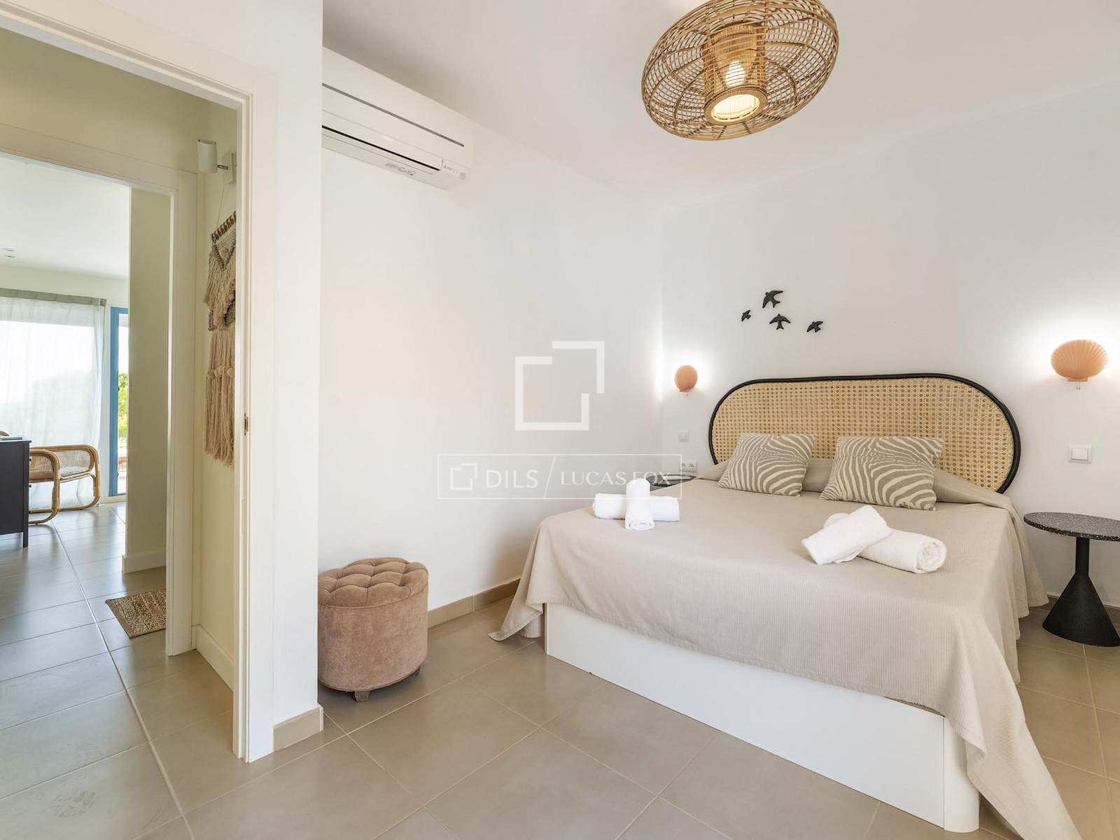 The private terrace is ideal for enjoying the Ibizan climate, whether relaxing, dining al fresco, or entertaining guests. The property also features a garage, air conditioning, and access to a communal swimming pool, perfectly integrated into the surroundings.
