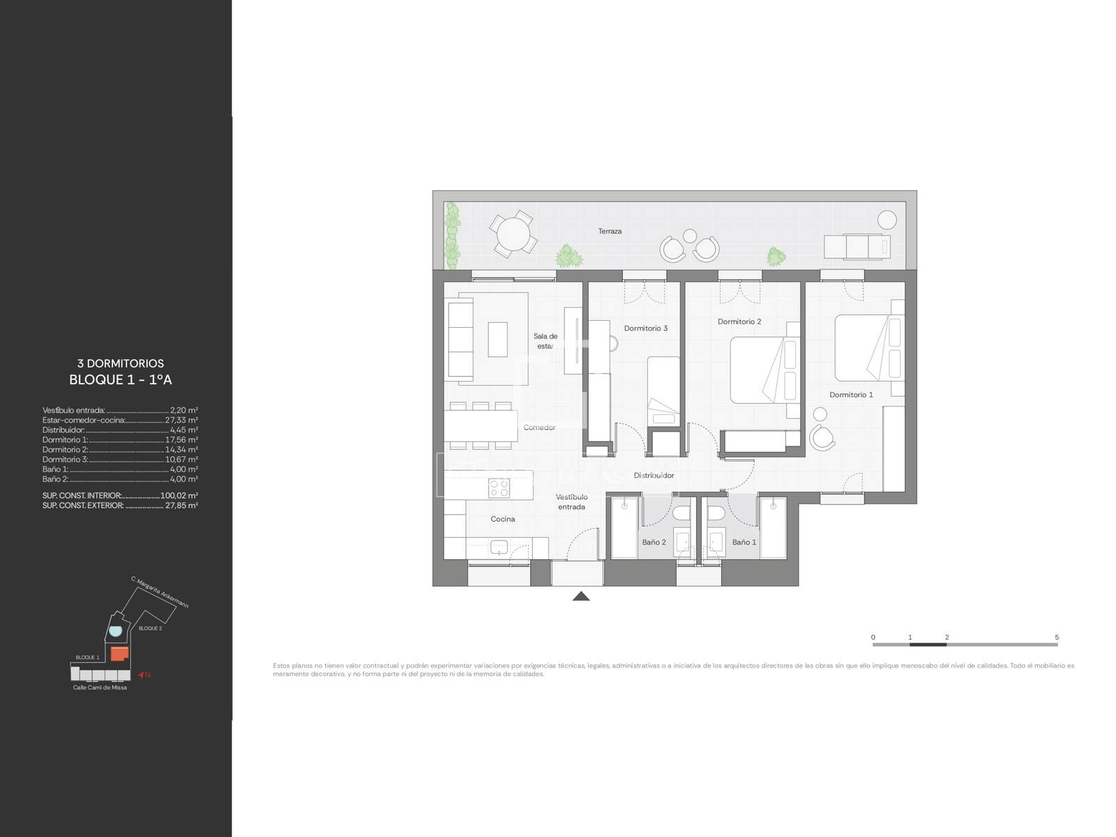 This apartment boasts 99 m² of living space and a 23 m² terrace, with a functional layout that maximizes the available area. The day area features an open-plan kitchen living-dining room and kitchen, bathed in natural light thanks to its large windows. The night area includes a single bedroom , a double bedroom , the main bedroom with its en-private bathroom , and a second bathroom serving the entire property. All the main rooms access onto the spacious terrace, which offers ample room for an exterior dining room and a chill-out area.