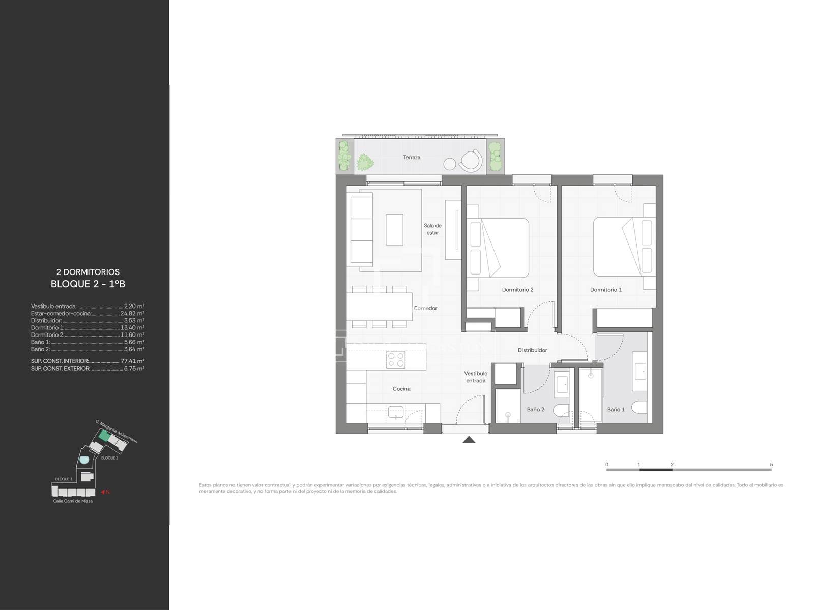 This apartment has a surface area of 76 m² and a 6 m² terrace, with a functional layout that makes the most of the space. The day area features an open-plan kitchen living-dining room with a kitchen, which receives plenty of natural light thanks to its large windows. The night area includes a double bedroom , the main bedroom with an en-private bathroom , and a second bathroom serving the entire property. The living room provides access to the terrace.