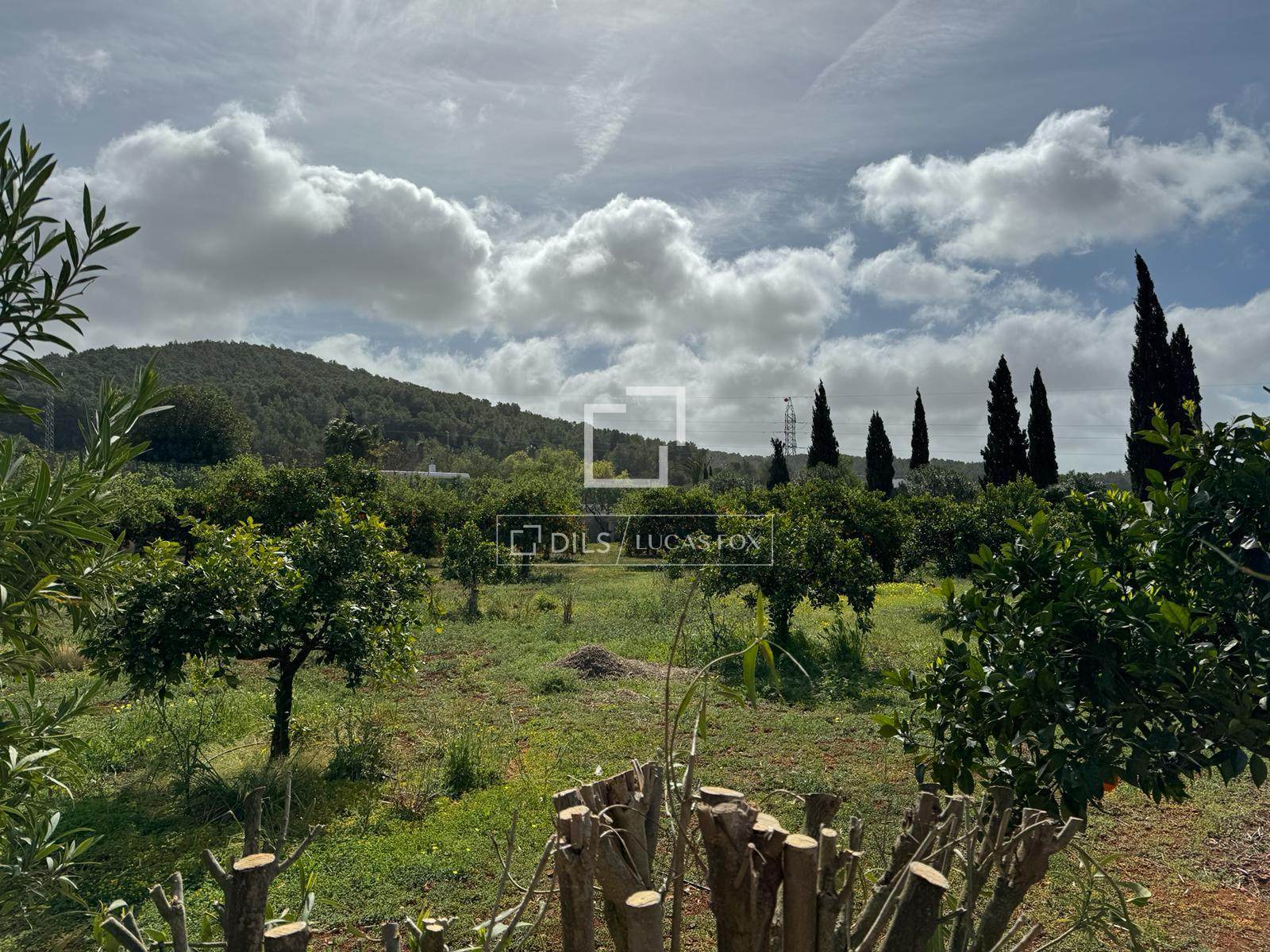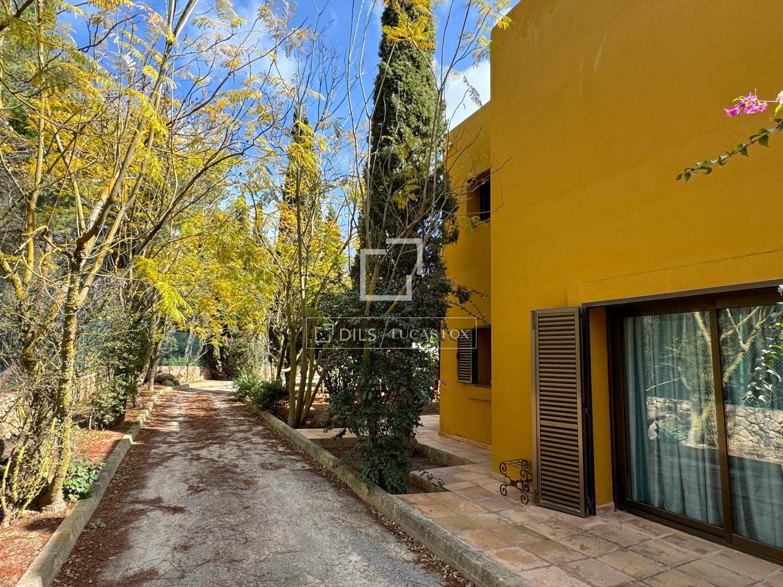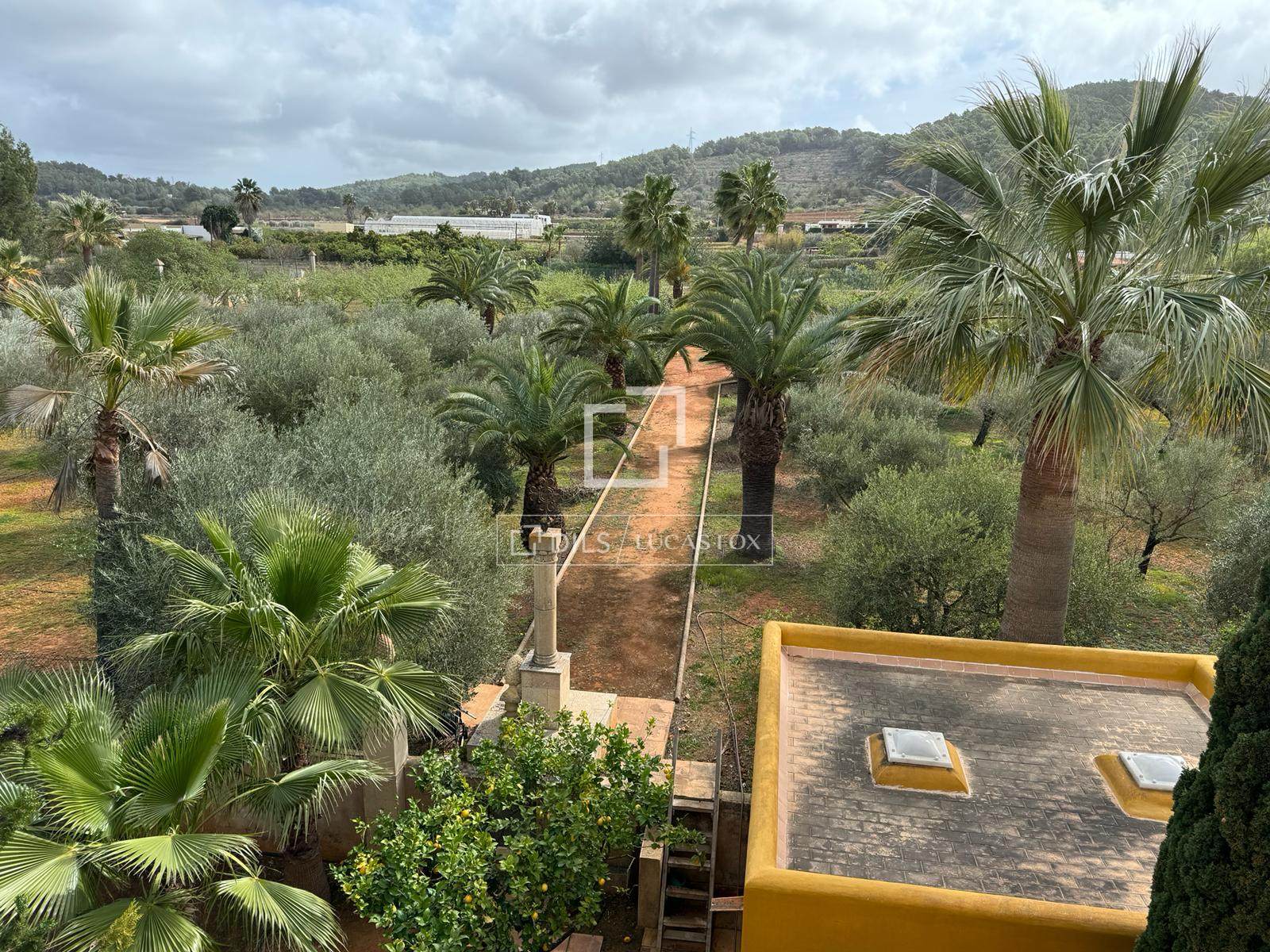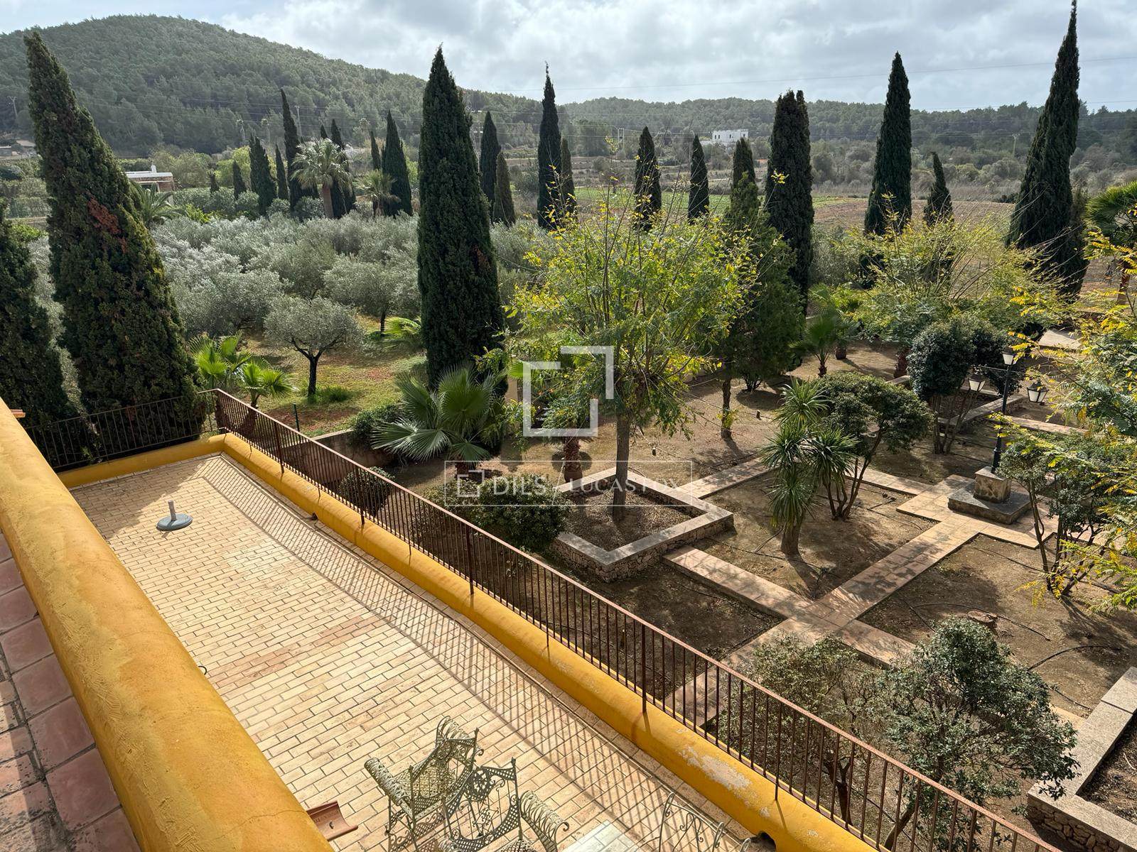 Charming 5-bedroom country house on an 11,200 m² fenced plot in Santa Gertrudis, offering privacy, south orientation, terraces, natural surroundings, and potential for sustainable living.