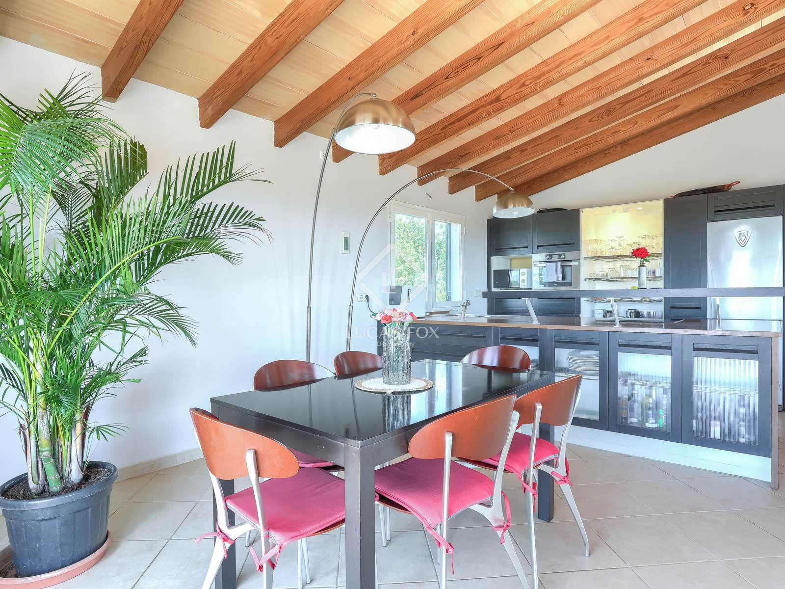 This elegant Mallorcan country house of 212 m² is spread over two floors. The ground floor offers three bedrooms and two bathrooms, including a spacious master suite with walk-in dressing room and en-suite. A cozy billiard room with integrated bar completes this level. Upstairs, an open-plan living and dining area with modern kitchen opens onto a large covered terrace with wonderful views. Built in 2000, the property features central heating, air conditioning, and has been beautifully maintained.