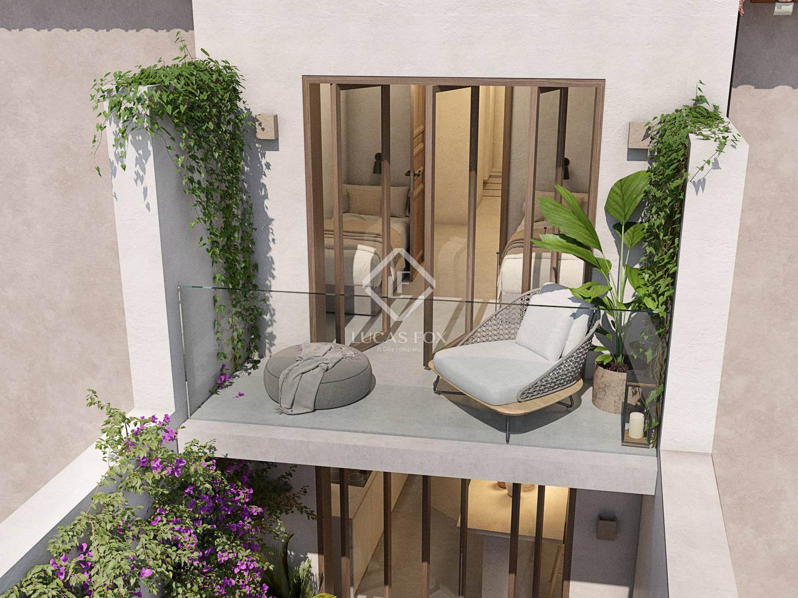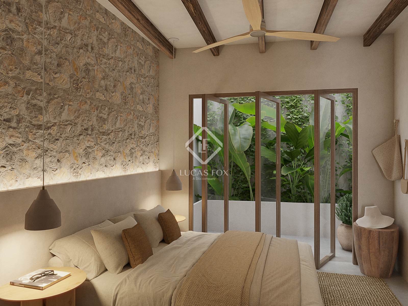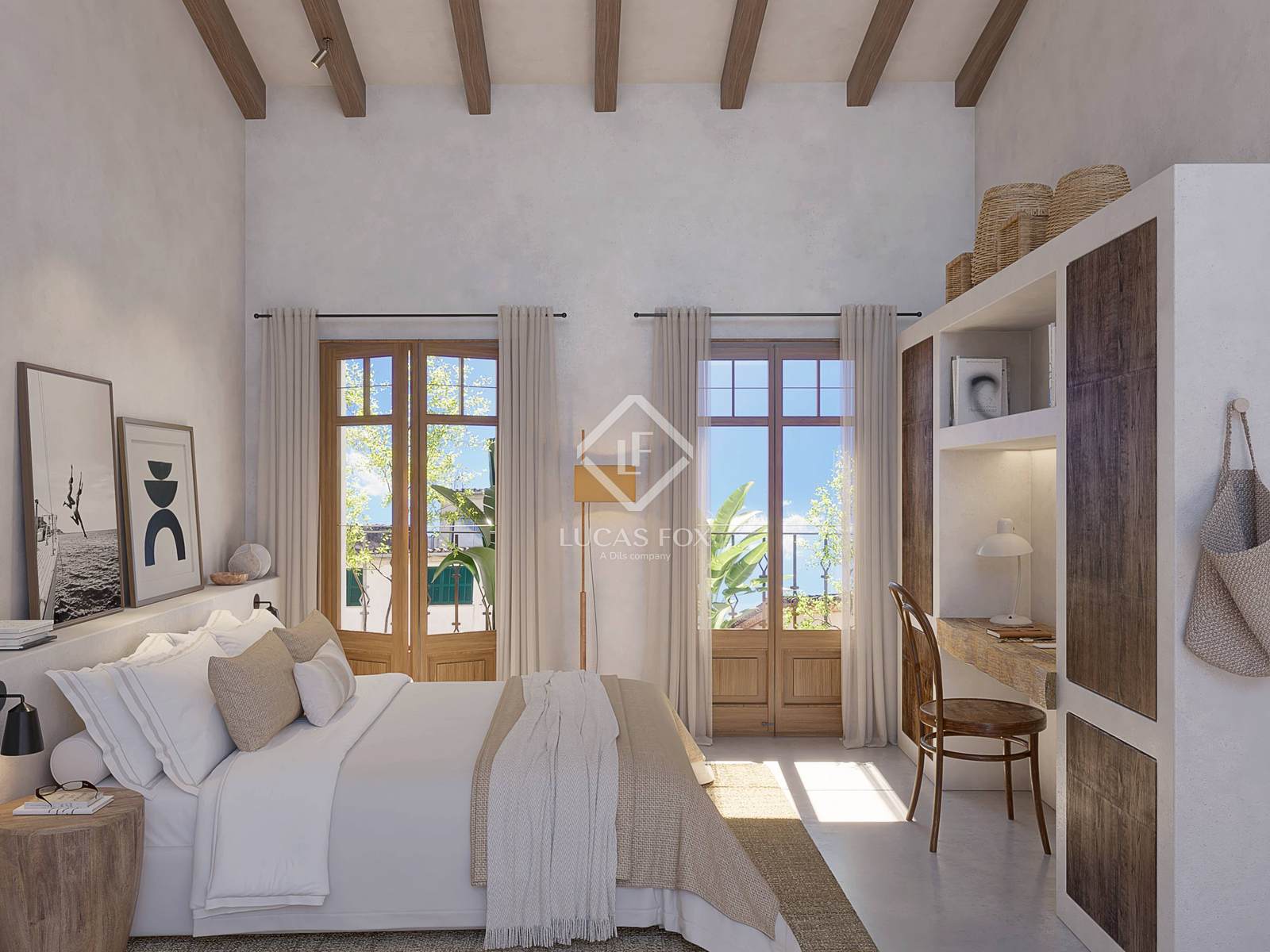 The second floor is dedicated to the sleeping area. It features a spacious master bedroom with high ceilings, French doors, and two small balconies with views of the square and the church. At the back is a second, smaller bedroom with a balcony offering stunning views of the Tramontana mountains. A bathroom with a separate WC and built-in closets sits between the two bedrooms. This second bedroom could also be converted into a dressing room, home office, or gym to create a luxurious master suite.