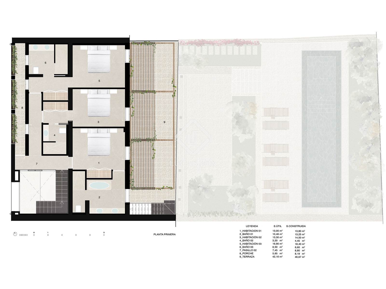 Upstairs, three elegant bedrooms, each with its own private bathroom, dressing room and access to an individual terrace, offer optimal comfort and unforgettable sunrises.