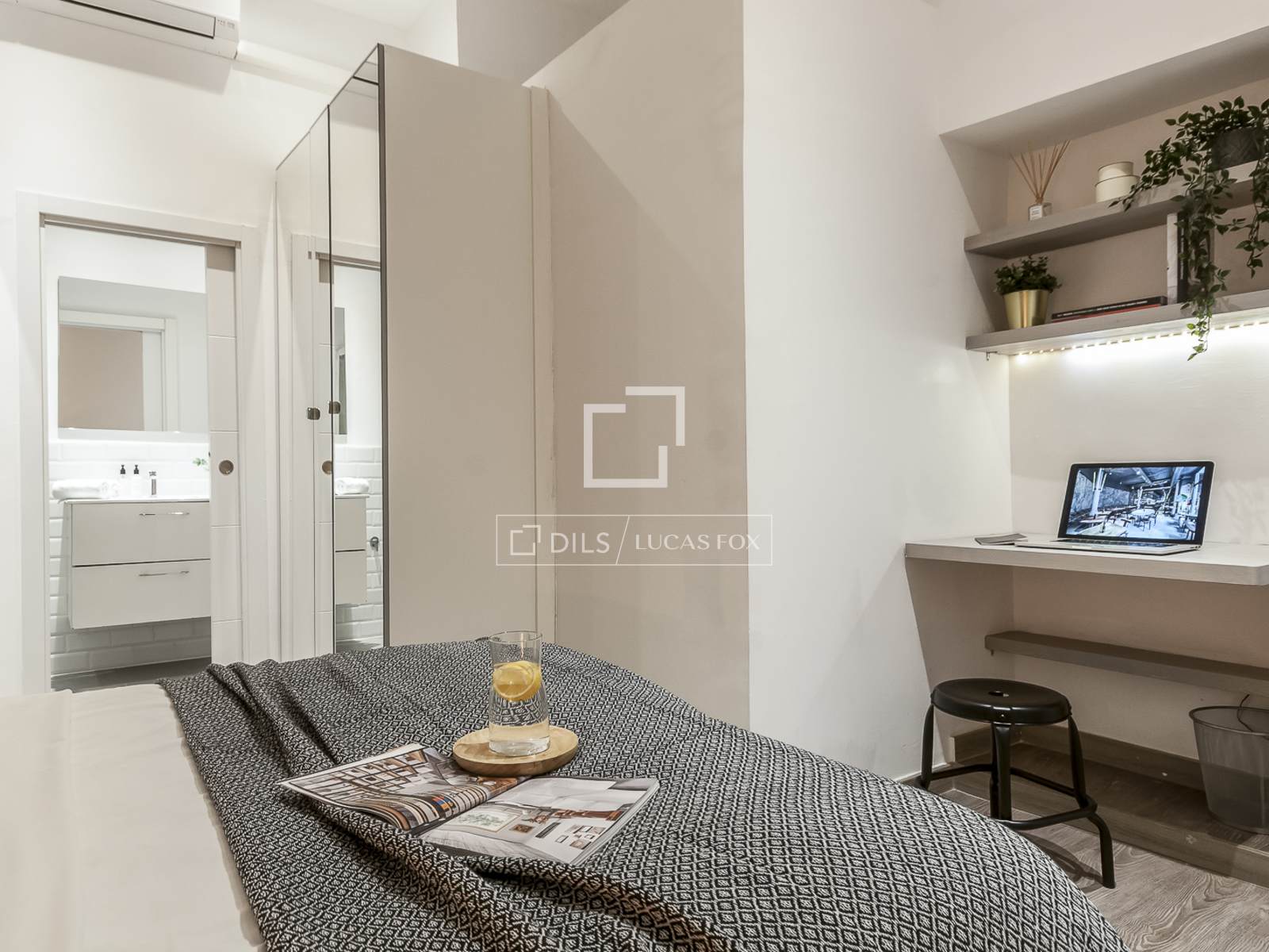 The apartment, located on the first floor with completely private access from the street, has been fully renovated, combining the building's historical character with a contemporary, elegant, and functional design. Its prime corner location, between two quiet pedestrian streets, allows for extraordinary natural light thanks to five large windows that flood the space throughout the day.
