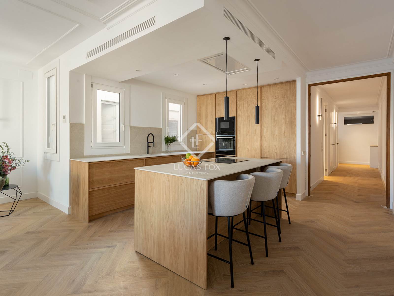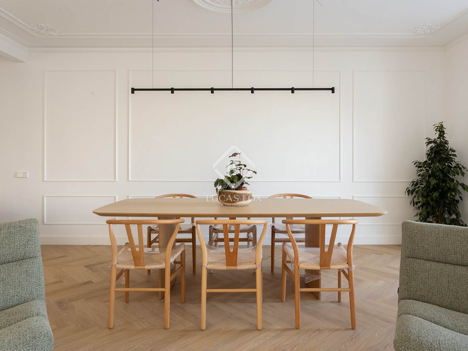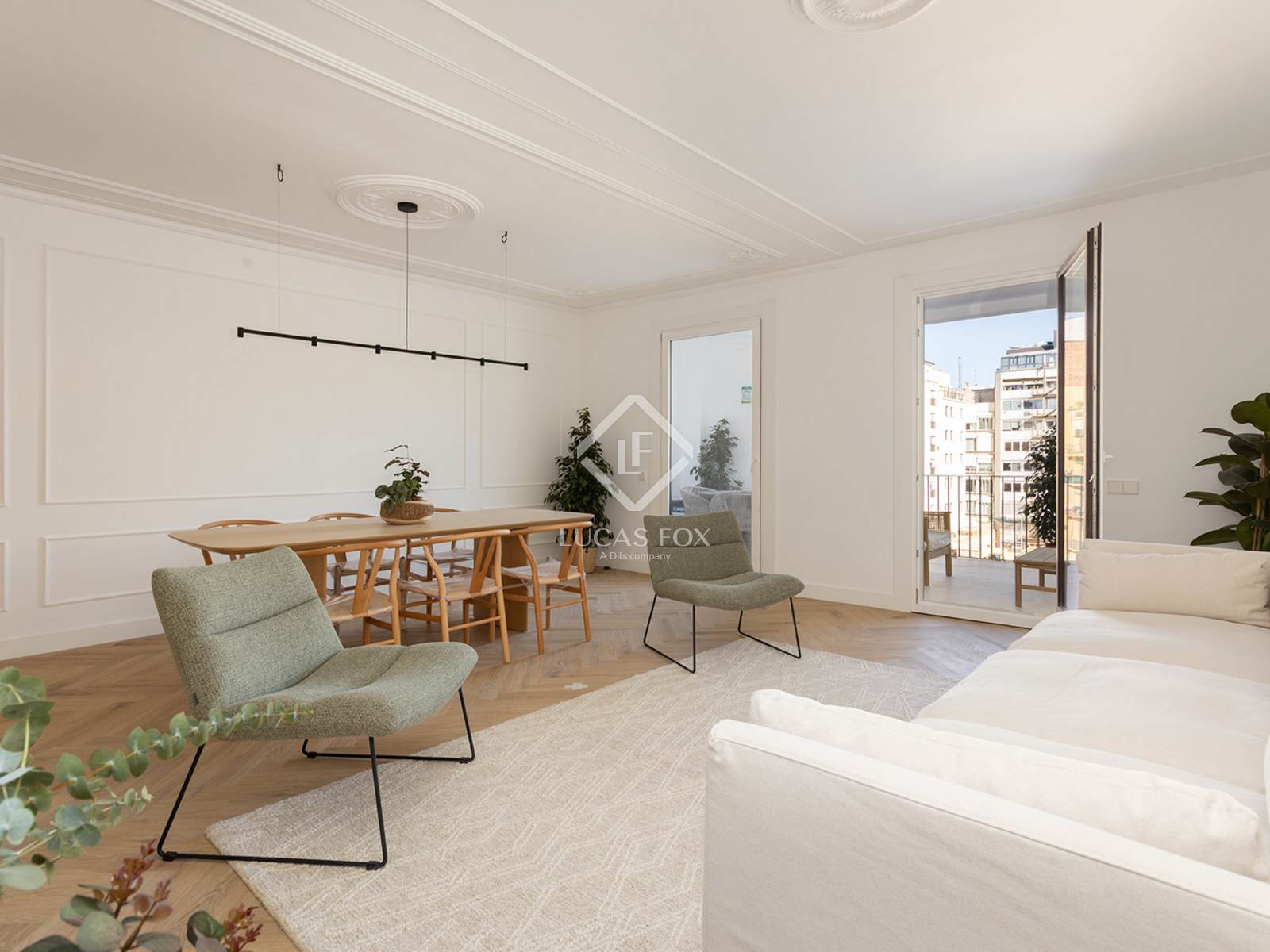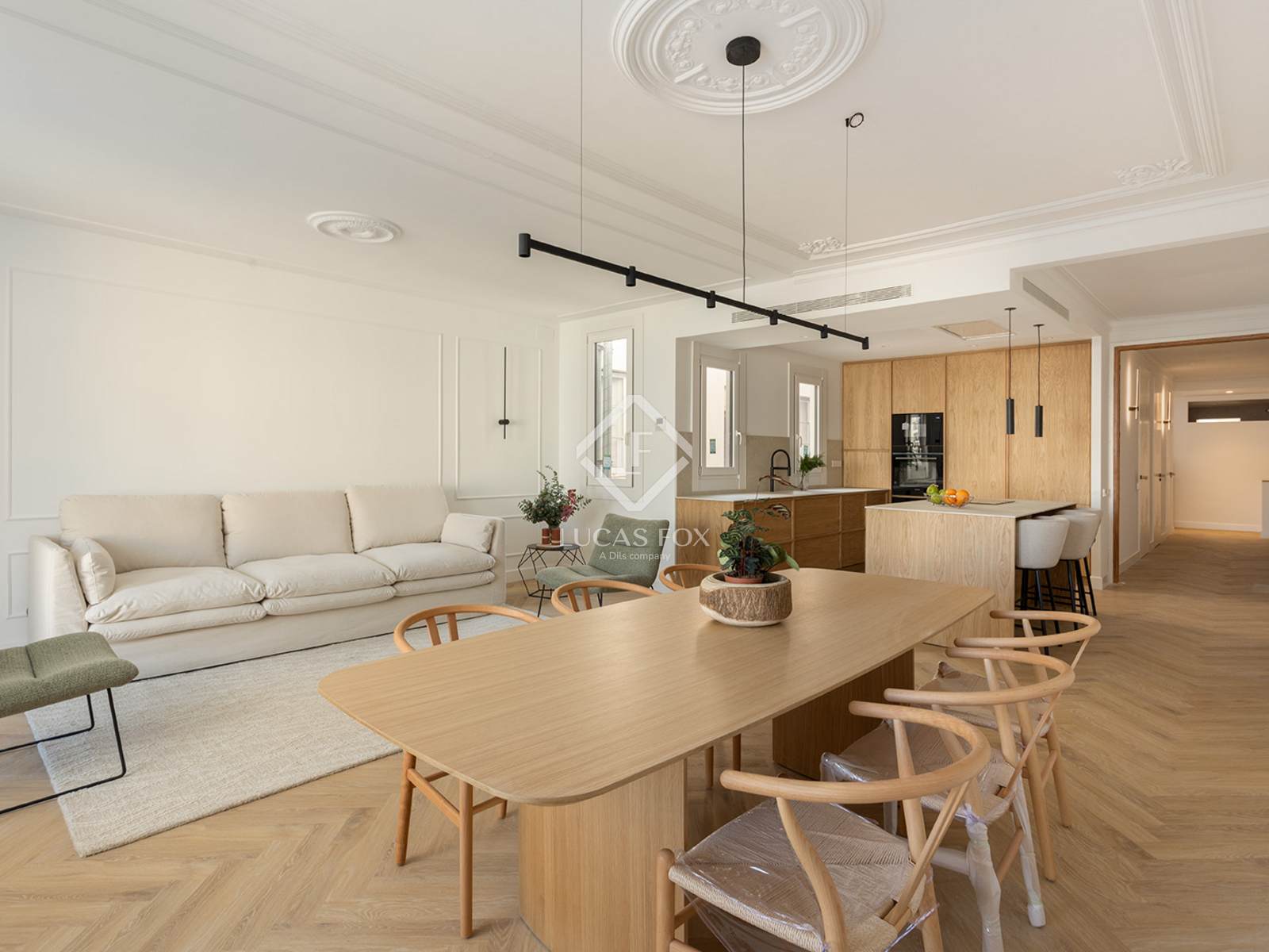 Fully renovated 140.5 m² designer apartment in a classic Eixample building, featuring high ceilings, a 49 m² open-plan living area, 18 m² terrace, 3 bedrooms, 2 bathrooms, guest toilet, and stylish furnishings, located just steps from Passeig de Gràcia.