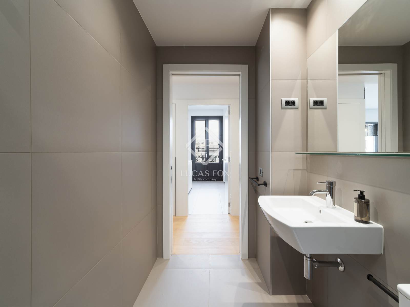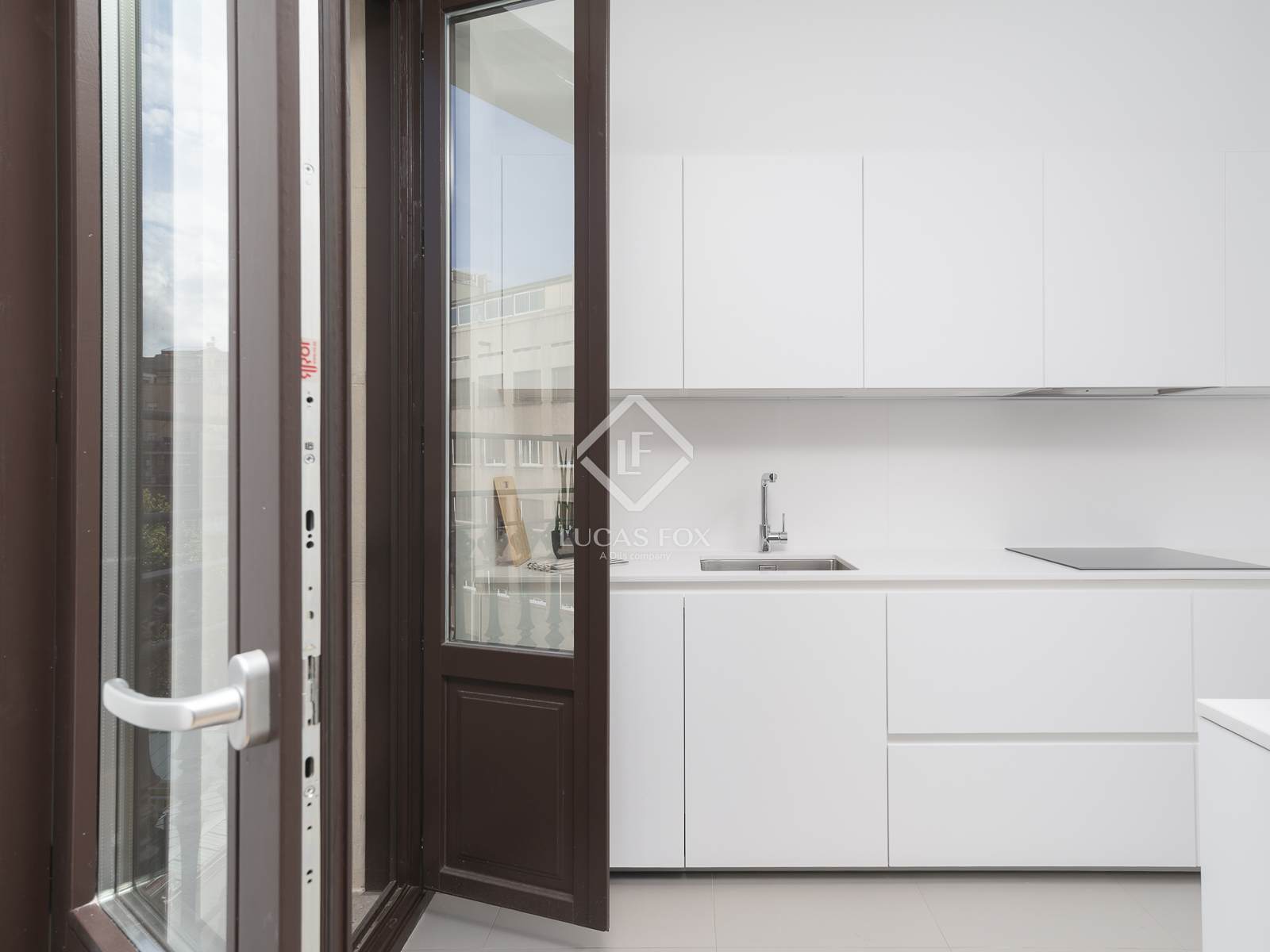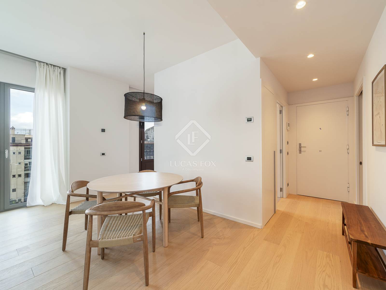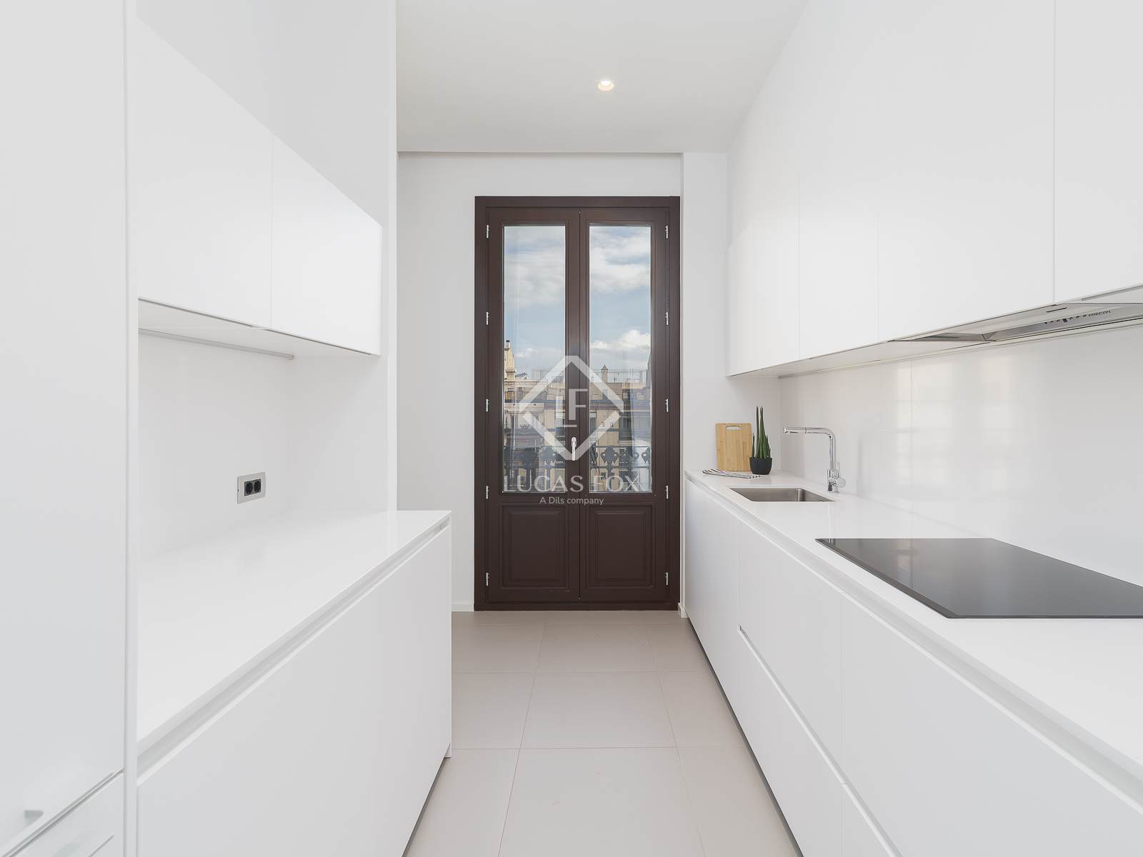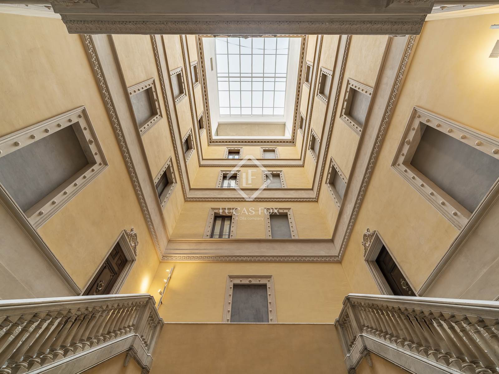 This particular unit is one of four standard two-bedroom homes located in the interior part of the building, ensuring a quiet and private residence. While the interior is newly constructed, the building retains the striking original main staircase and its skylight, preserving the graceful presence of a historical Barcelona building.