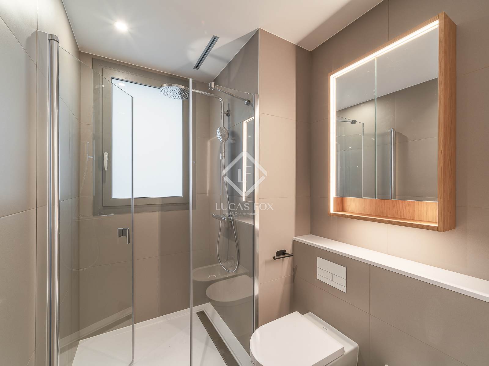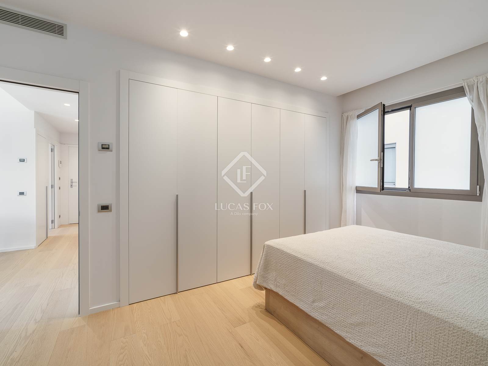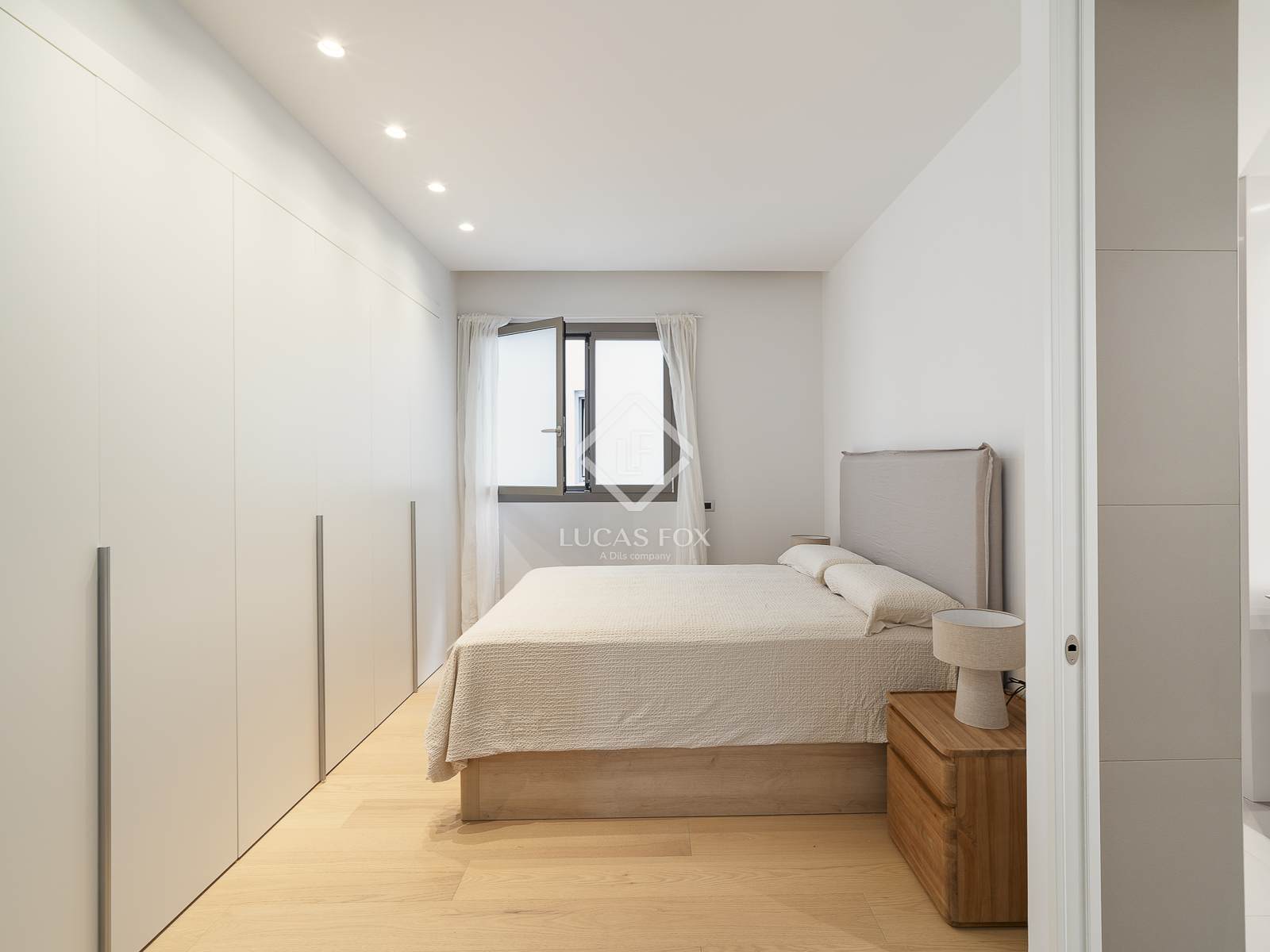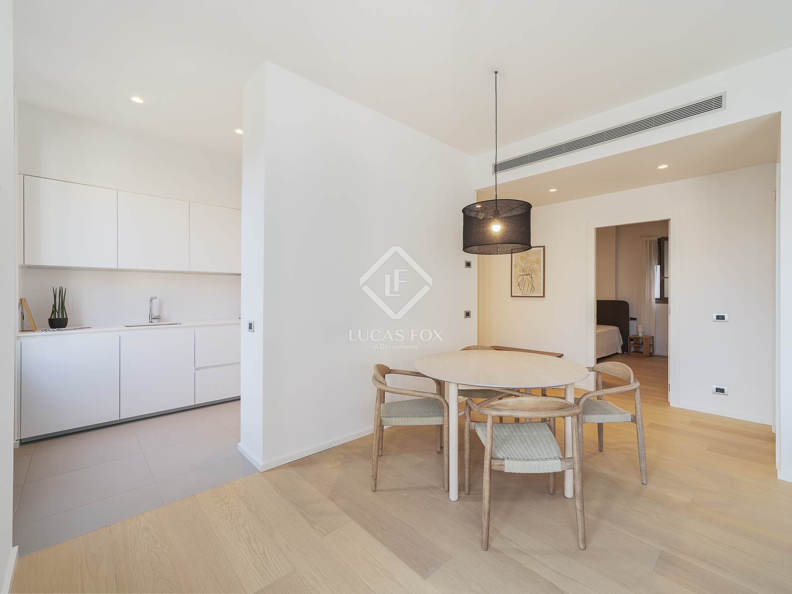 This particular unit is one of four standard two-bedroom homes located in the interior part of the building, ensuring a quiet and private residence. While the interior is newly constructed, the building retains the striking original main staircase and its skylight, preserving the graceful presence of a historical Barcelona building.