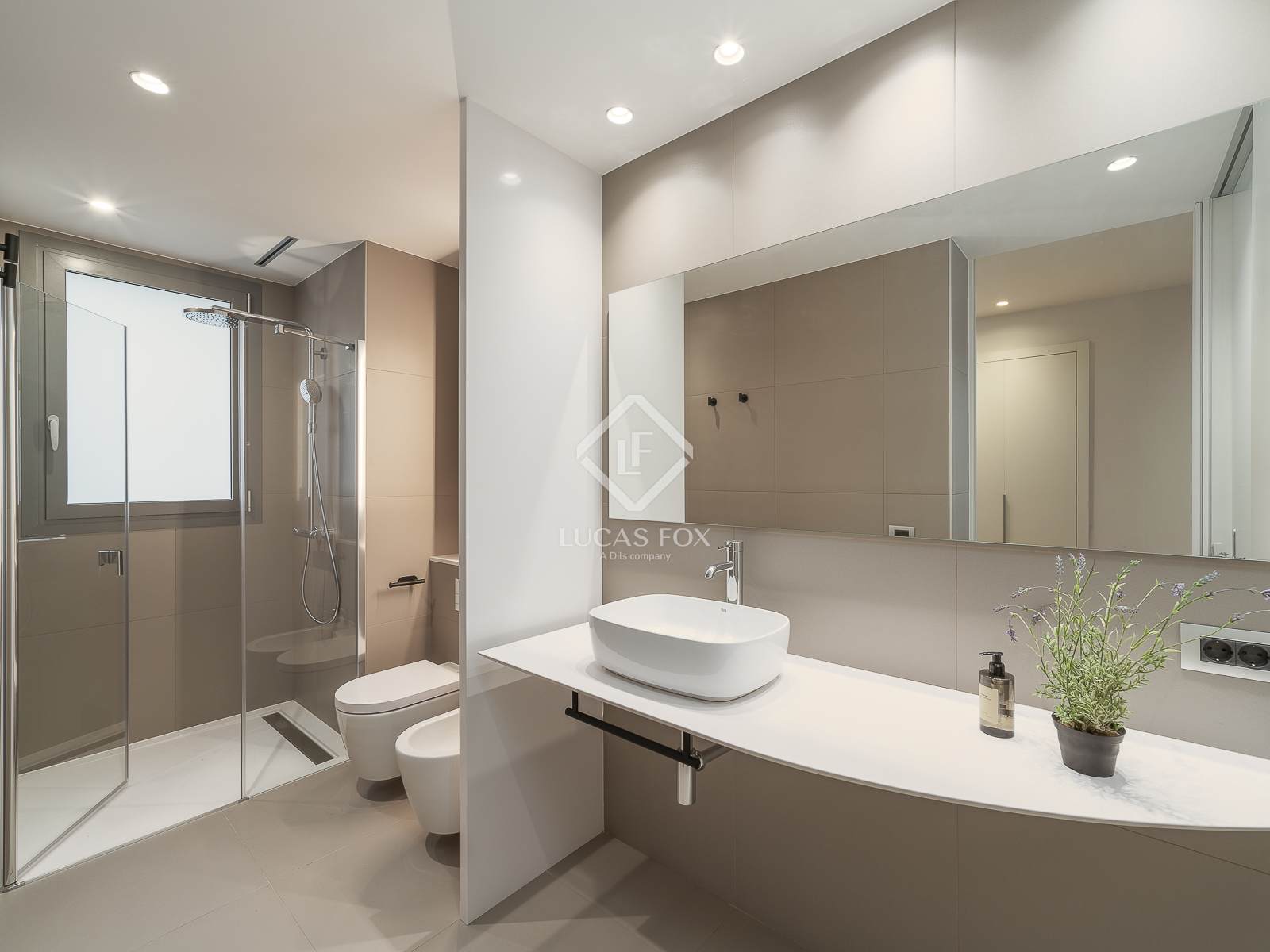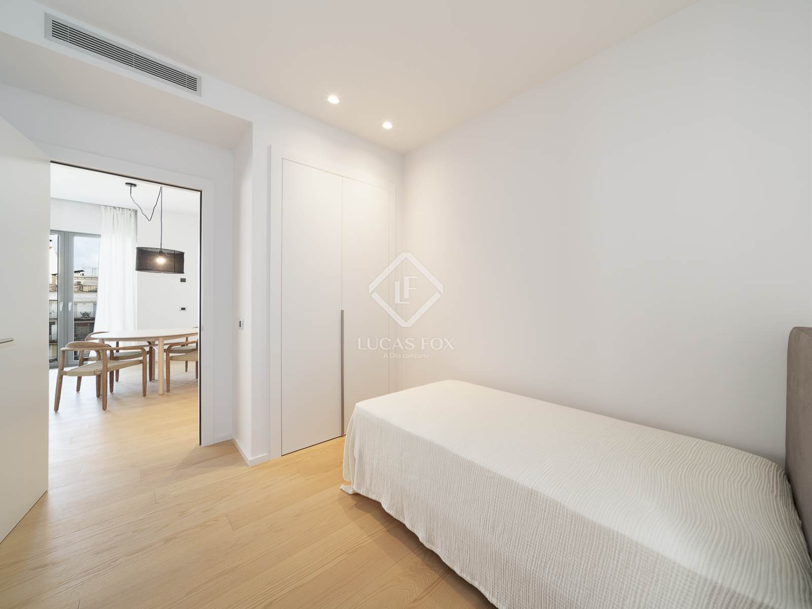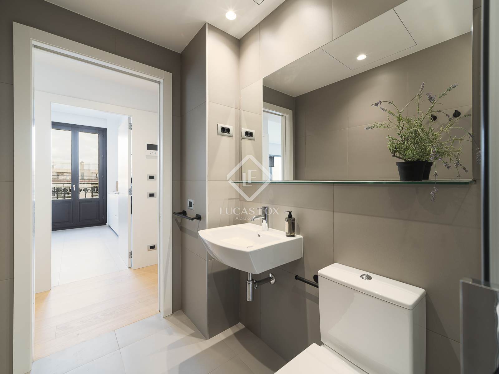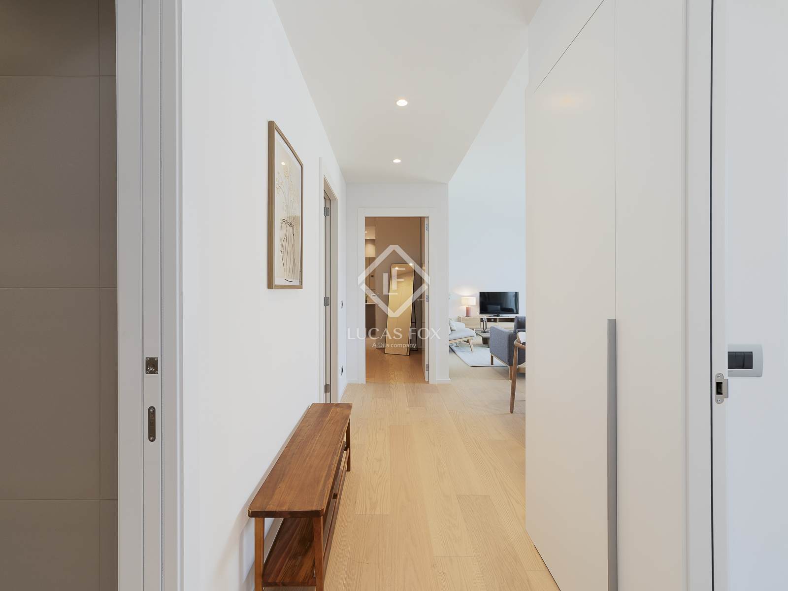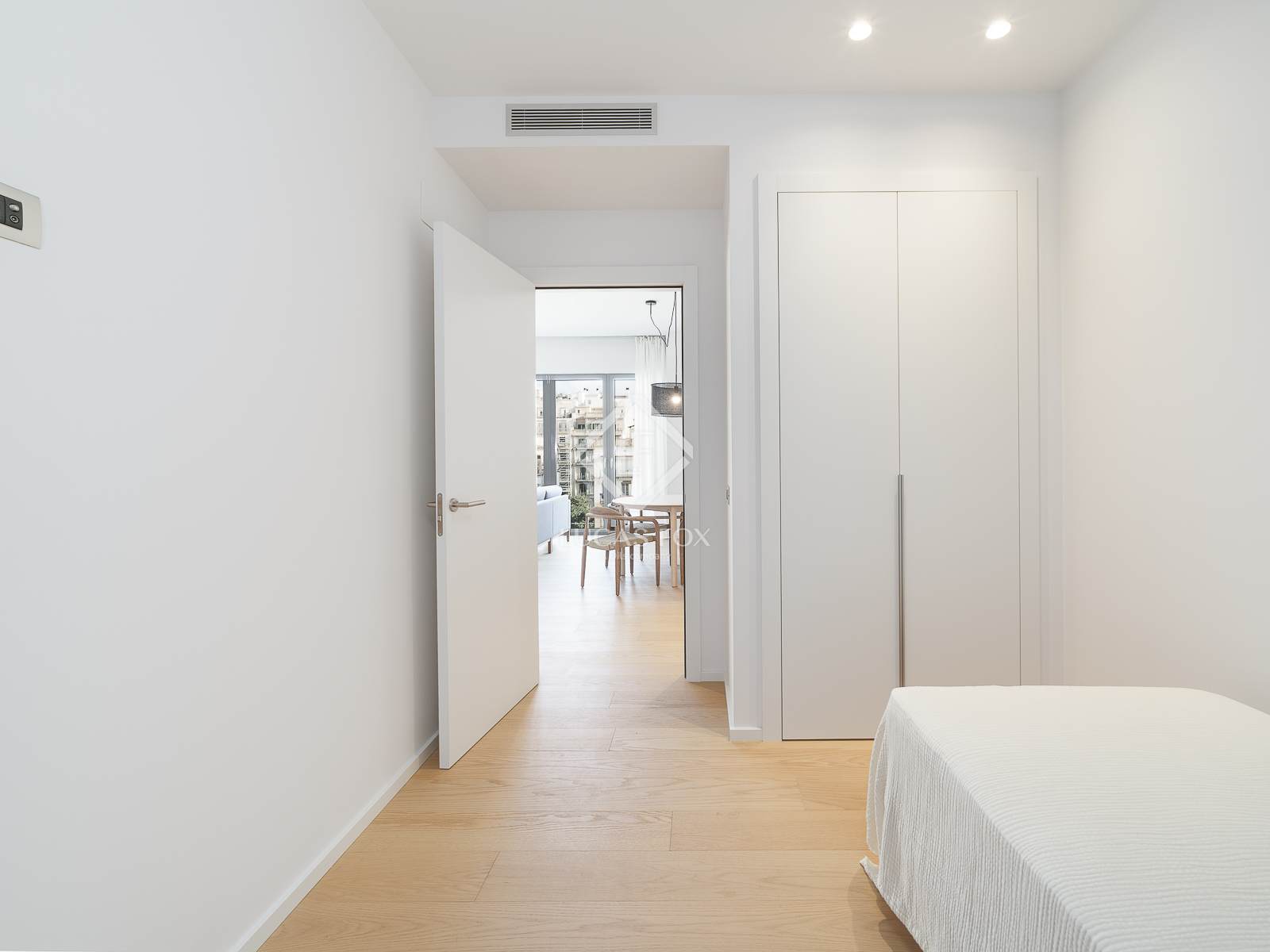 This particular unit is one of four standard two-bedroom homes located in the interior part of the building, ensuring a quiet and private residence. While the interior is newly constructed, the building retains the striking original main staircase and its skylight, preserving the graceful presence of a historical Barcelona building.