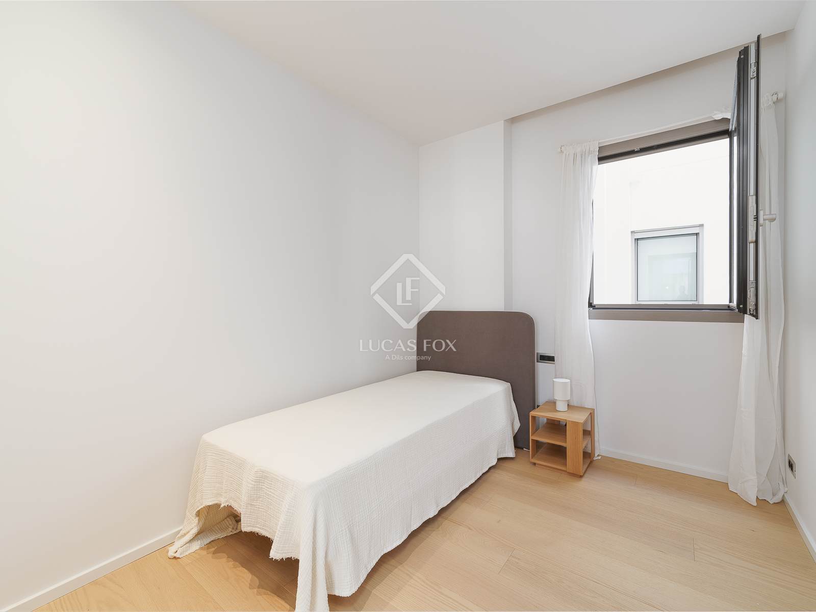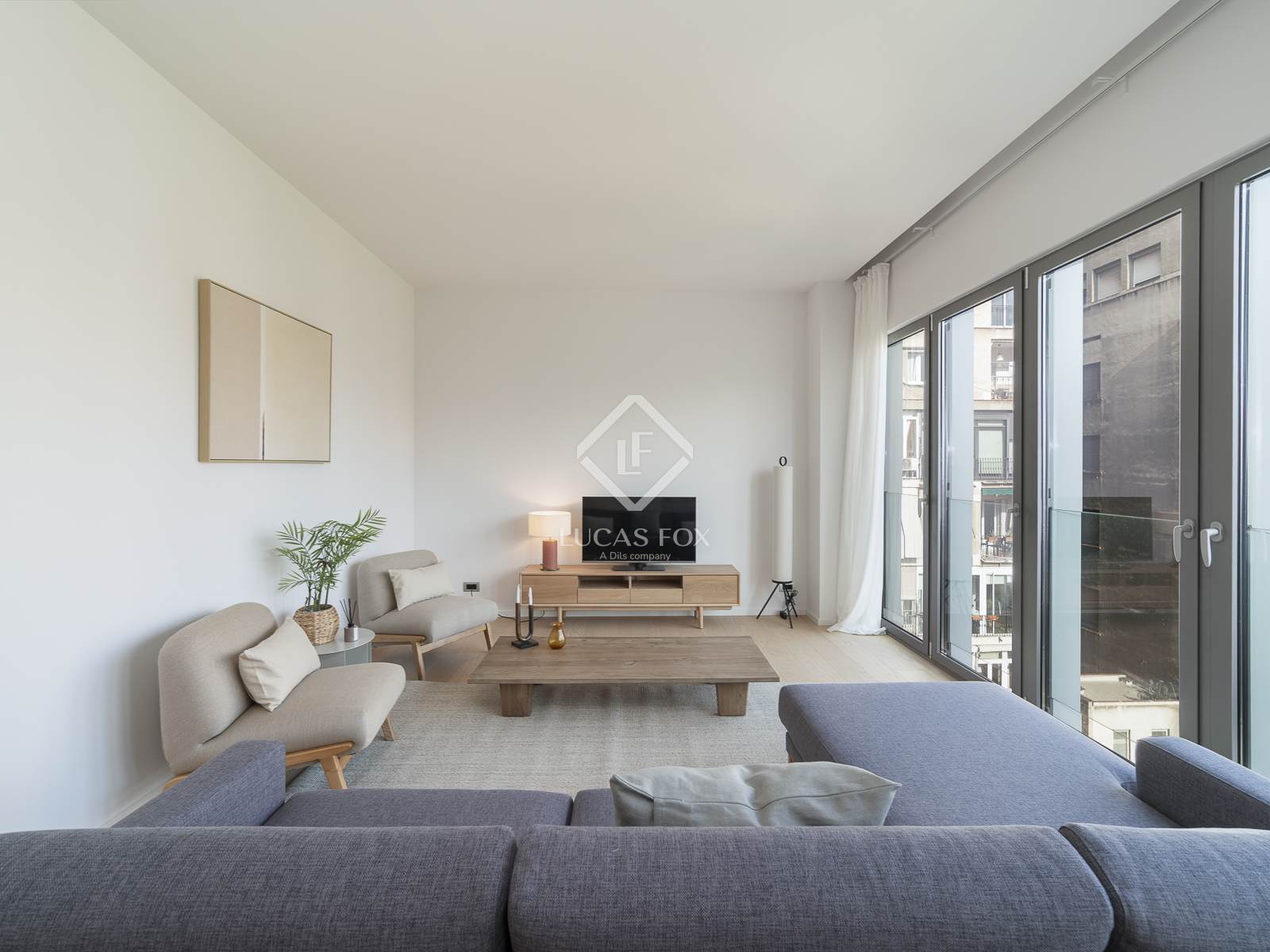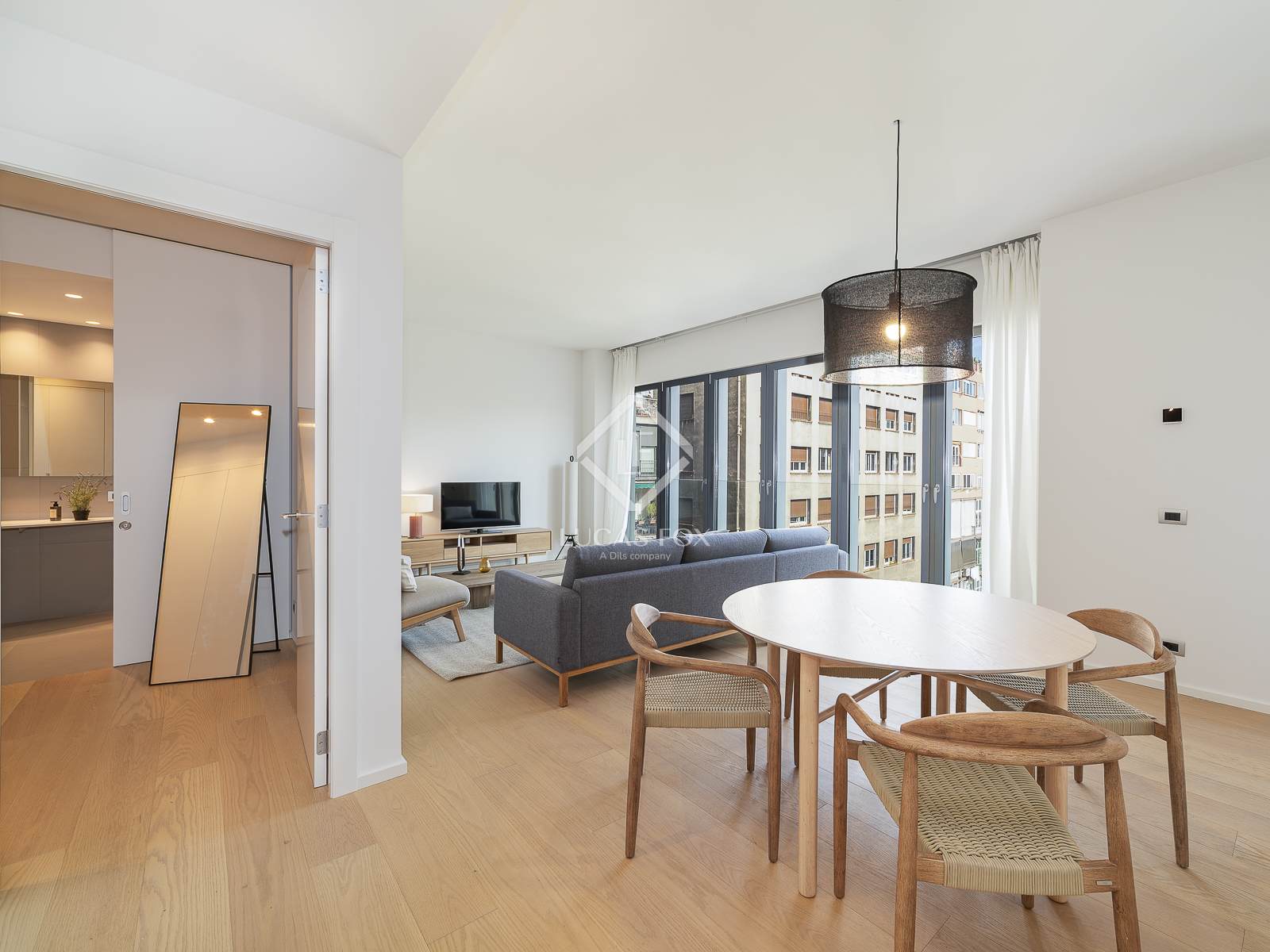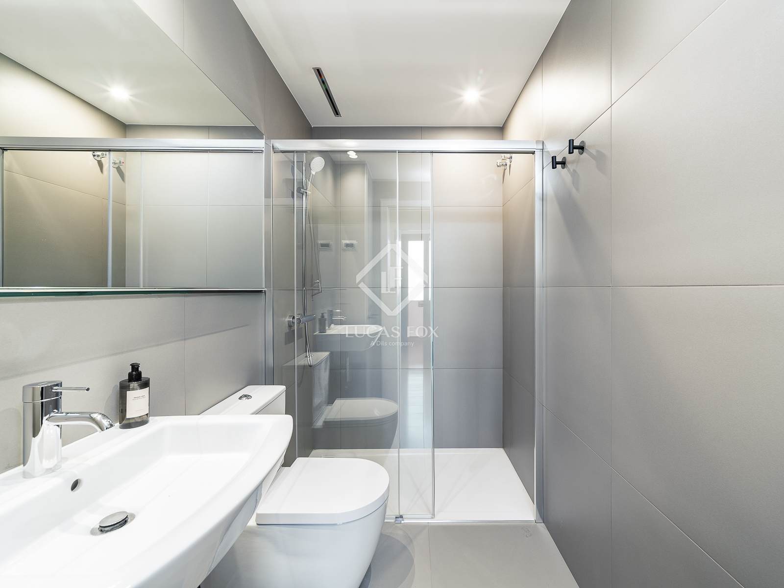 This particular unit is one of four standard two-bedroom homes located in the interior part of the building, ensuring a quiet and private residence. While the interior is newly constructed, the building retains the striking original main staircase and its skylight, preserving the graceful presence of a historical Barcelona building.