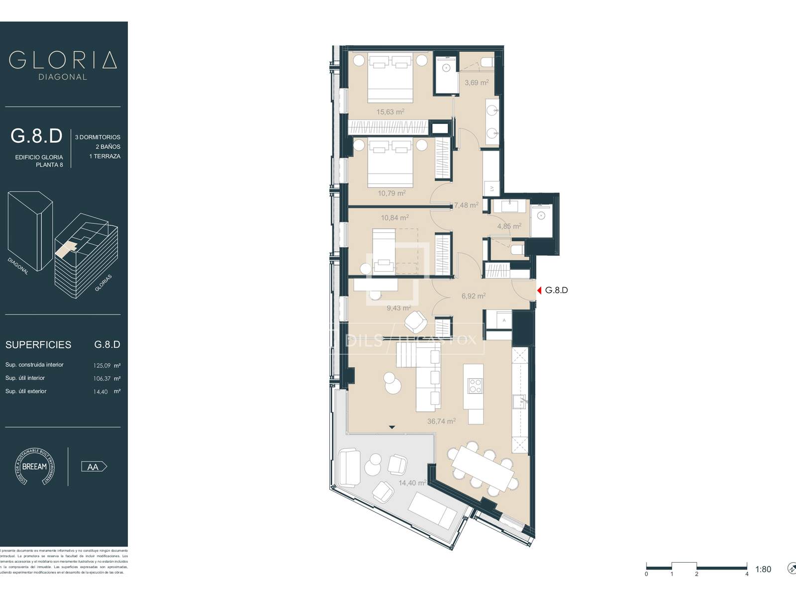 This particular residence is located on the eighth floor of the Glòries building and offers three bedrooms, a versatile studio that can be used as an additional bedroom, and two bathrooms, with 125 m² of interior space and 14 m² of private outdoor space.
