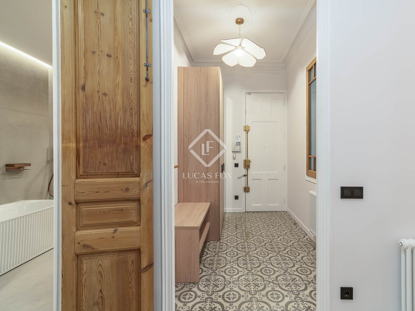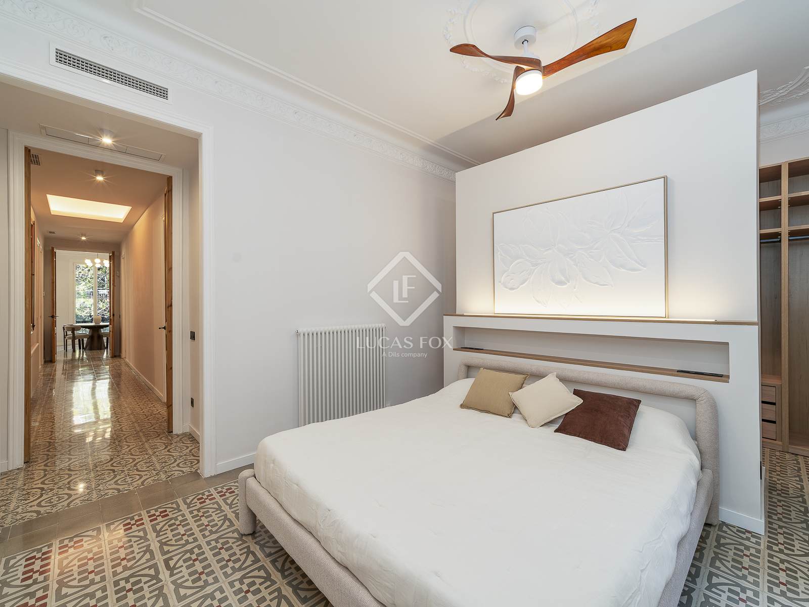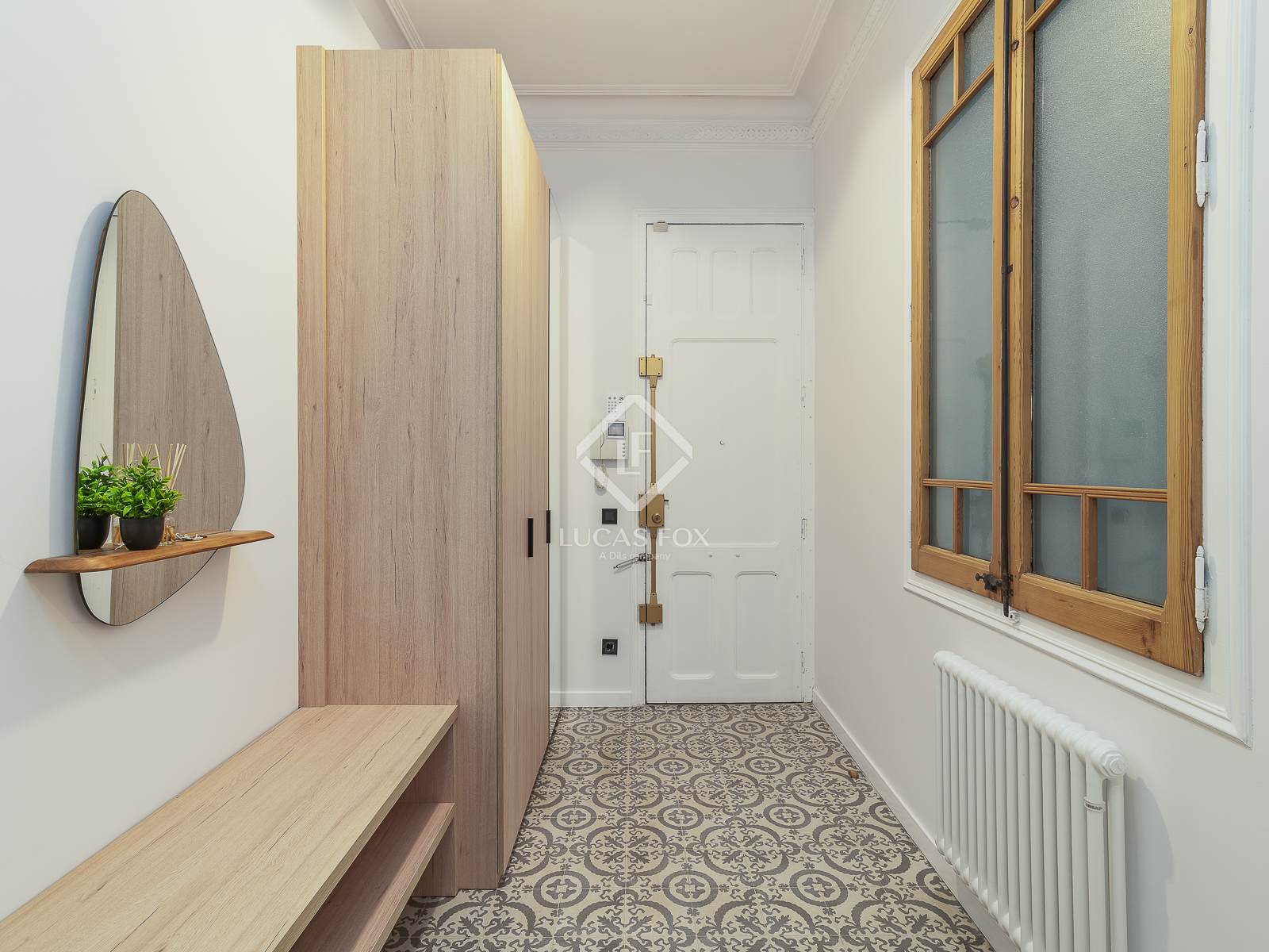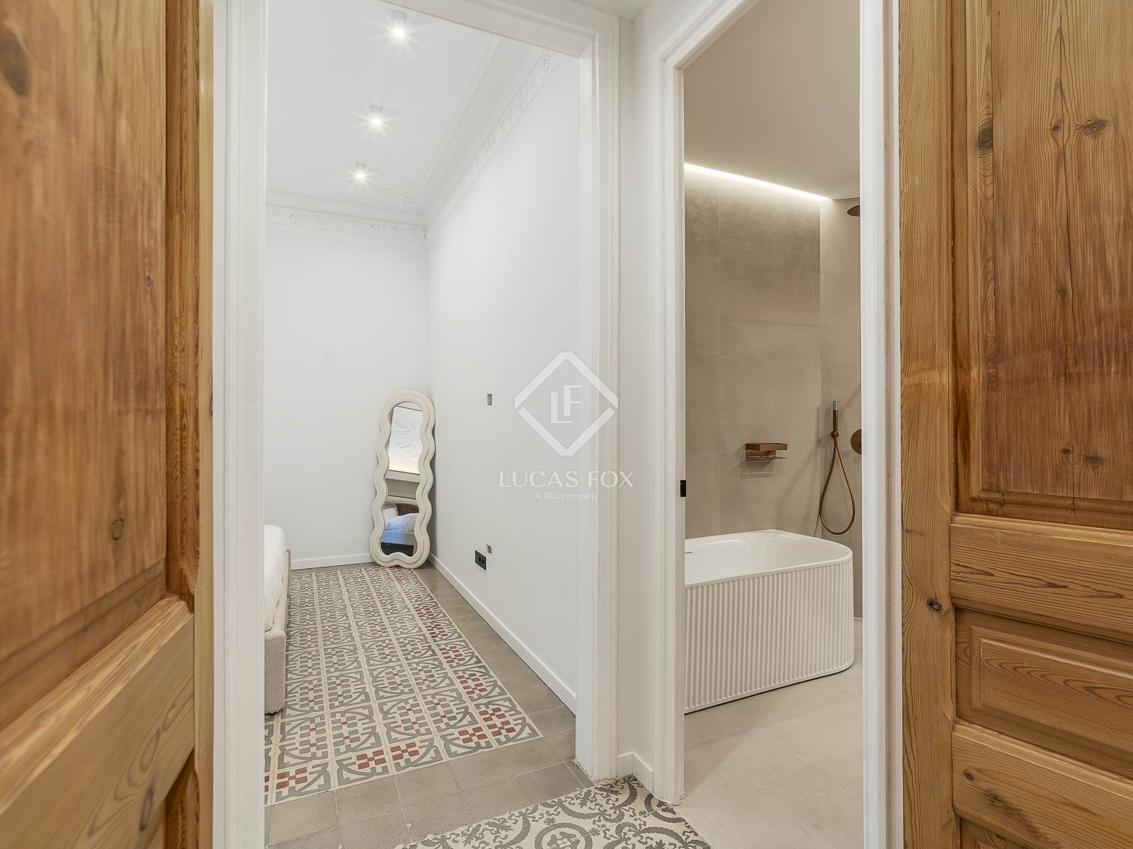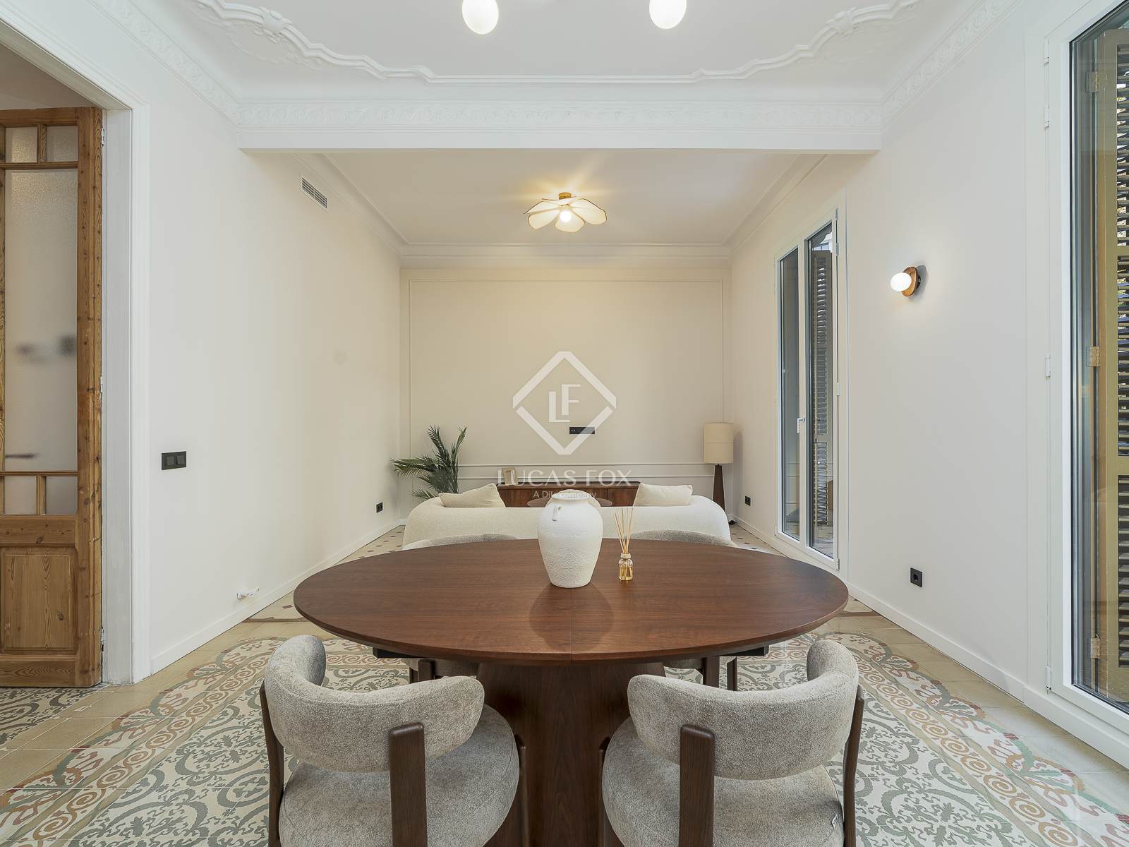 Spectacular 136 m² apartment in a period building located in the heart of Eixample. It features a renovation with high-quality finishes, three en-suite bedrooms, an open kitchen with an island, and a bright dining room living room with access to a balcony.
