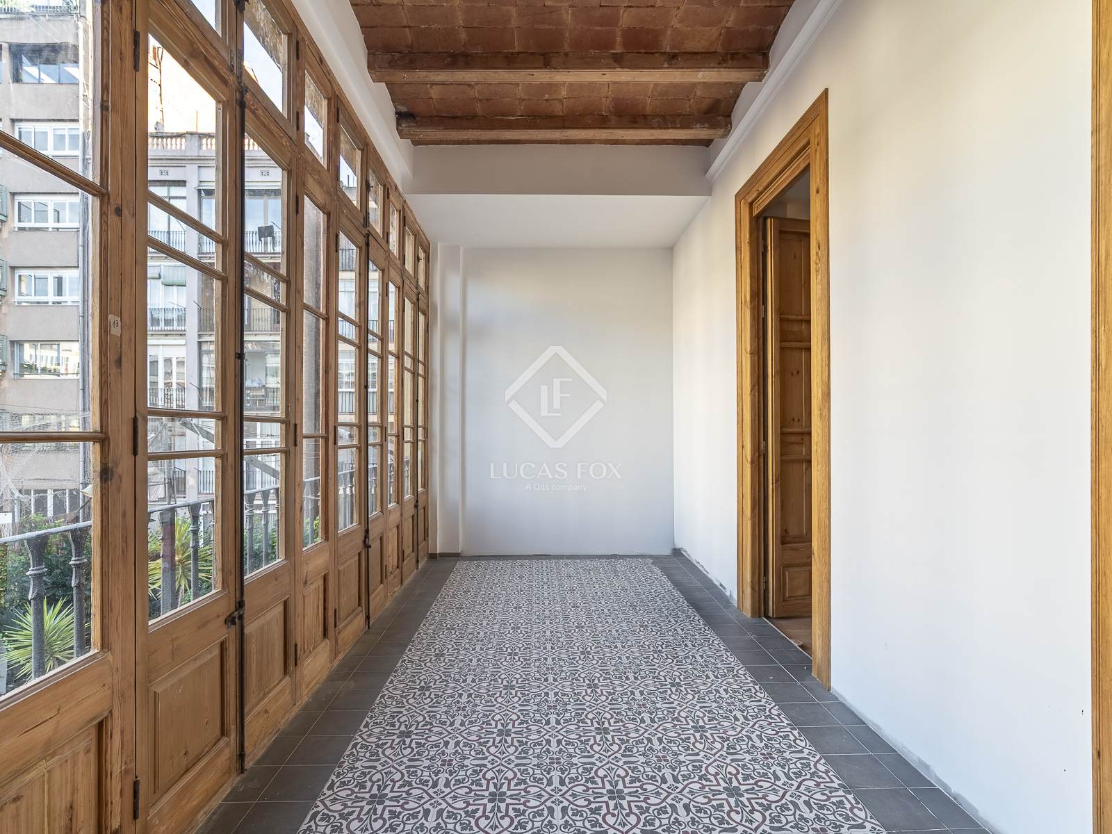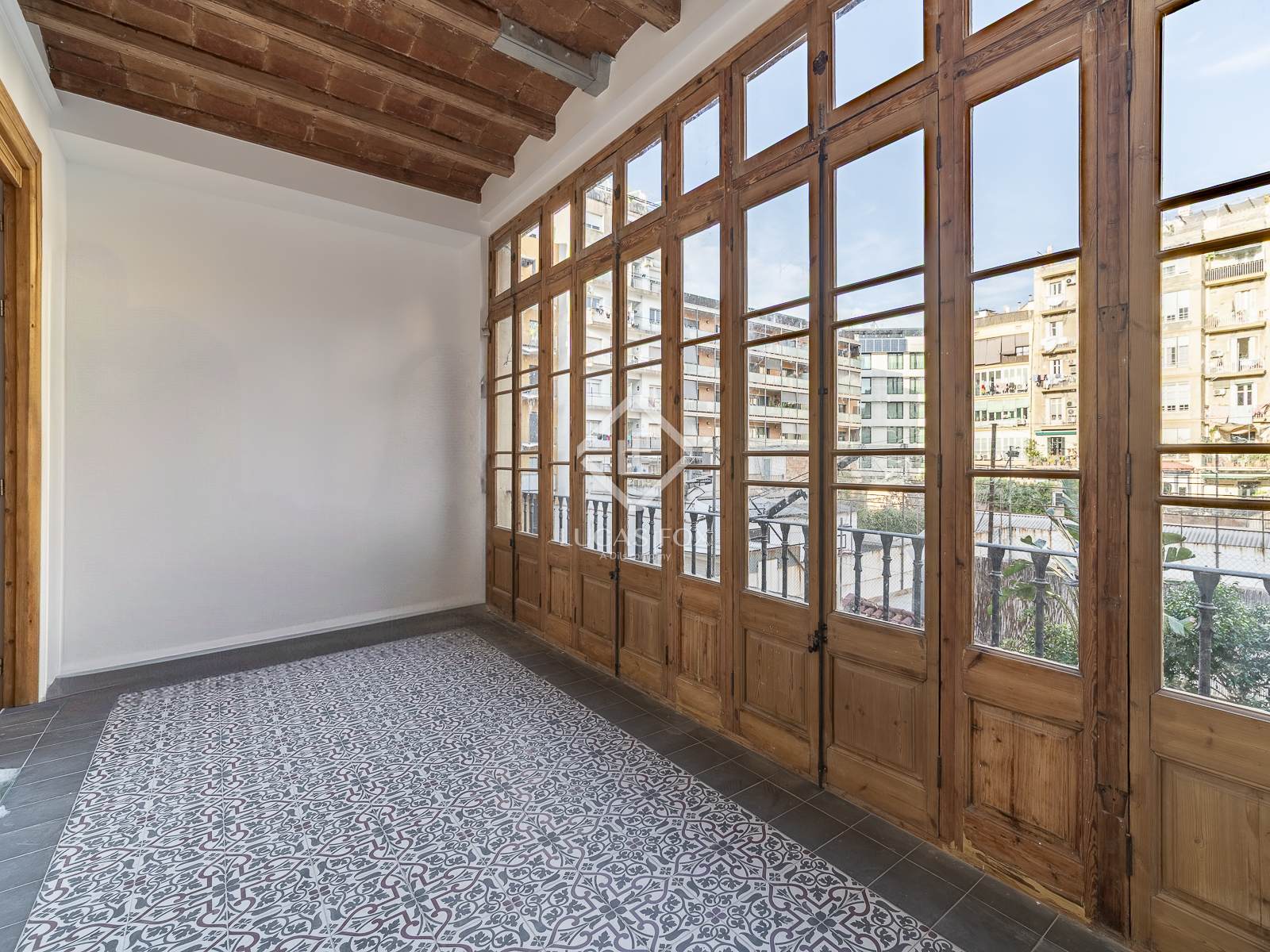 Perhaps the most enchanting element of this property is the large gallery located at the rear. This expansive, enclosed space serves as a secondary living or dining area, providing a tranquil haven. It overlooks an idyllic, quiet plaza, a rare and coveted feature in the bustling heart of Eixample. This vantage point offers a peaceful, green escape from the city, perfect for relaxation or entertaining.
