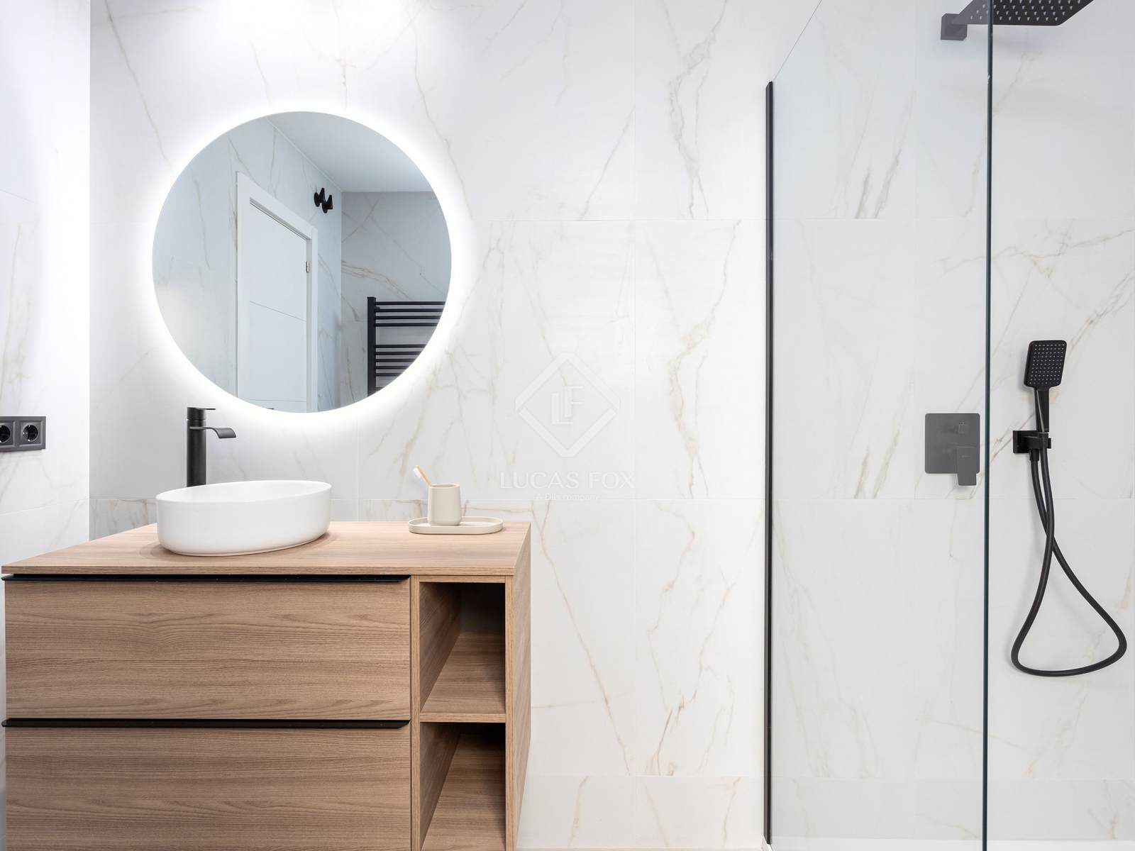 The property features two complete bathrooms with matte porcelain tiles, recessed faucets, and LED lighting.