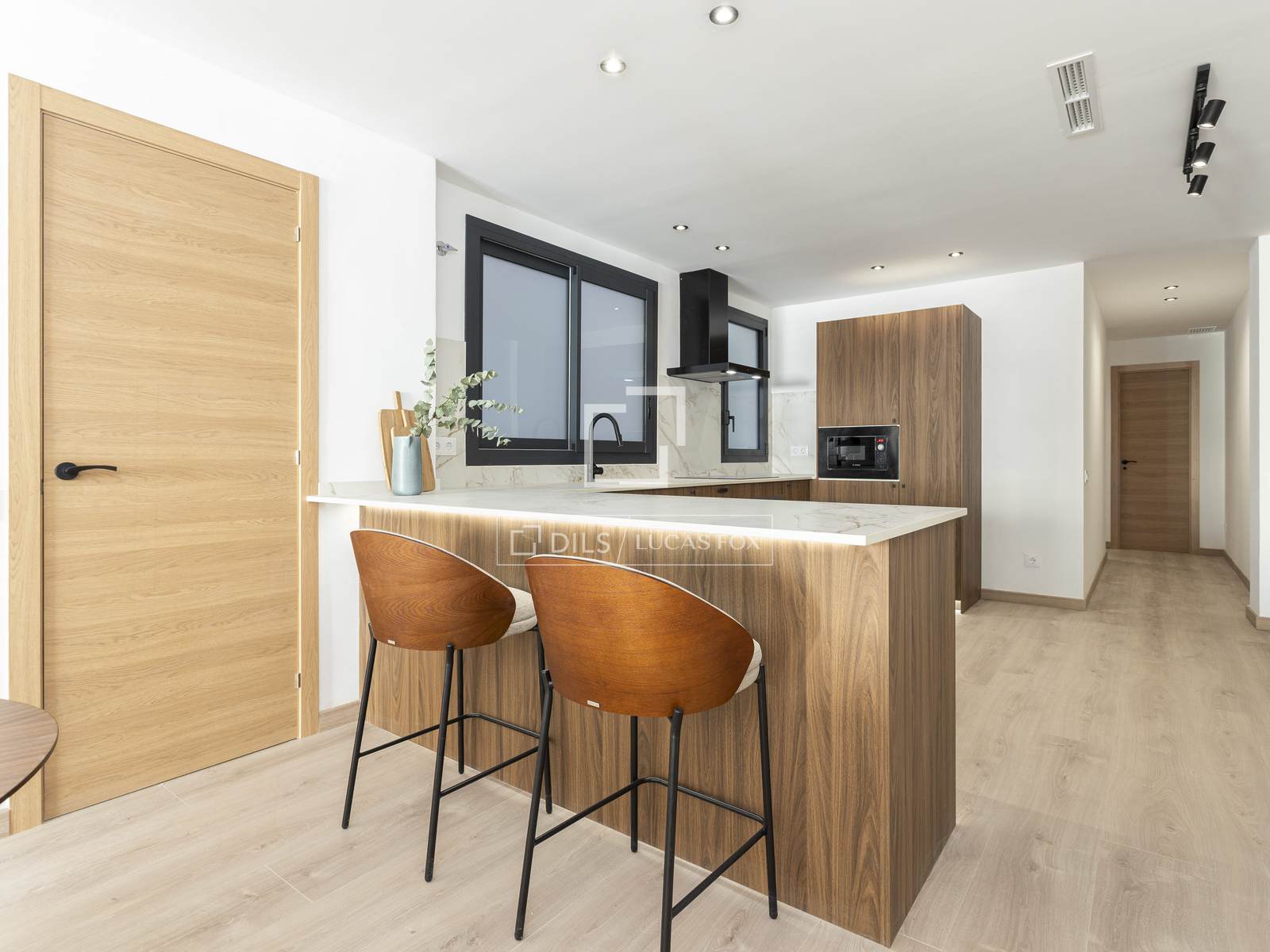 The open-plan kitchen, with its modern and functional design, blends seamlessly into the space thanks to a practical peninsula. It is equipped with Bosch appliances —oven, induction hob, dishwasher, extractor hood, and microwave—and features an elegant Dekton by Cosentino worktop with a matte finish.
