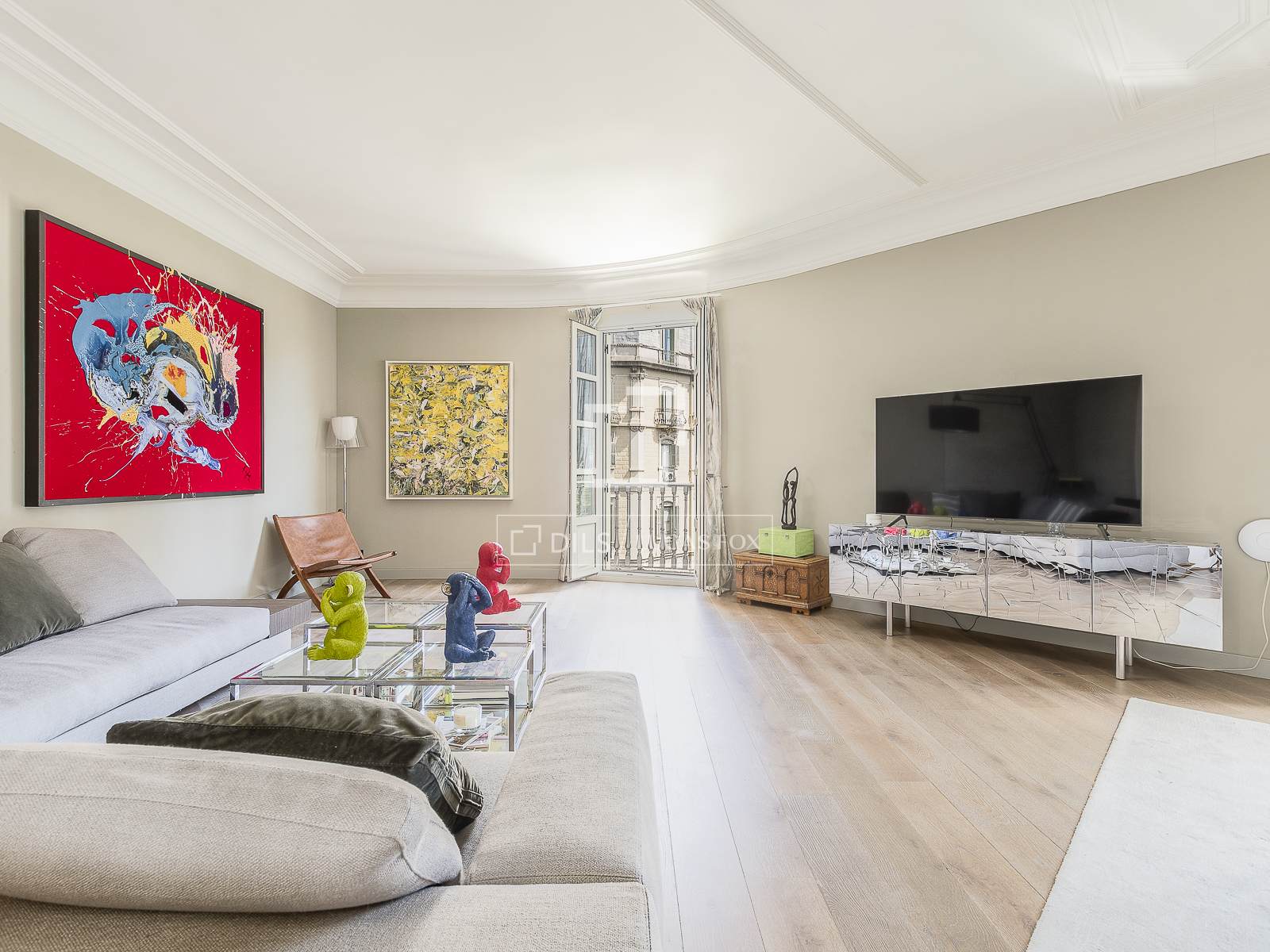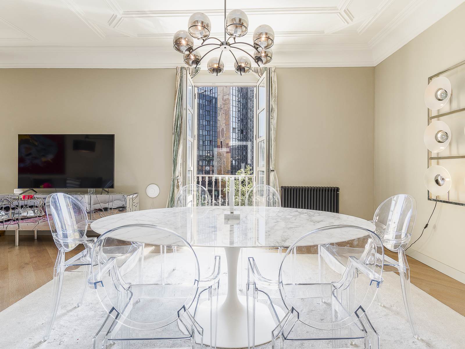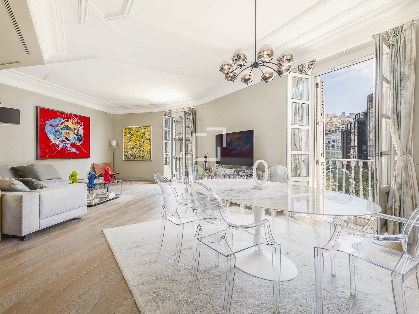 The expansive living and dining area provides a sophisticated setting for both relaxation and entertaining. Large windows and a charming balcony flood the space with natural light while offering delightful views over Rambla de Catalunya.