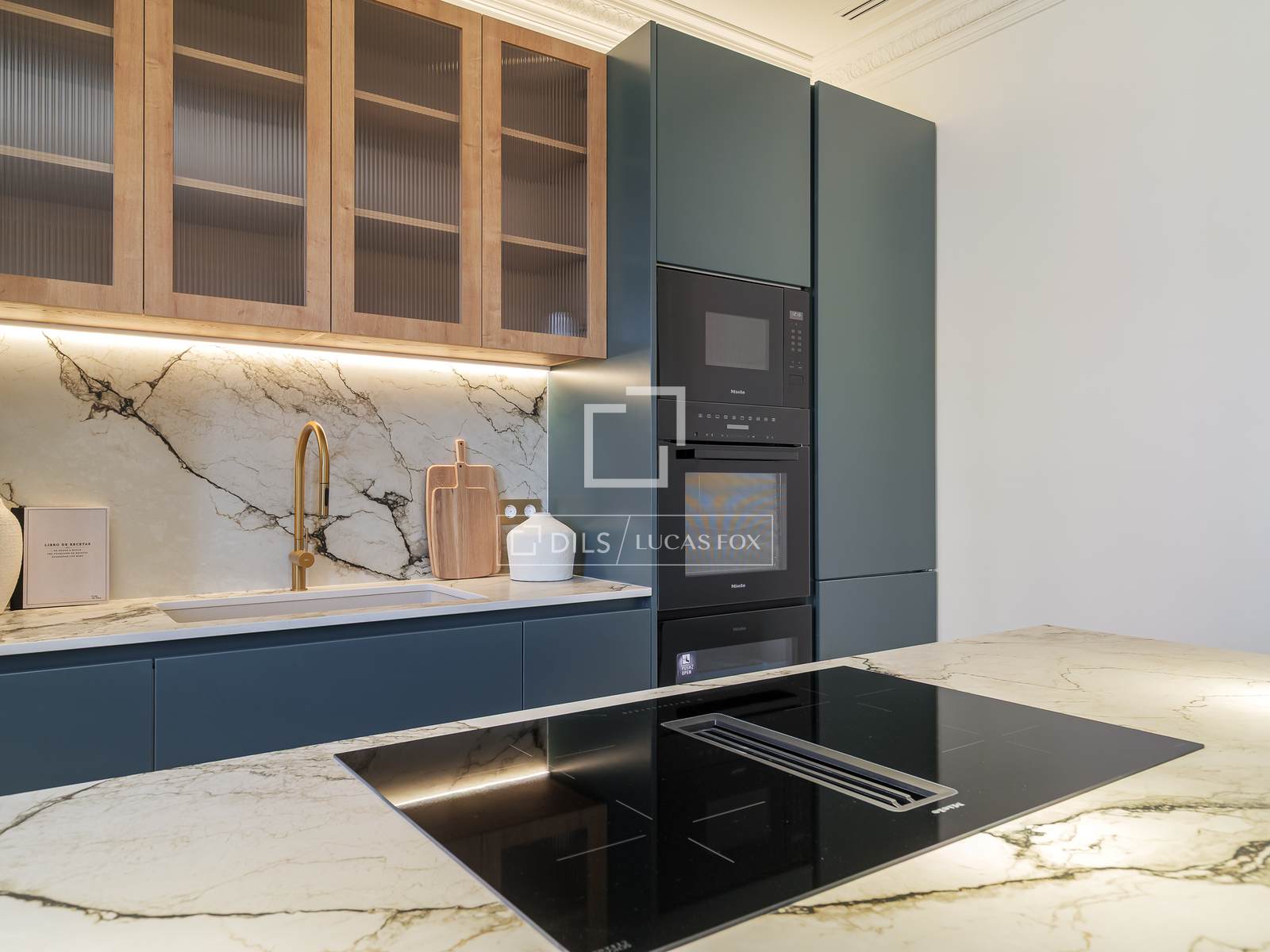 • Kitchen with lacquered and wood cabinetry.