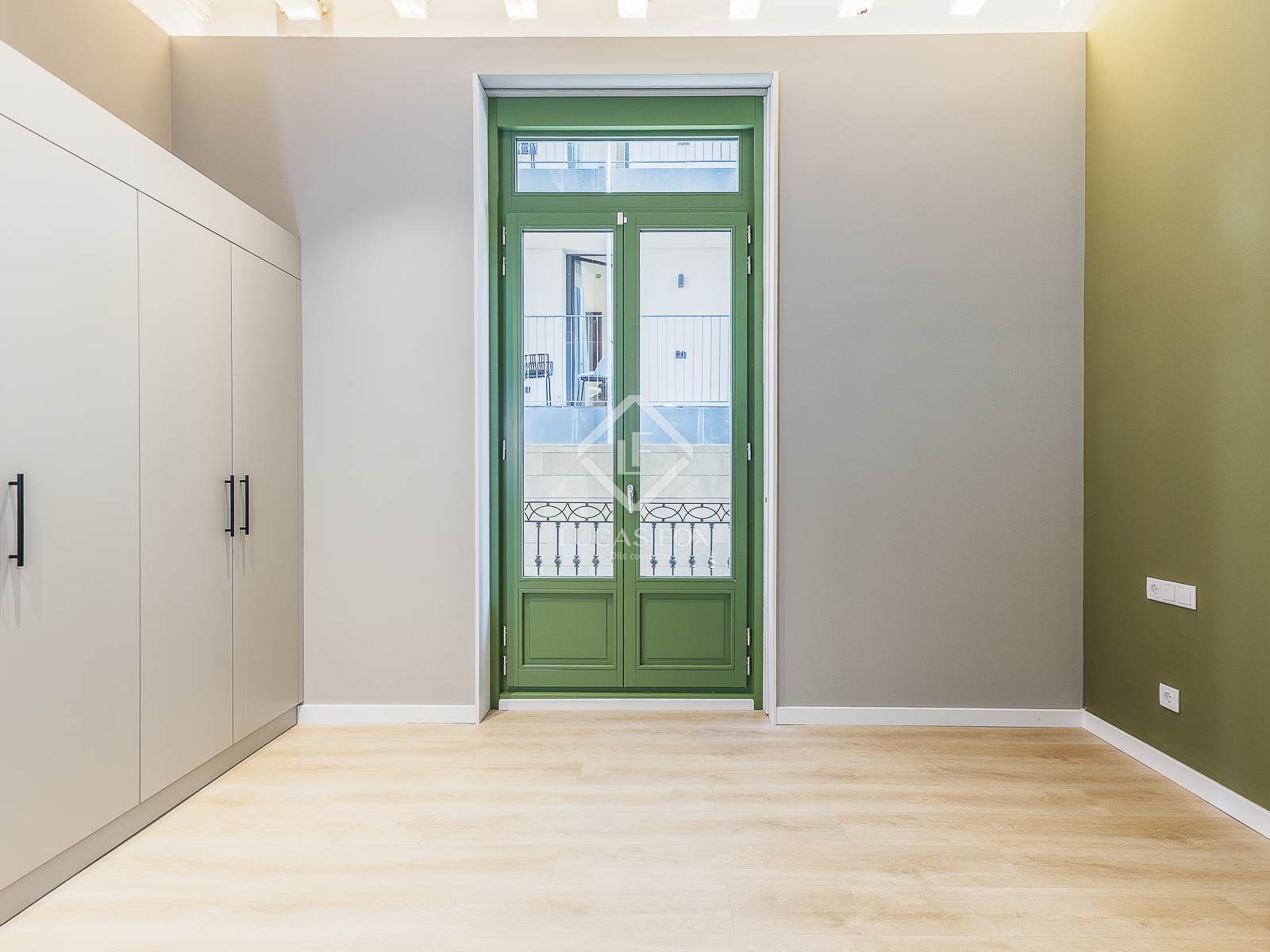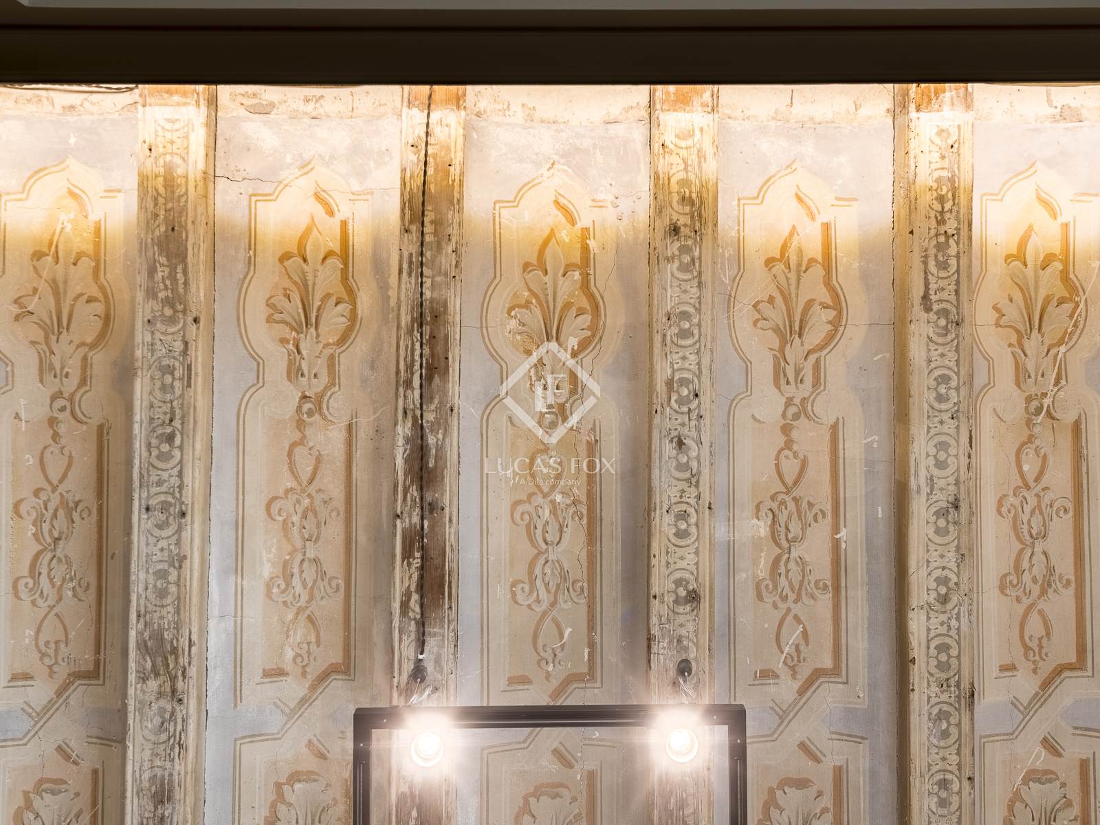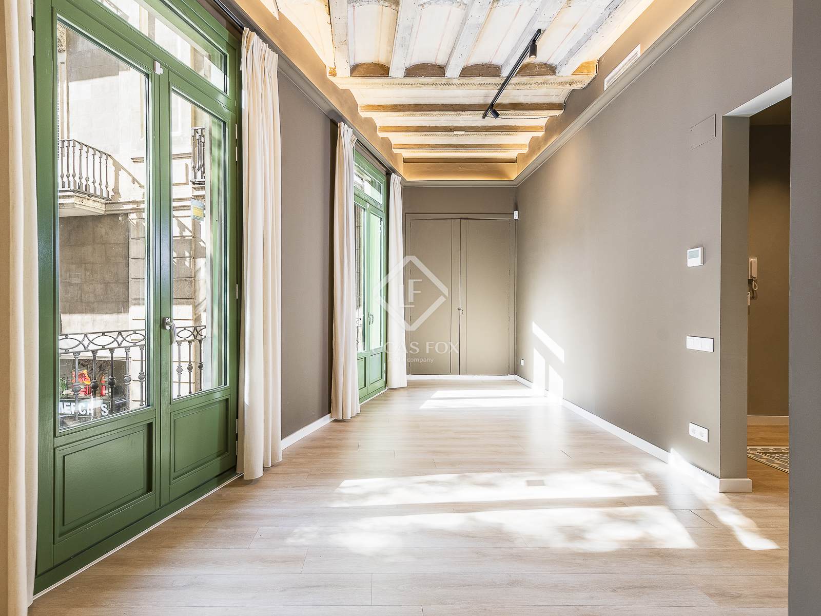 The apartment stands out for its exposed ceiling, featuring the traditional Catalan vaulting (rooftop), and its original frescoes, giving it a unique and authentic character. The southerly aspect floods the spacious 40 m² dining room living room with natural light, which boasts five large balconies offering direct views of Las Ramblas, an area undergoing urban transformation that gives greater prominence to pedestrians.