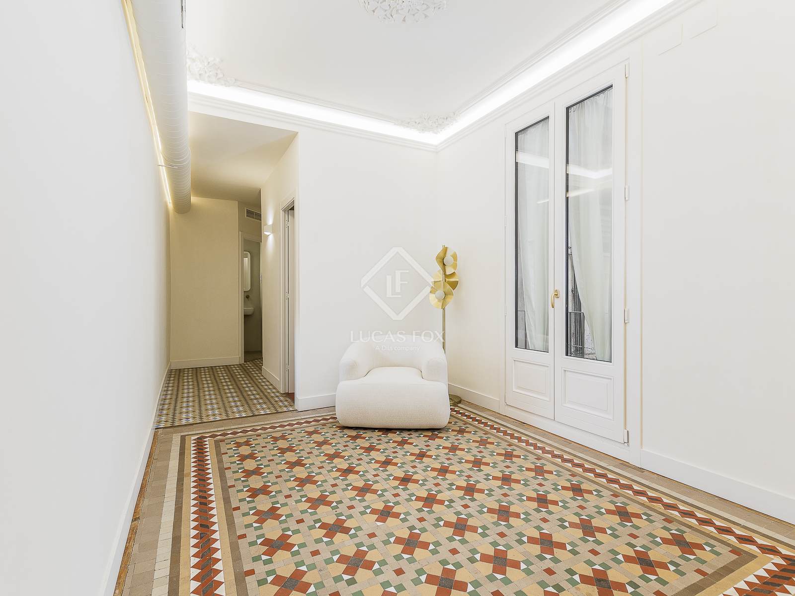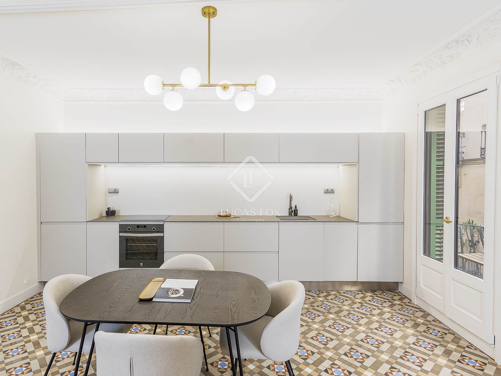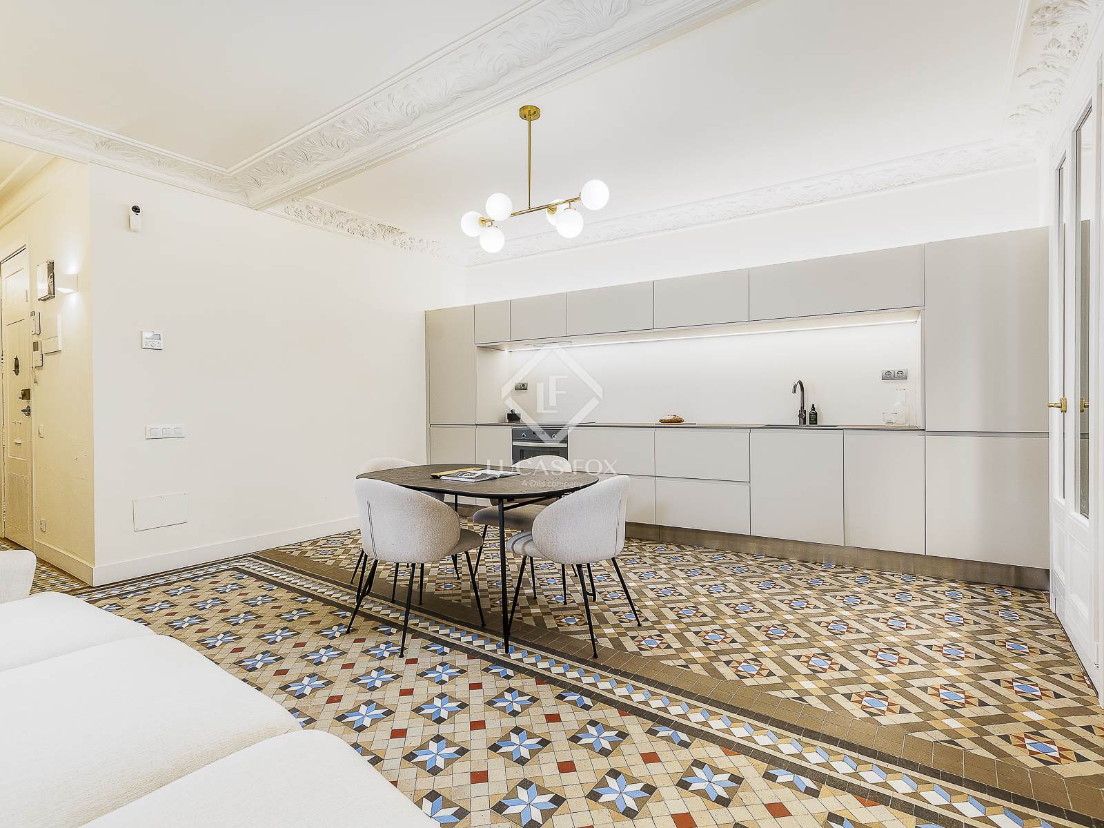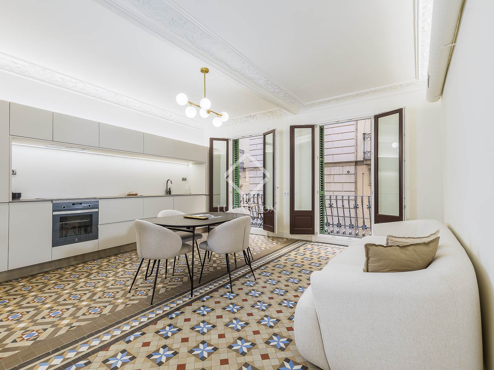 Newly renovated apartment with a unique style inspired by Casa Burés, where modernist elegance blends with contemporary comfort. With a surface area of 77 m² according to a recent floor plan, this property stands out for its thoughtful layout and high-quality design.