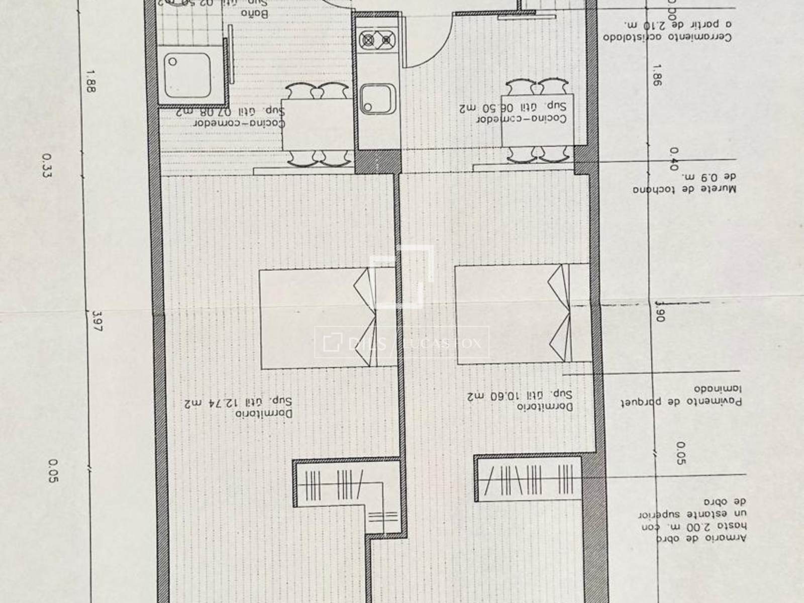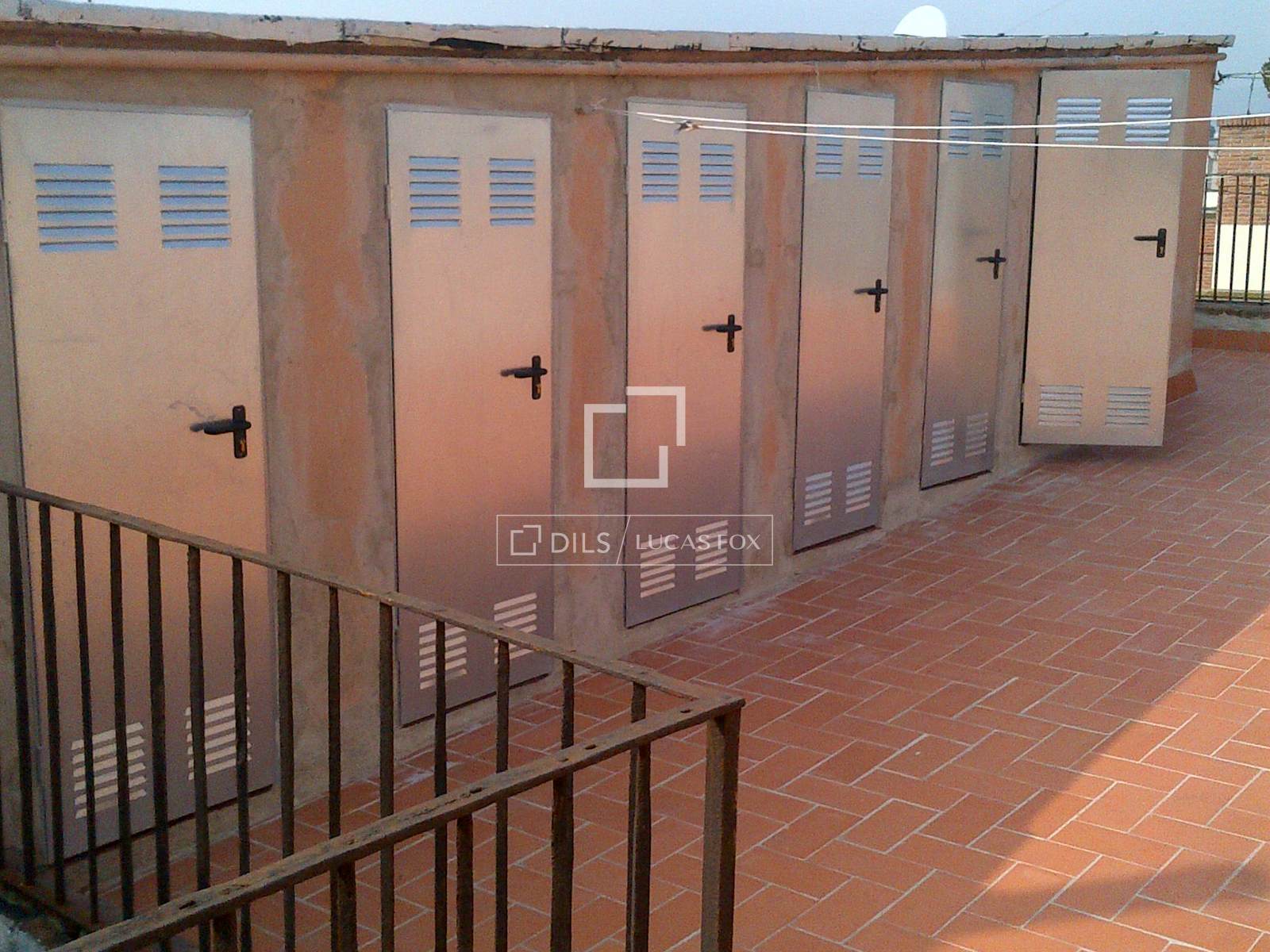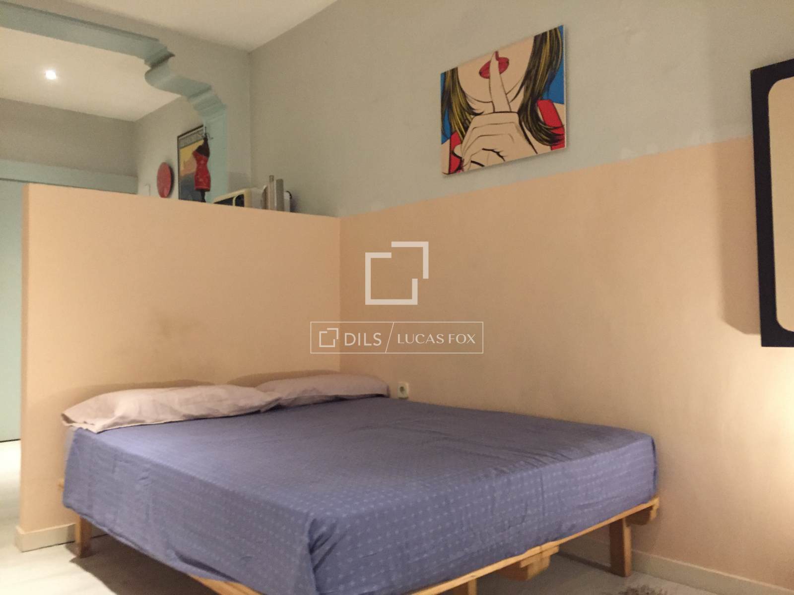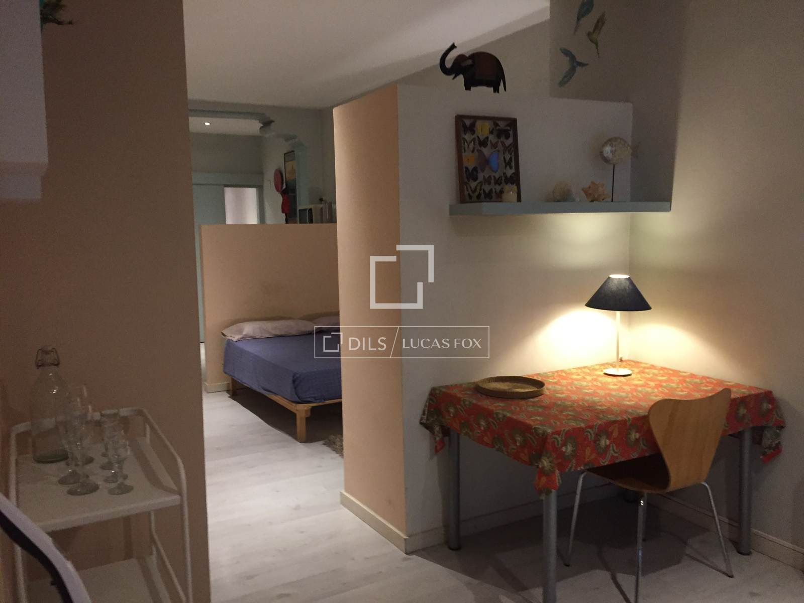 The apartment is situated on the first floor, facing the interior of the building, ensuring privacy and quiet, and features a large private terrace. The layout is currently divided into two studio units, each with its own kitchenette, sleeping area, wardrobe, and access to an interior terrace area, ideal for rental flexibility or future reconfiguration.