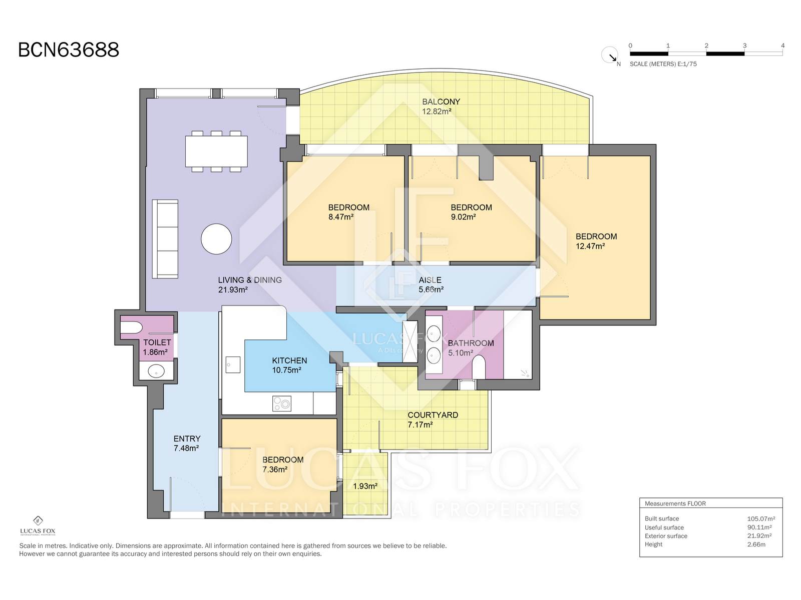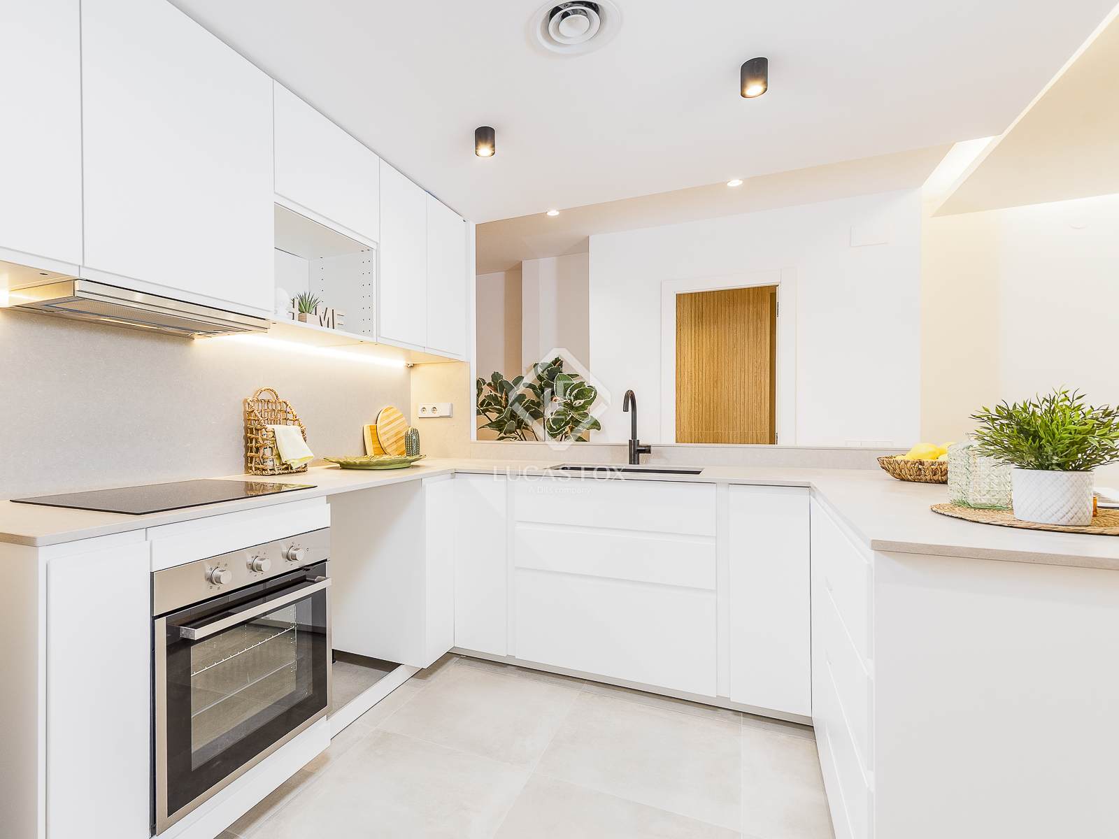 We enter the property through a small entrance hall. On the right, we find a bedroom, perfect as an study or study, and a guest toilet. Connected to the entrance hall is the living area. This consists of a spacious dining room living room that leads to the open-plan kitchen, with a large American-style island and access to a small courtyard, which can be used as a utility area. From the living room, we access a large 12 m² balcony.