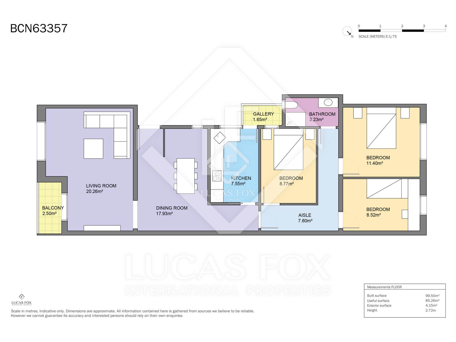 The property has a constructed area of 99.5 m² and a usable area of 85.3 m². It features a spacious and bright living room of over 20 m² with access to a sunny balcony, a separate dining room , and a practical kitchen with an adjoining utility room. The night area offers three bedrooms, one double and two singles, and a full bathroom .