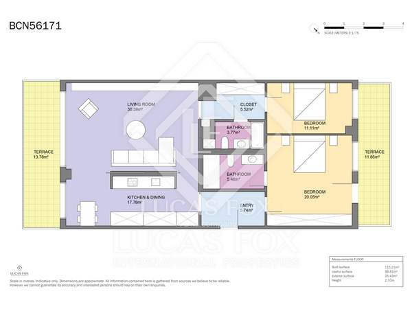 The pleasant 63 m2 living room is very bright and is divided in a functional and comfortable way between the dining area and the chill-out area. It also has access to a charming 9 m2 balcony with sun for most of the day.