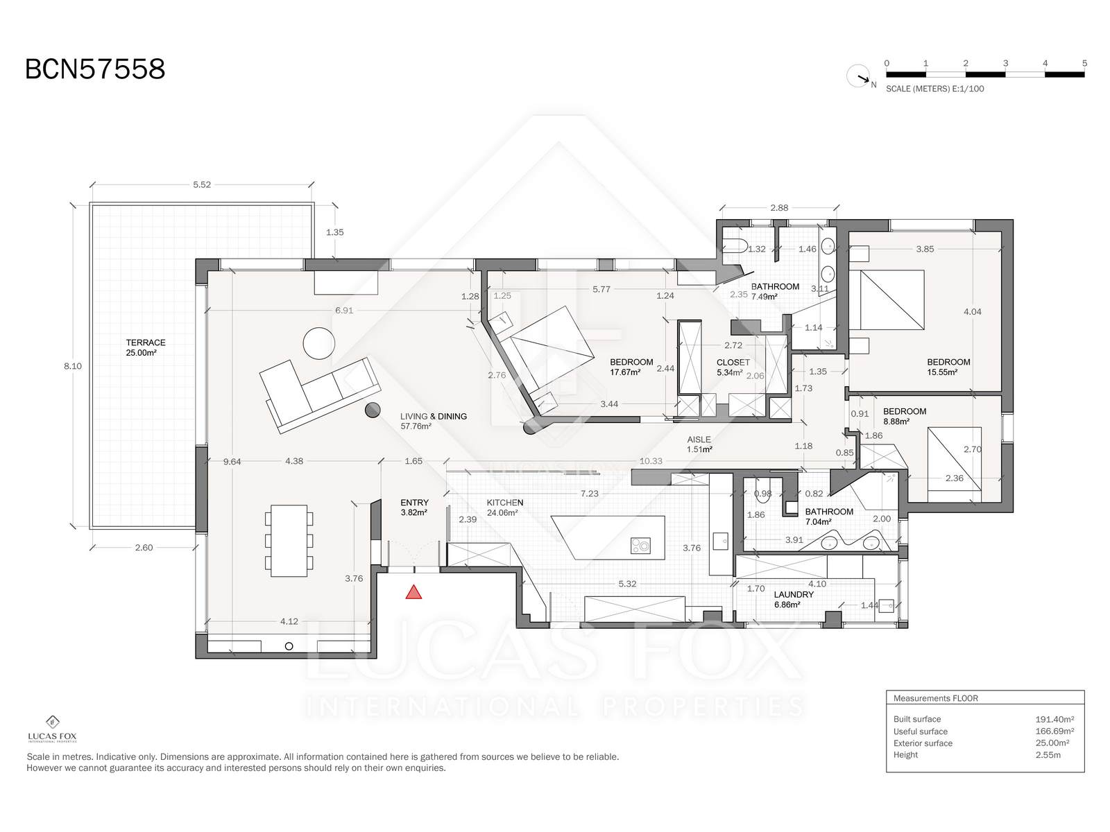 In the night area, we find a main bedroom suite with a full bathroom and dressing area, two additional double bedrooms, and a second full bathroom . The entire apartment features large windows that allow for natural light, unobstructed views, and an atmosphere of peace and serenity thanks to the height of the property and its distance from the neighboring properties.