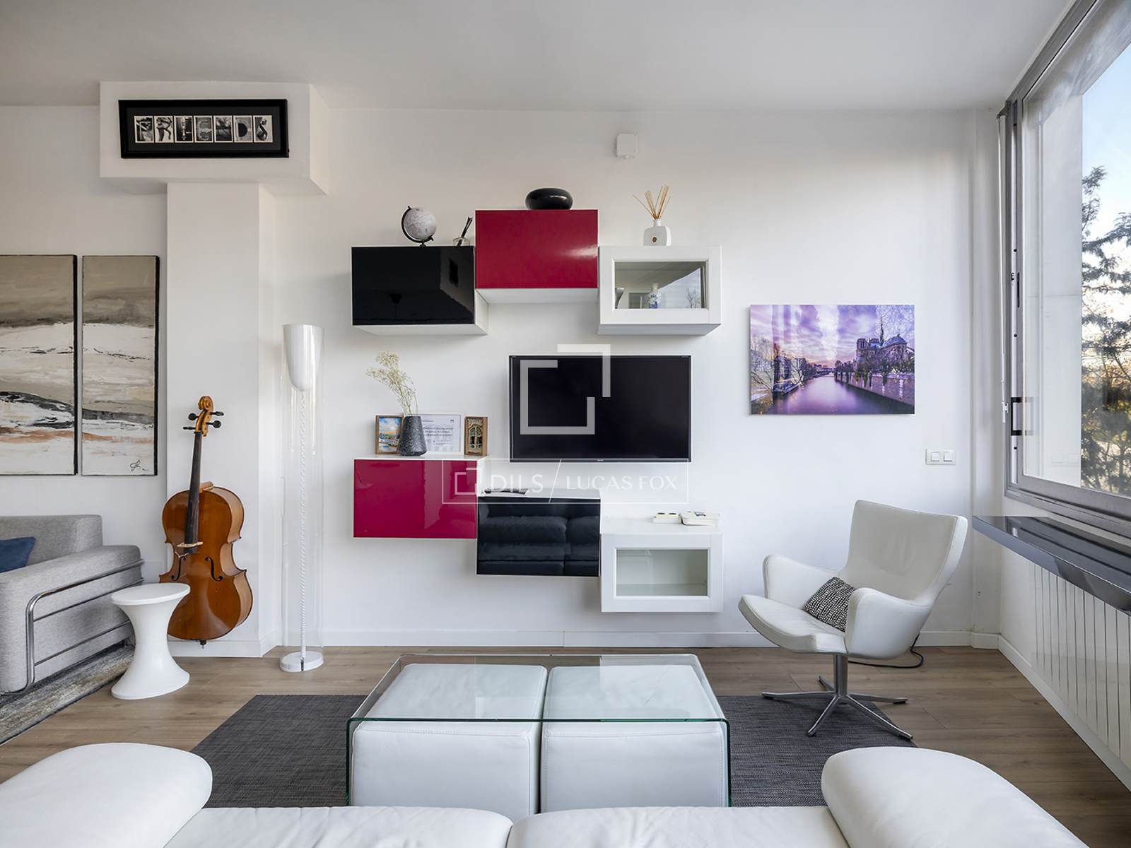 One of its most striking features is the large window, which opens almost completely, transforming the interior space and creating a direct connection with the exterior. The views are simply exceptional: lush greenery, spaciousness, and absolute privacy overlooking the park. The feeling is one of being outside the city, enjoying only the vegetation, despite being just minutes from the centre. Its orientation guarantees pleasant afternoon sun, adding warmth and brightness to the space, while the three-meter-high ceilings enhance the perception of spaciousness and elegance.