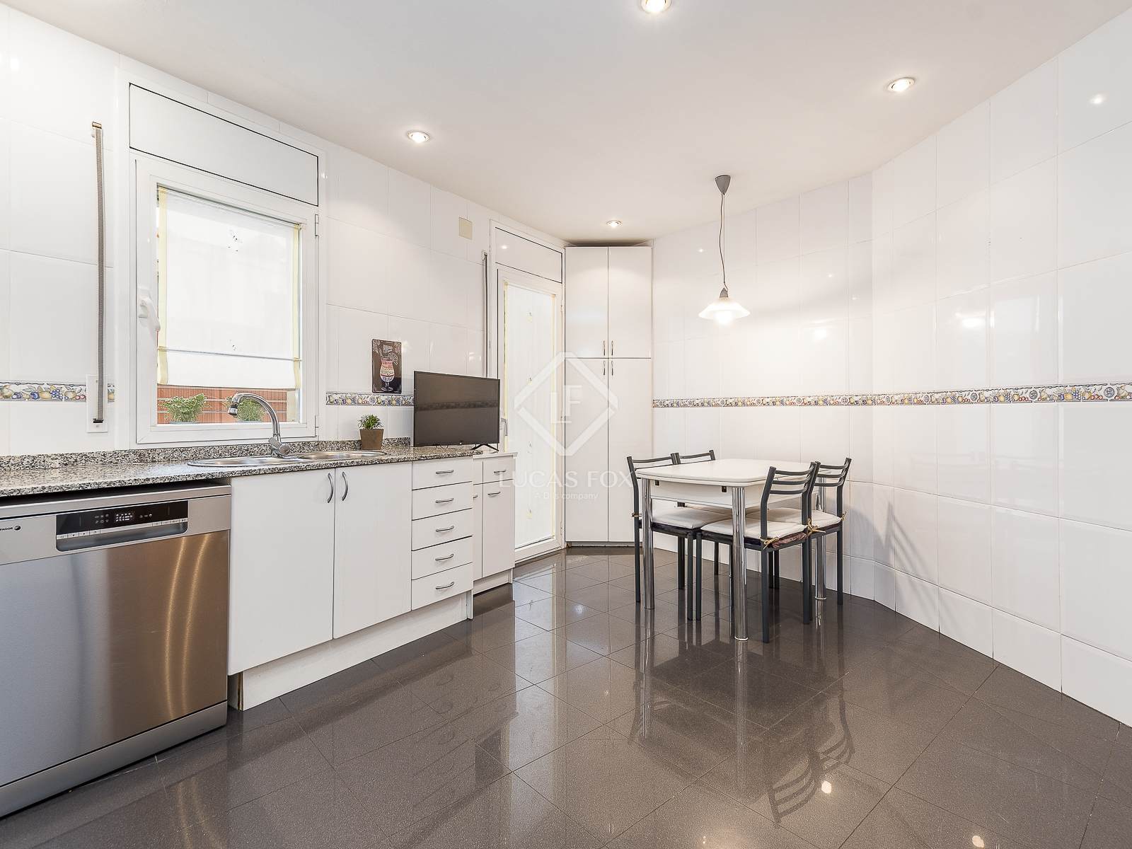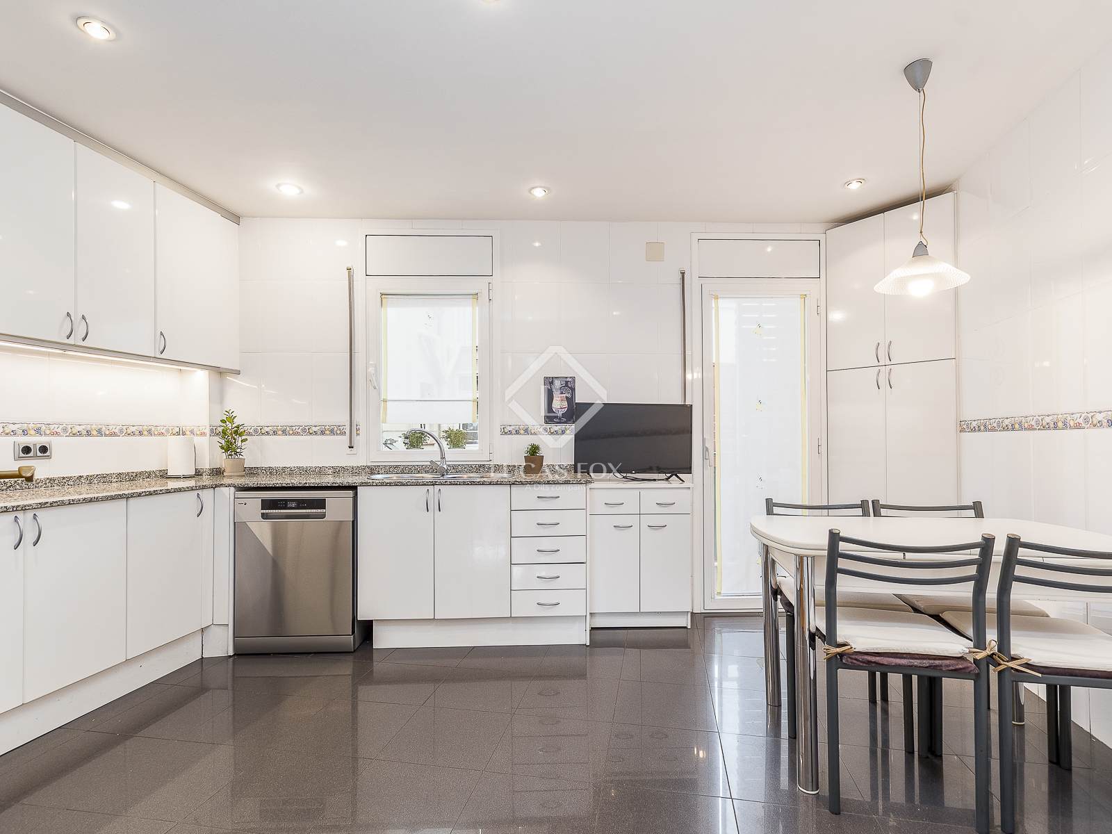 The fifth floor houses the day area , comprising a spacious and bright dining room living room of approximately 33 m² with direct access to a balcony. The separate, good-sized kitchen also has access to a second balcony. A guest toilet is also located on this floor . From this height, the views are completely unobstructed towards the Venetian Towers and Montjuïc mountain, providing a pleasant feeling of spaciousness and connection with the exterior.