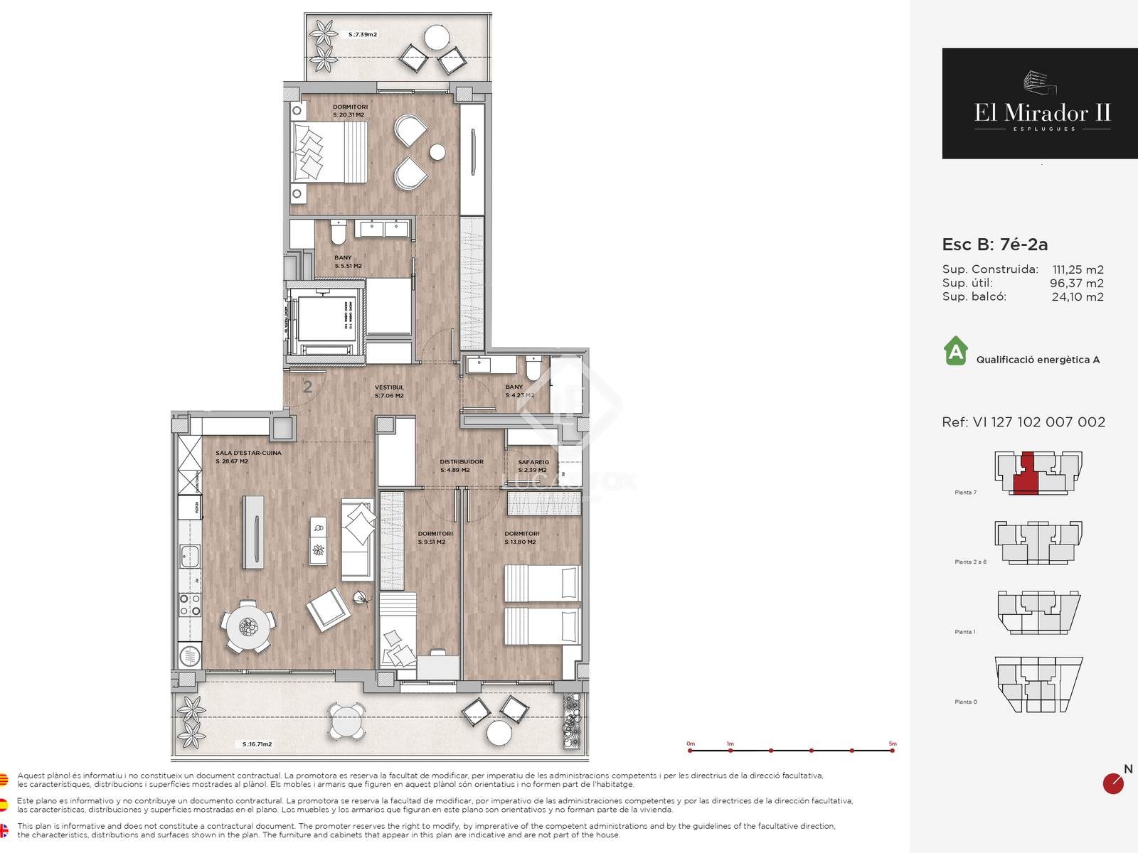 This apartment is located on the seventh floor and offers an interior surface area of 111 m² plus 24 m² of terrace space. The apartment features a living, dining and kitchen area with a terrace, 3 bedrooms and 2 bathrooms.
